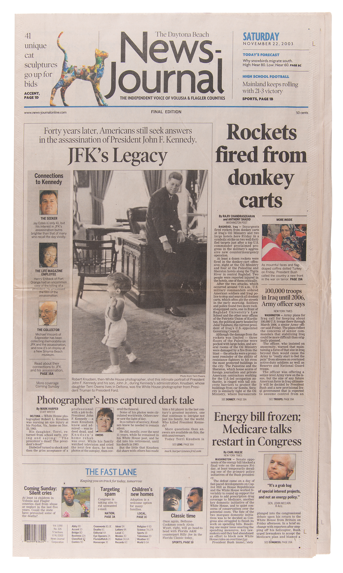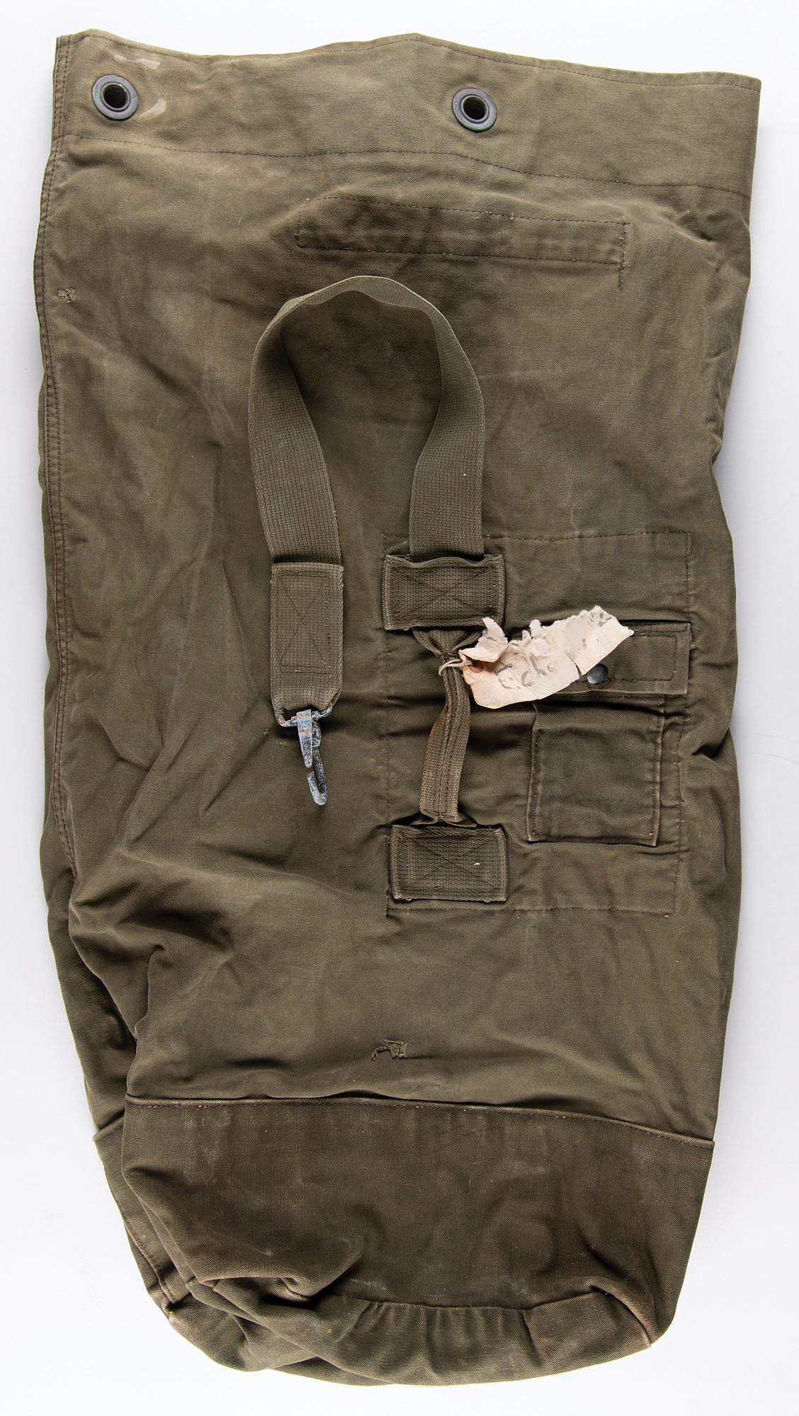 Accompanied by a letter of provenance from Kennedy collector Jay Estes, “I was on leave from the Marine Corps [in December of 1981]...I went to visit my Uncle and Aunt who lived close to Dallas. I decided to visit downtown. I happened to be near the School Book Depository [and] I noticed they were replacing part of the fence by the grassy knoll. I asked if I could have a piece of the fence. [They said] it was no problem because they were throwing it away. Knowing where the third shot might have come from, I took it from that area. When I was heading back to base days later, I had to cut part of the bottom to get it in the sea bag to be able to get it on the plane back to the Marine base. On the 40th anniversary of the assassination, a Daytona newspaper did an article about me.” Included with the fence picket is the referenced issue of The Daytona Beach News-Journal, which mentions the offered picket, and Estes’s original olive drab military bag.