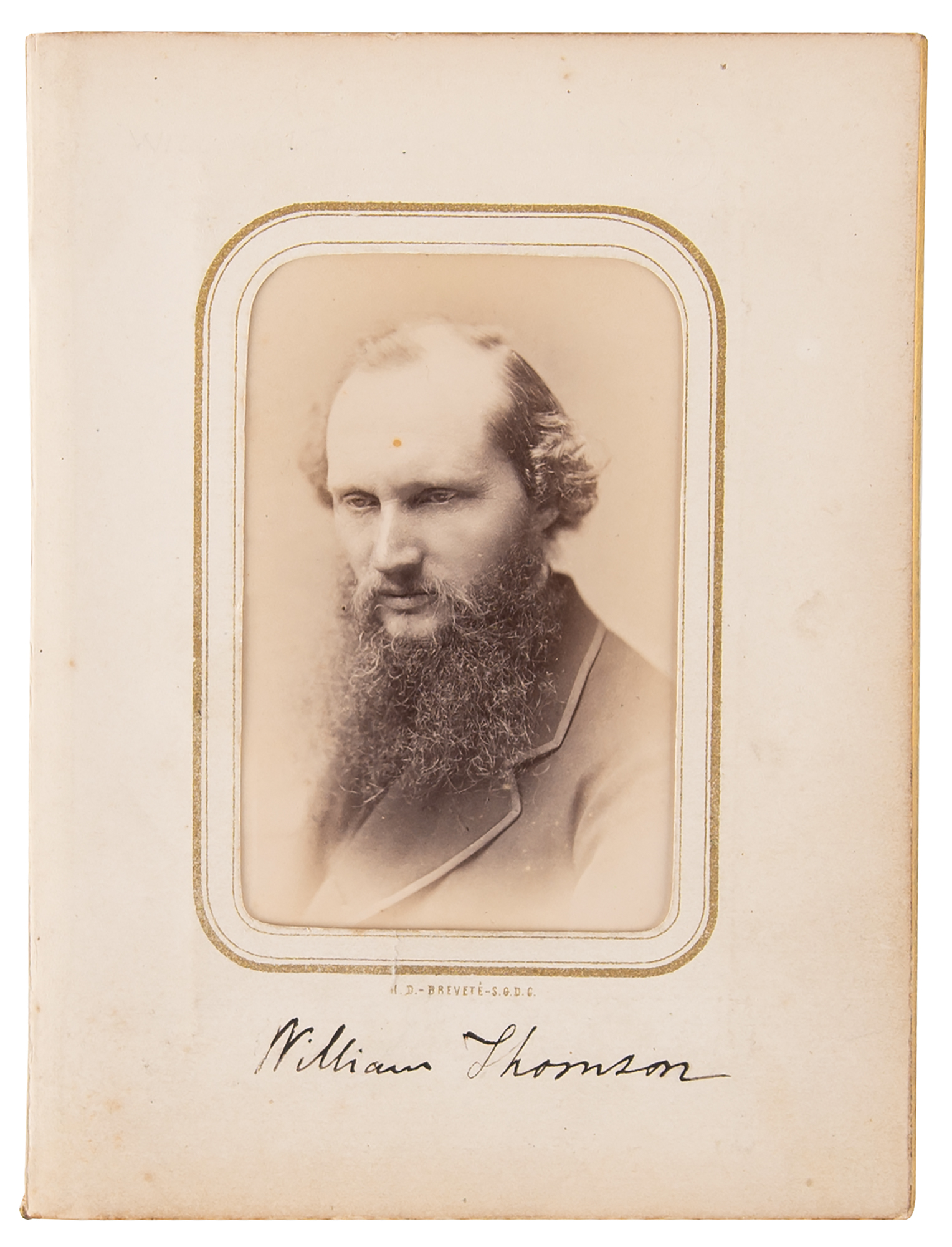British mathematical physicist and engineer (1824–1907) who, as the Professor of Natural Philosophy at the University of Glasgow for 53 years, did important work in the mathematical analysis of electricity and formulation of the first and second laws of thermodynamics, and did much to unify the emerging discipline of physics in its modern form. He received the Royal Society's Copley Medal in 1883, was its President between 1890–1895, and in 1892 was the first British scientist to be elevated to the House of Lords. Scarce carte-de-visite portrait of Lord Kelvin displayed in a 4.25 x 5.75 cardstock mat, signed on the mat in ink, "William Thomson." Reverse features the portrait of clergyman Norman Macleod, also signed in ink by Macleiod. In fine condition, with some faint soiling to the mat.
