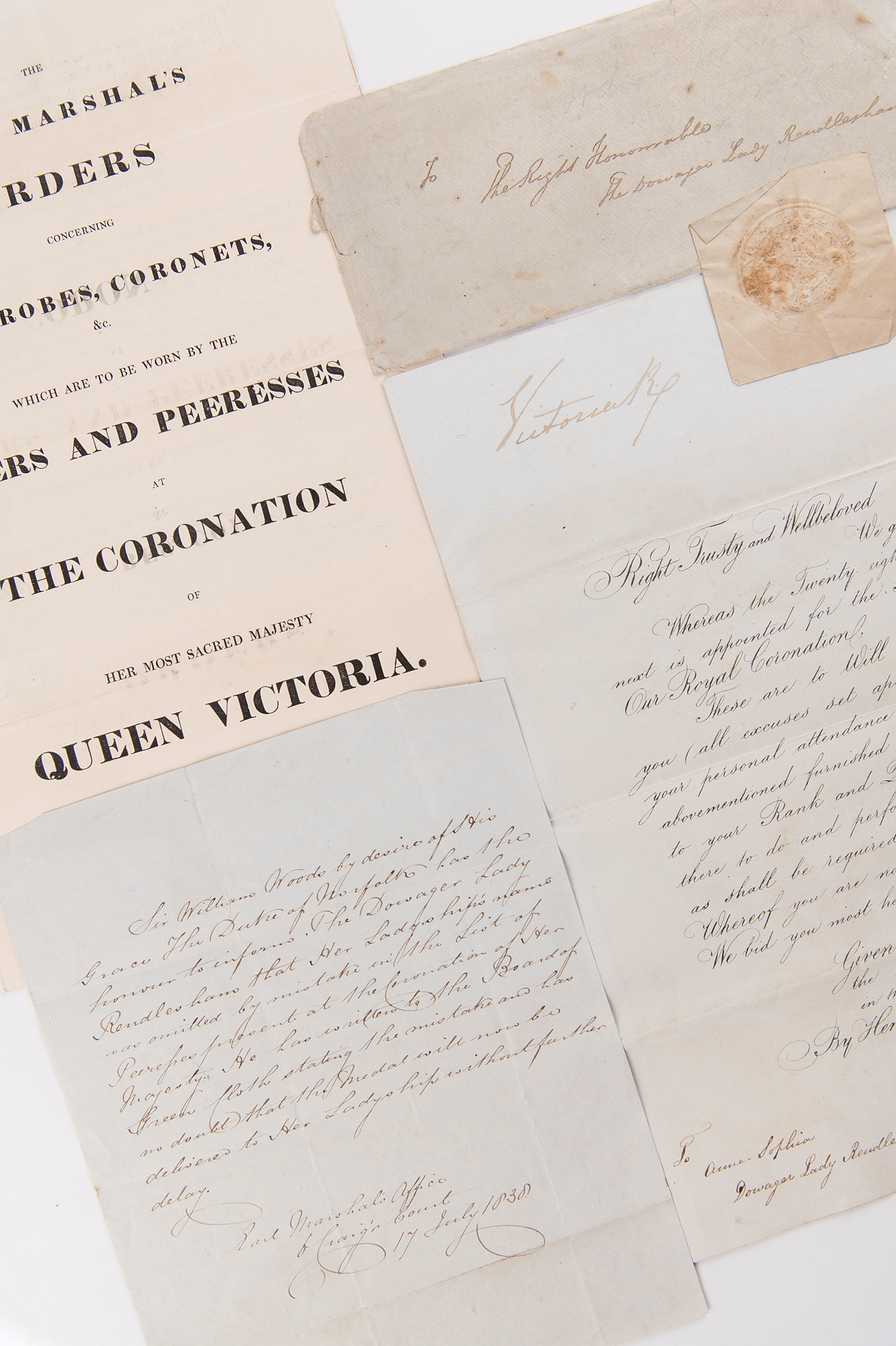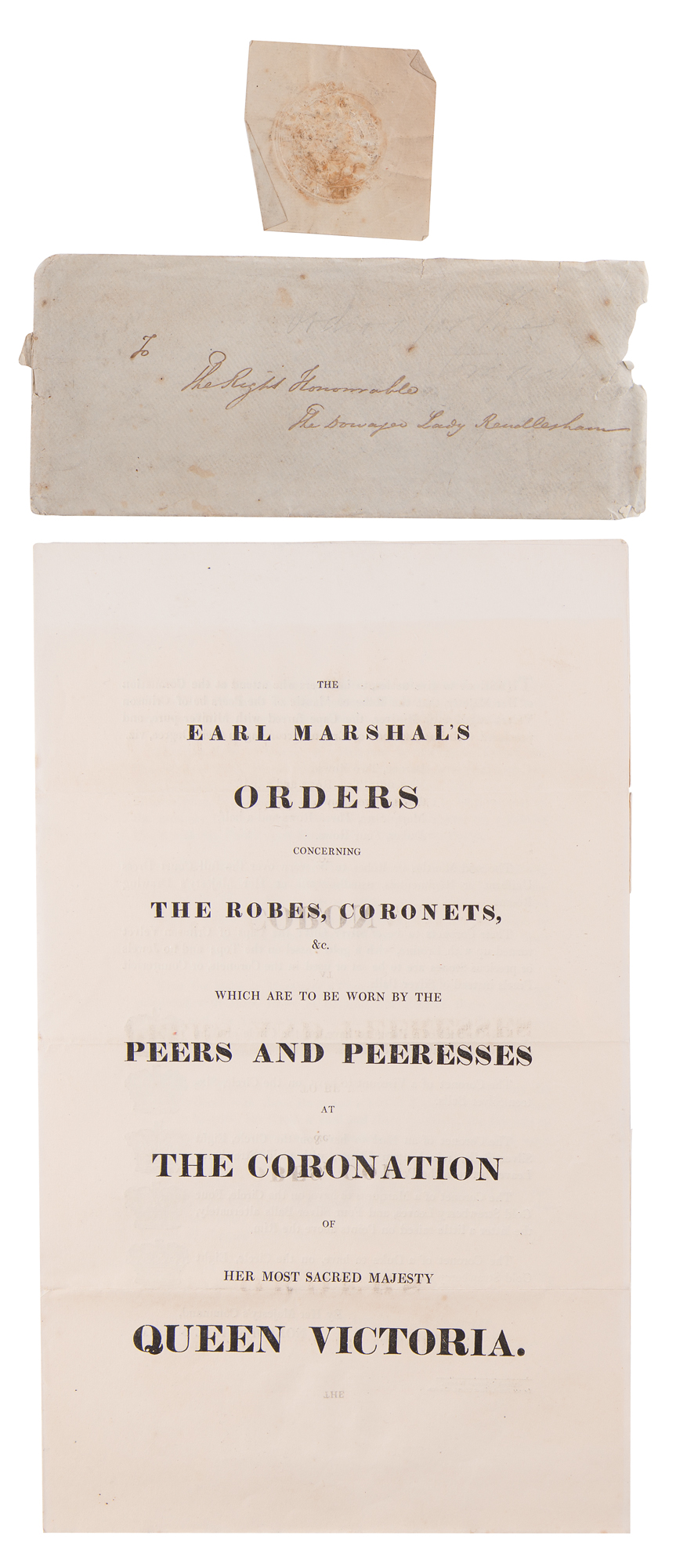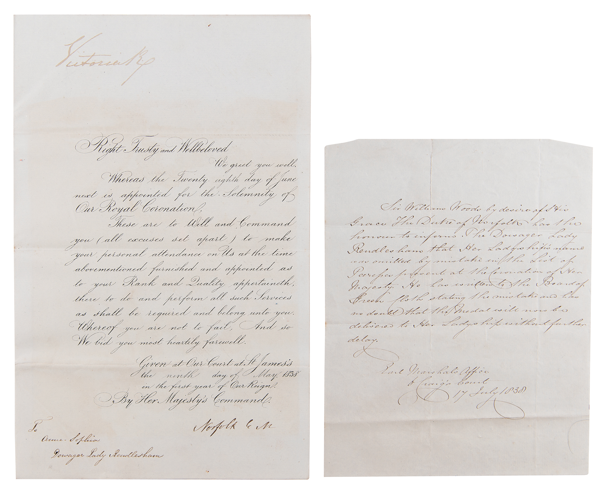 Rare material from the coronation of Queen Victoria sent to Anne-Sophia, Dowager Lady Rendlesham, including a signed invitation, a printed document pertaining to the dress of the attending peers and peeresses, and a letter apologizing for the erroneous omission of her name on a list of attendees. The printed invitation, signed at the head "Victoria R," is one page, 8 x 12.5, May 9, 1838, and reads, in part: "We greet you well. Whereas the Twenty eighth day of June next is appointed for the Solemnity of Our Royal Coronation. These are to Will and Command you (all excuses set apart) to make your personal attendance on Us at the time abovementioned furnished and appointed as to your Rank and Quality appertaineth, there to do and perform all such Services as shall be requited and belong unto you." Countersigned at the conclusion by the Earl Marshal, the Duke of Norfolk. Accompanied by the original envelope, with paper seal.
