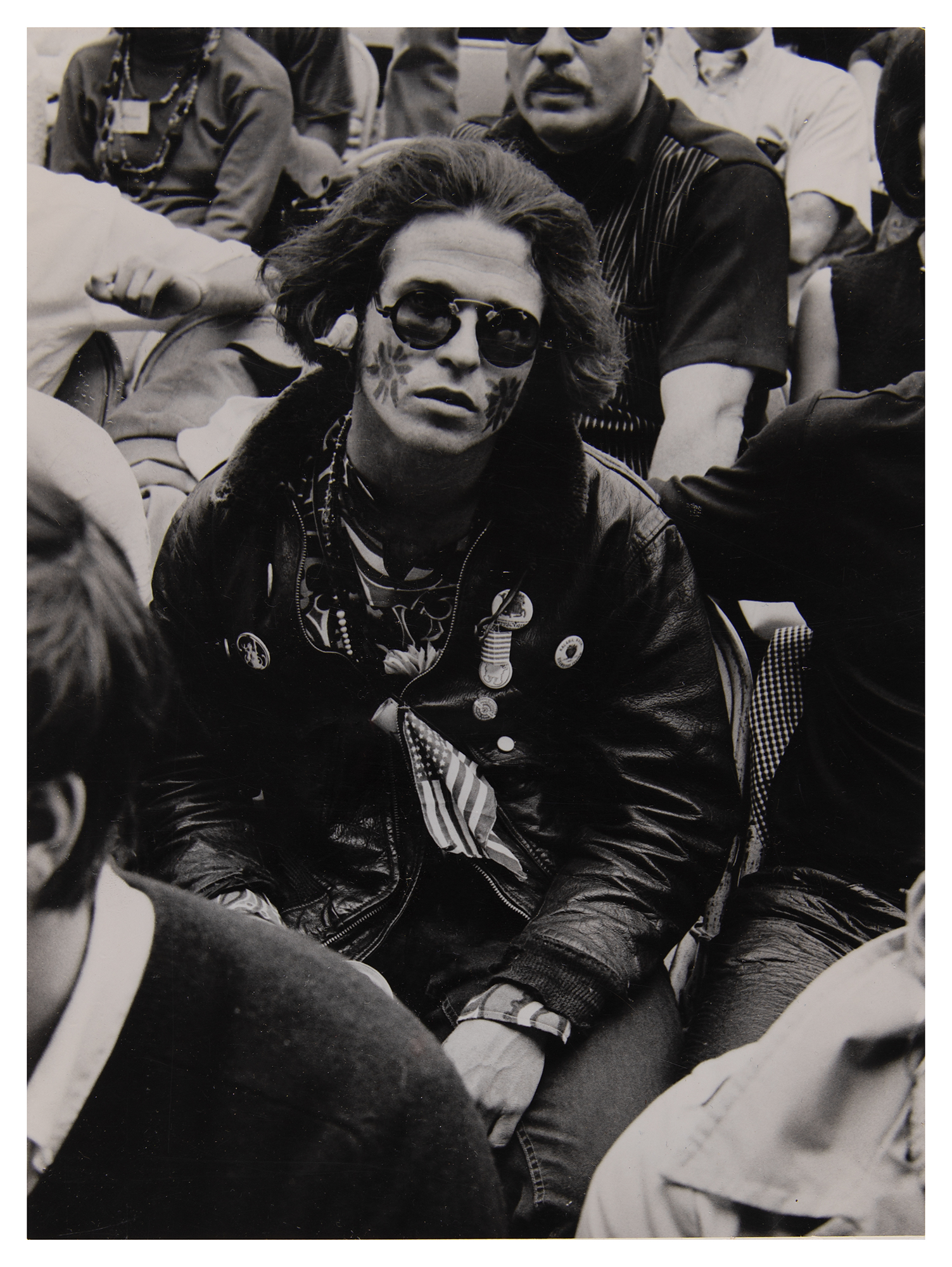 Original vintage glossy 7.25 x 10 silver gelatin photograph of Country Joe McDonald in the audience at the Monterey International Pop Festival taken by photographer Peter Martin, showing the psychedelic rocker clad in the eclectic fashion of the era—round sunglasses, a leather jacket adorned with pins, patterned shirt, face paint, and necklaces. In fine condition, with adhesive residue on the reverse.