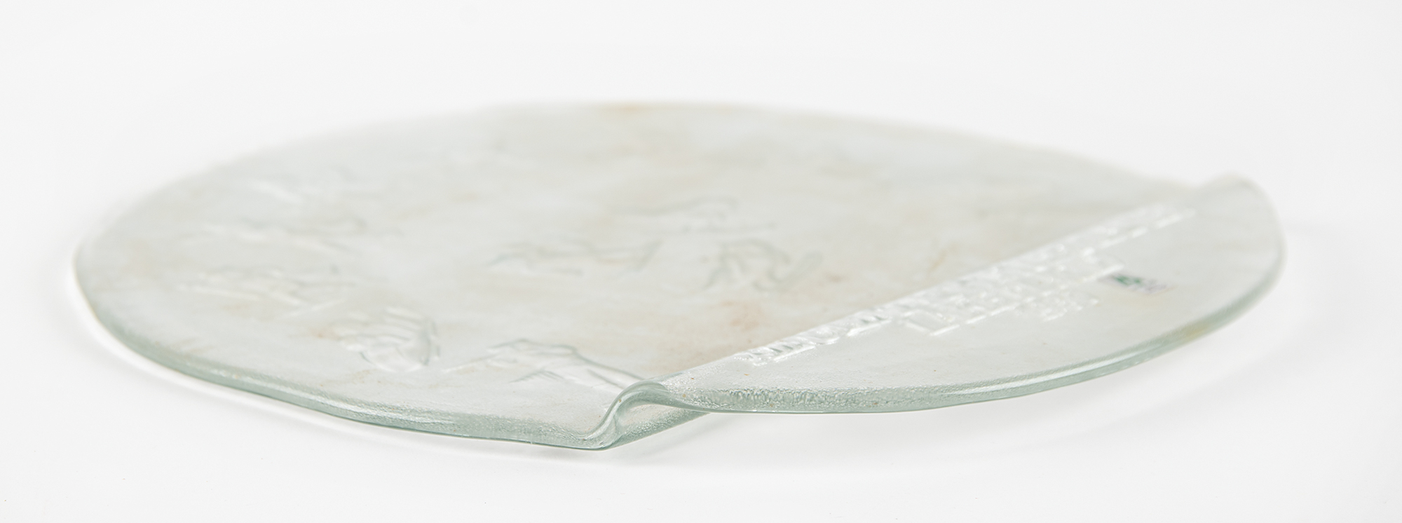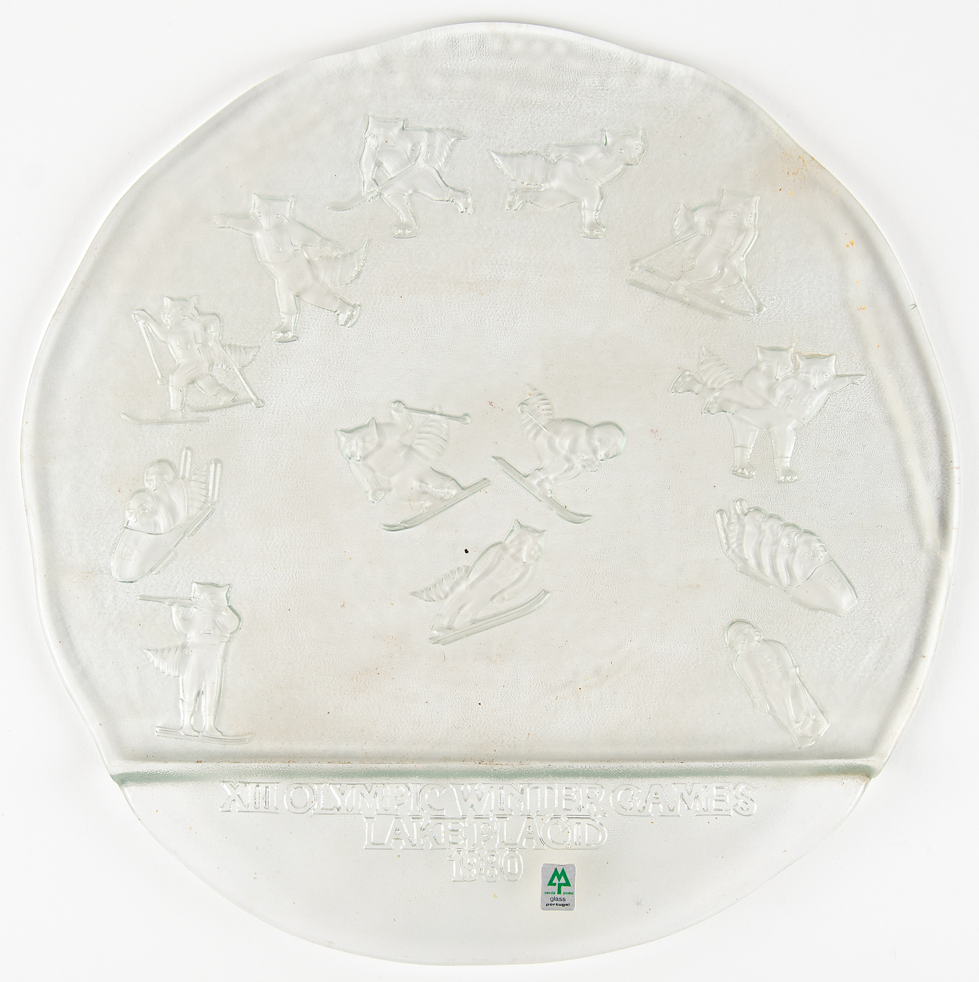 Attractive commemorative glass plate from the Lake Placid 1980 Winter Olympics, 13.75˝ in diameter, which features 13 back-engraved pictograms of mascot Roni the raccoon performing the various sporting events, with the lower shelf section featuring the text: “XIII Olympic Winter Games, Lake Placid, 1980.” Made by Verde Pinho of Portugal. Includes its original wooden crate, with one side marked: “Officially licensed product of the 1980 Olympic Winter Games, lake placid olympic organizing committee, made expressly for CAOS MARKETING, INC., by VERDE PINHO, portugal.” In fine condition.