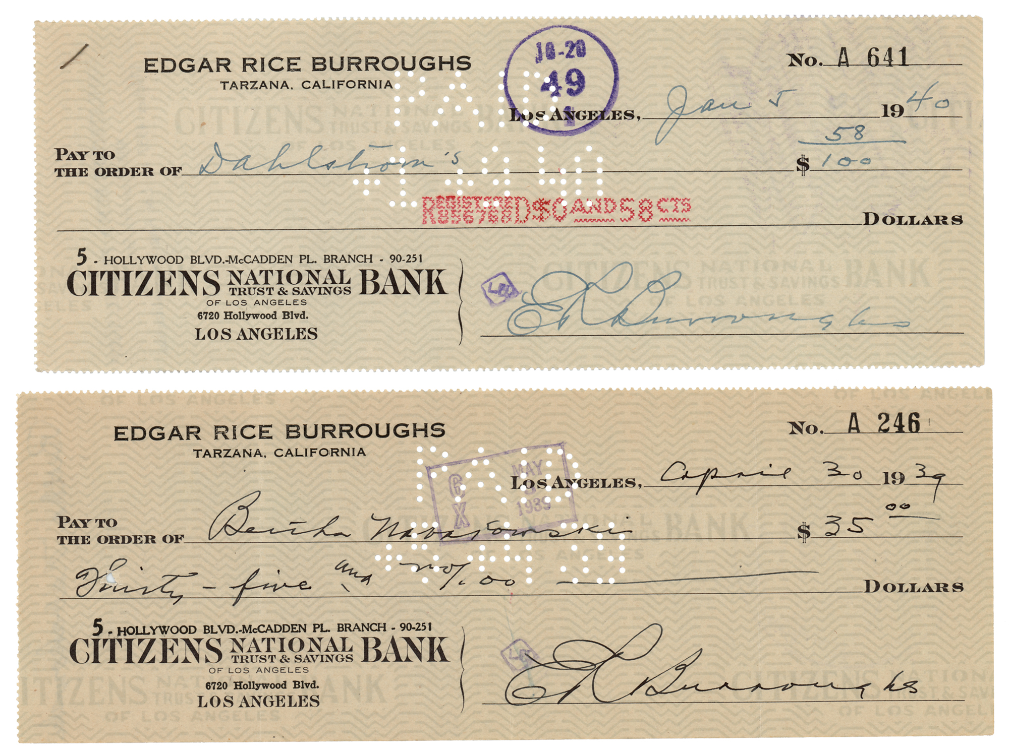Two checks: a personal check, 8.5 x 3, filled out and signed by Burroughs, "E. R. Burroughs," payable to Bertha Nabakowski for $35, April 30, 1939; and a personal check, 8.5 x 3, filled out and signed by Burroughs, "E. R. Burroughs," payable to Dahlstrom's for $0.58, January 5, 1940. In overall fine condition.
