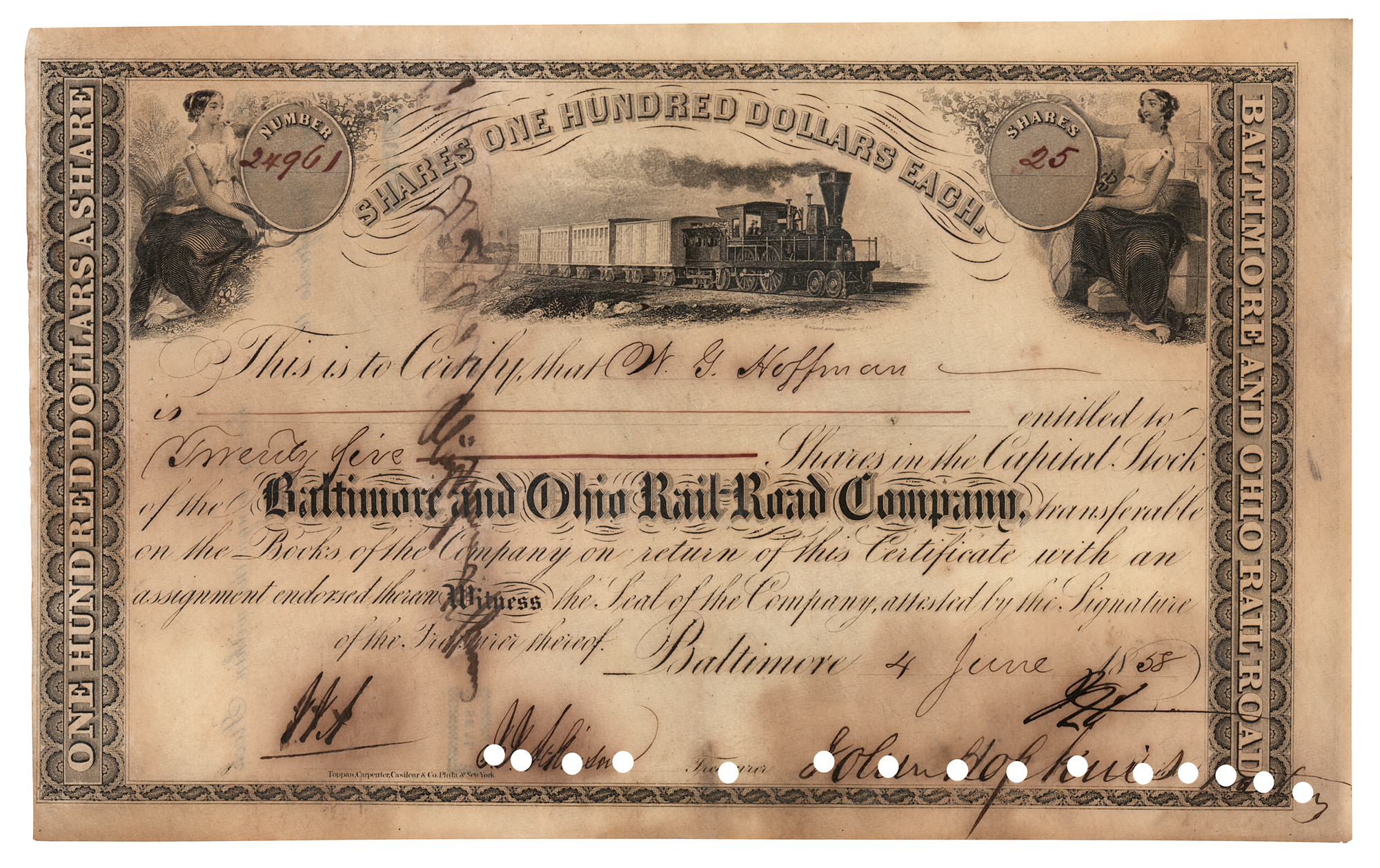 American entrepreneur, abolitionist and philanthropist (1795–1873) whose legacy lives on in numerous foundations and institutions, such as Johns Hopkins Hospital and Johns Hopkins University. Partly-printed DS, one page, 10 x 6.25, June 3, 1858. Stock certificate for 25 shares in the Baltimore and Ohio Rail-Road Company issued to W. G. Hoffman, signed at the conclusion by Johns Hopkins as the company's president pro tempore. The certificate features a handsome vignette of a locomotive. In very good to fine condition, with light overall wrinkling and dampstaining, and the usual cancellation holes through Hopkins' signature.