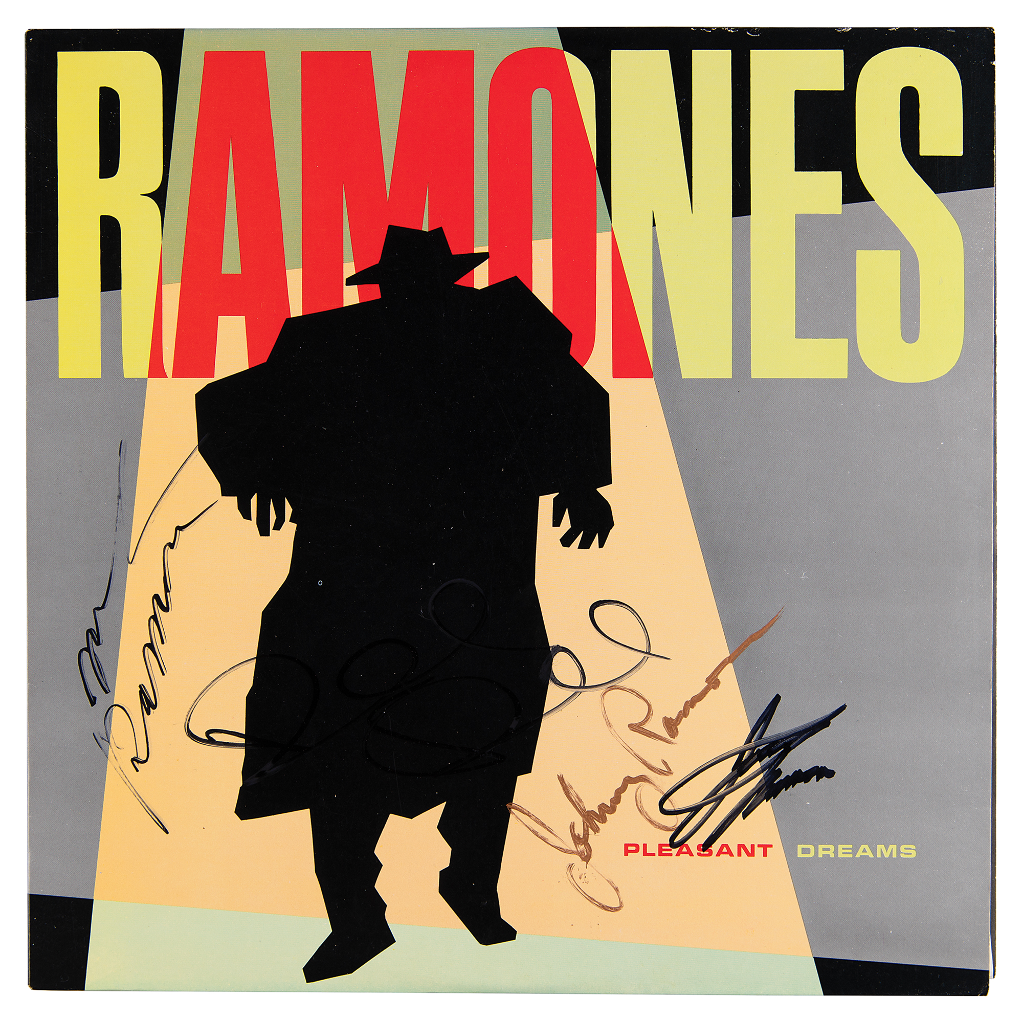 Pleasant Dreams album by the Ramones, signed on the front cover in black felt tip by Joey, Dee Dee, and Marky Ramone, and in gold ink by Johnny Ramone. In fine condition, with poor contrast to much of Dee Dee's signature. The record is included.