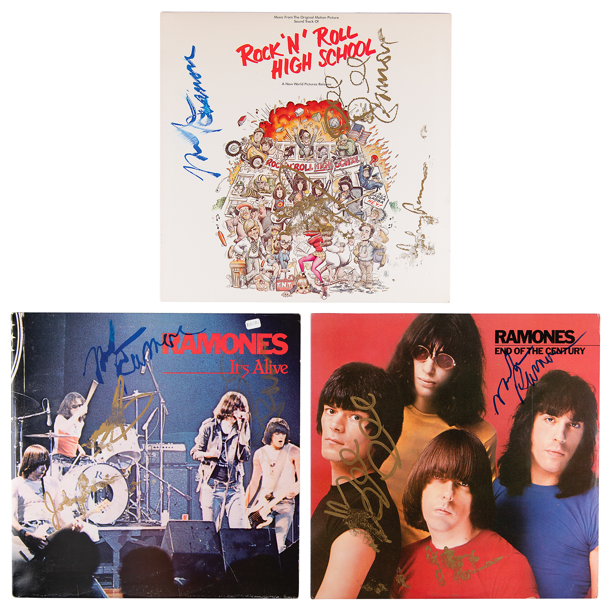 Three albums by the Ramones—End of the Century, It's Alive, Rock ‘N’ Roll High School—each signed in gold ink and blue felt tip by Joey, Johnny, Dee Dee, and Marky Ramone. In overall very good to fine condition, with heavy smudging to Johnny's and Joey's signatures on all three. The records are included.