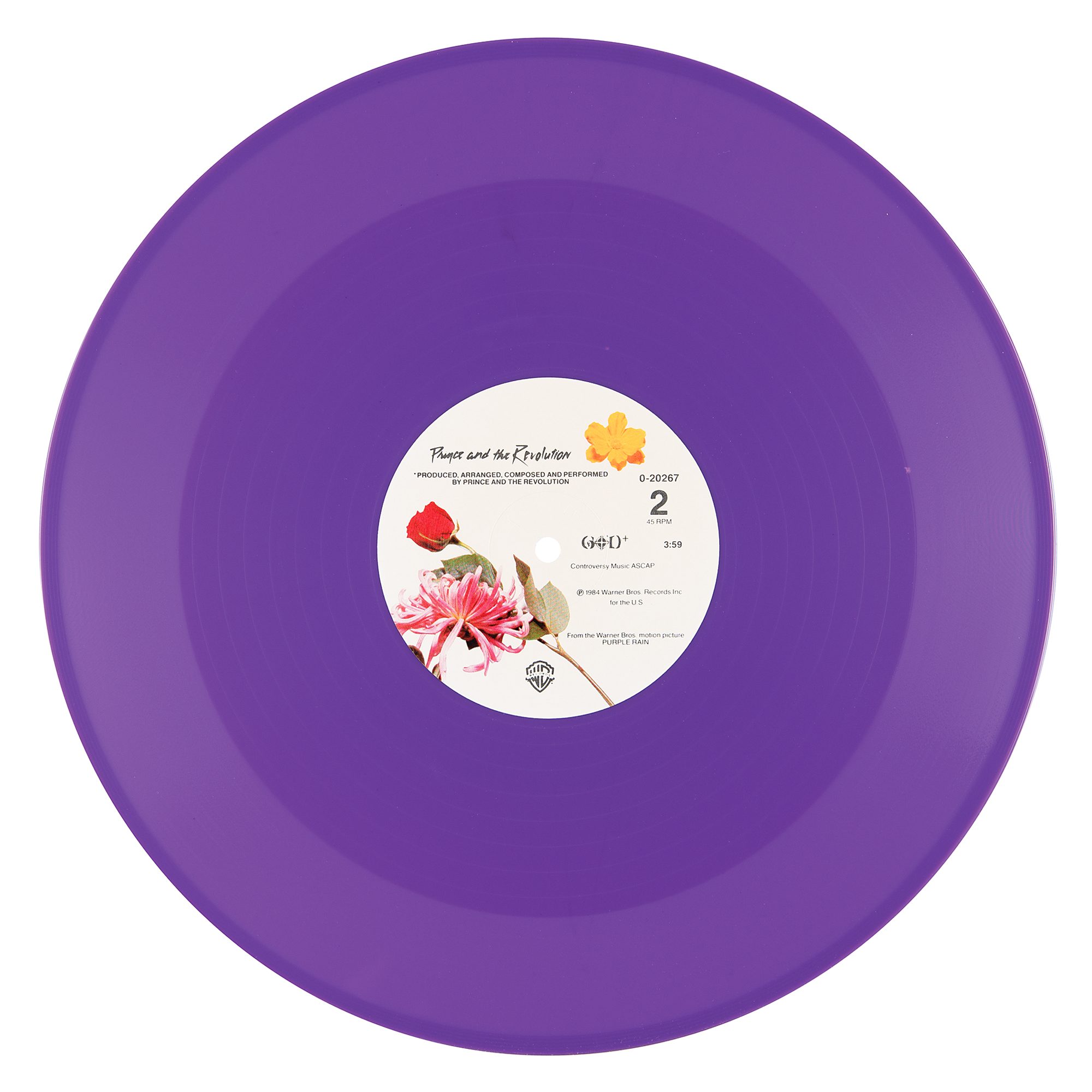 Limited edition Warner Bros. 12-inch ‘purple vinyl’ maxi-single for ‘Purple Rain / God’ by Prince and the Revolution, with purple triangle hype sticker on shrink wrap: “Limited Edition, Pressed on Purple Vinyl (0-20267).” In very fine condition. The record is included.