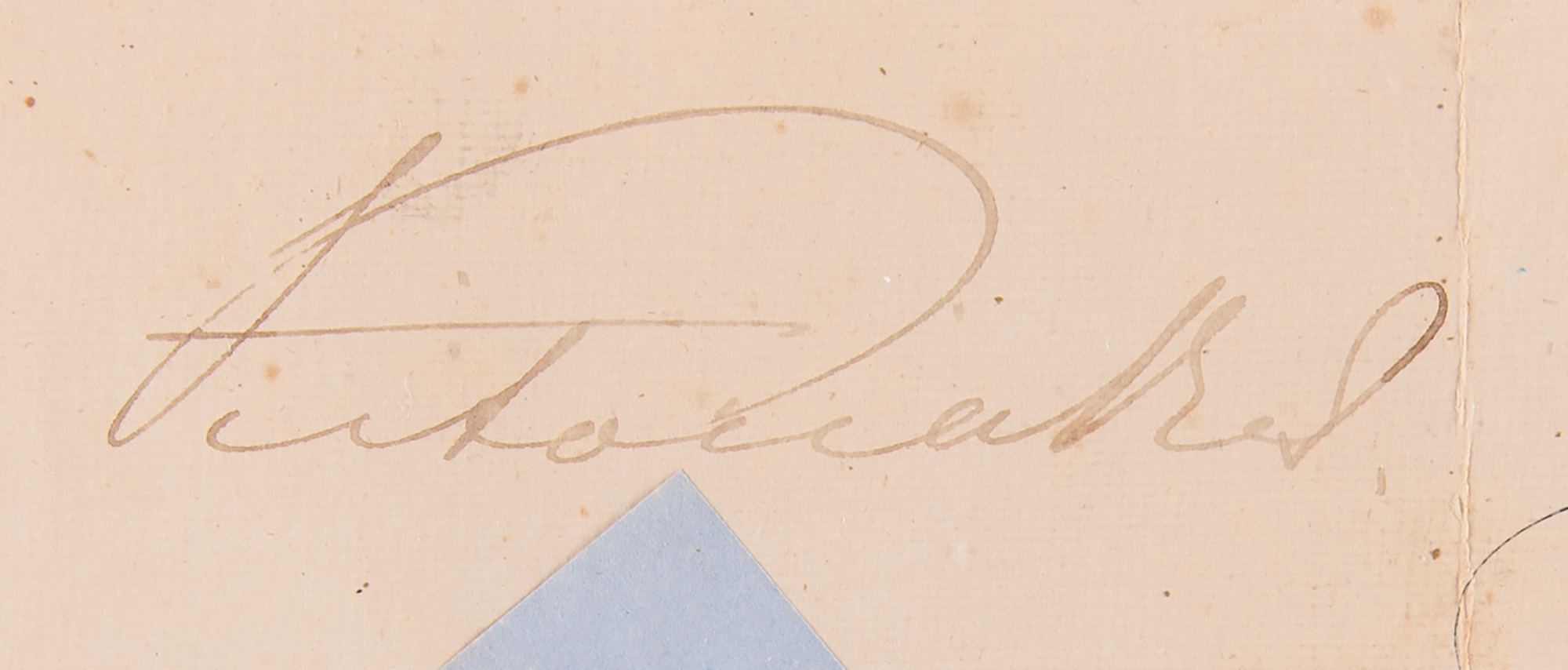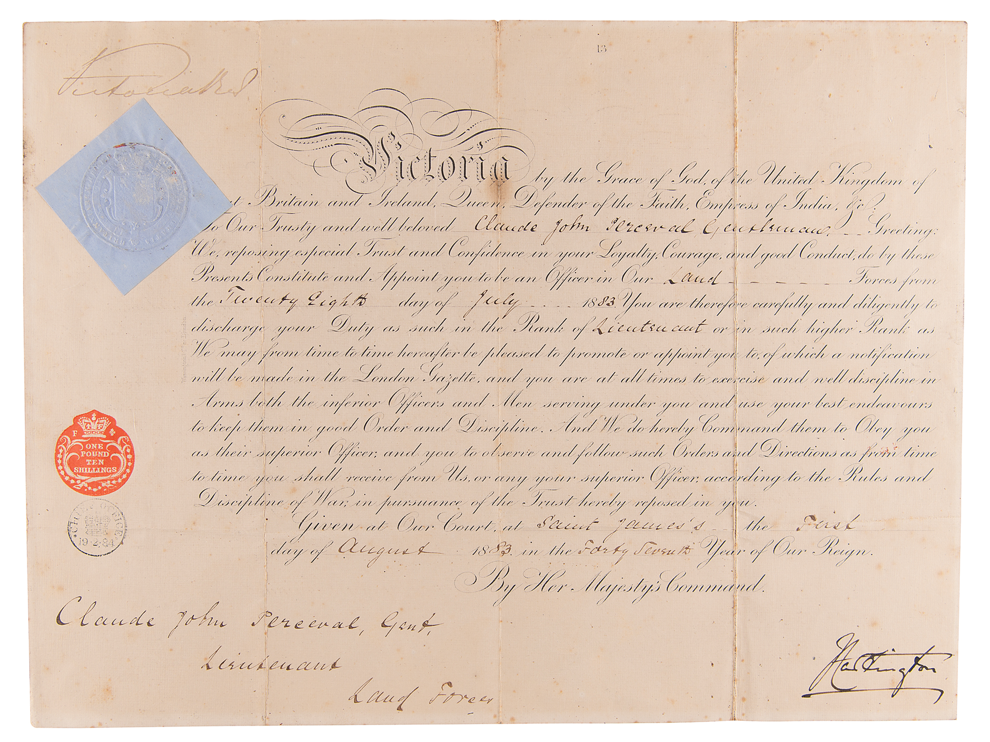 Partly-printed DS, signed “Victoria R. I.,” one page, 16 x 12, August 1, 1883. The queen appoints Claude John Perceval as “an Officer in Our Land Forces…in the Rank of Lieutenant.” Signed nicely in the upper left corner by Queen Victoria. The embossed blue seal affixed to the left side remains intact. In fine condition, with scattered light foxing, and a small stain to the central vertical fold.
