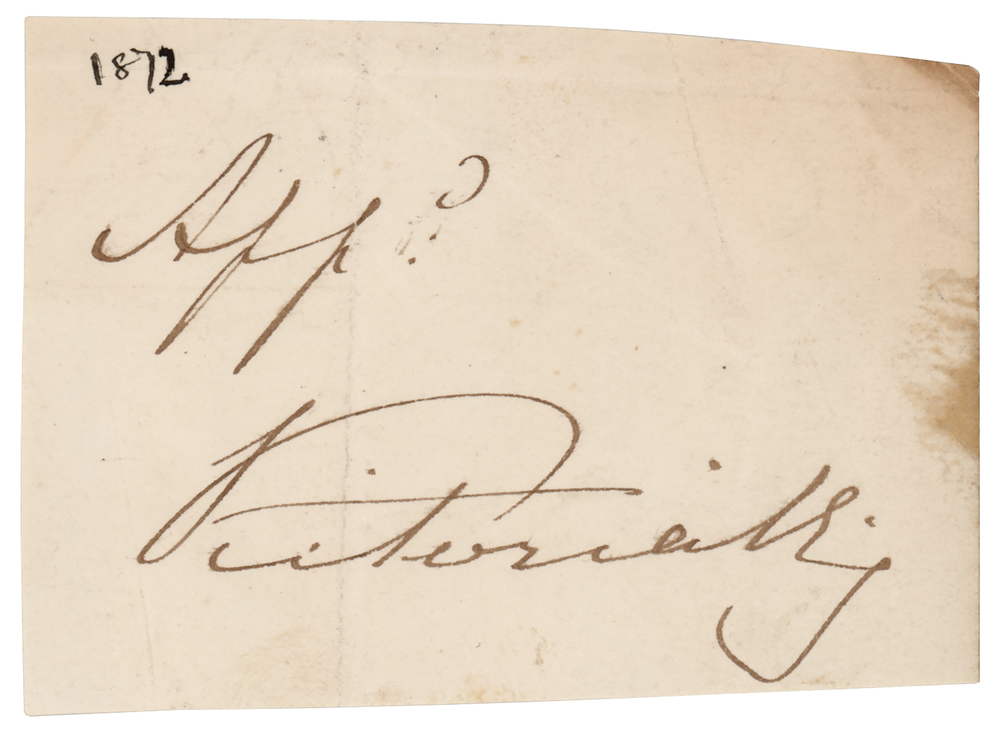 Ink signature of Queen Victoria, "App'd Victoria R.,” on an off-white 3.75 x 2.75 sheet clipped from a document, with a collector's hand dating the signature to 1872. In very good to fine condition, with light creasing, a stain to the right edge, and a vertical fold passing through the signature.