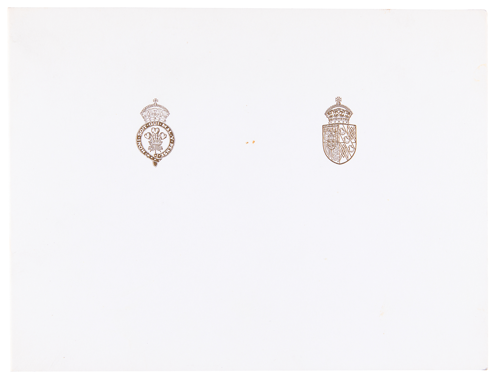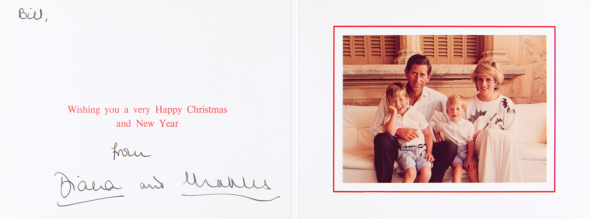 Royal Christmas card from 1987 embossed on the front with the Prince of Wales’s feathers and Order of the Garter motto and the Spencer family arms, measuring 16 x 6 open, featuring an affixed color photo of the royal couple posing with their young sons William and Harry, signed and inscribed in fountain pen, "Bill, from Diana" and "and Charles." In very fine condition. An uncommon signed Christmas card, examples of which are typically inscribed by Charles.