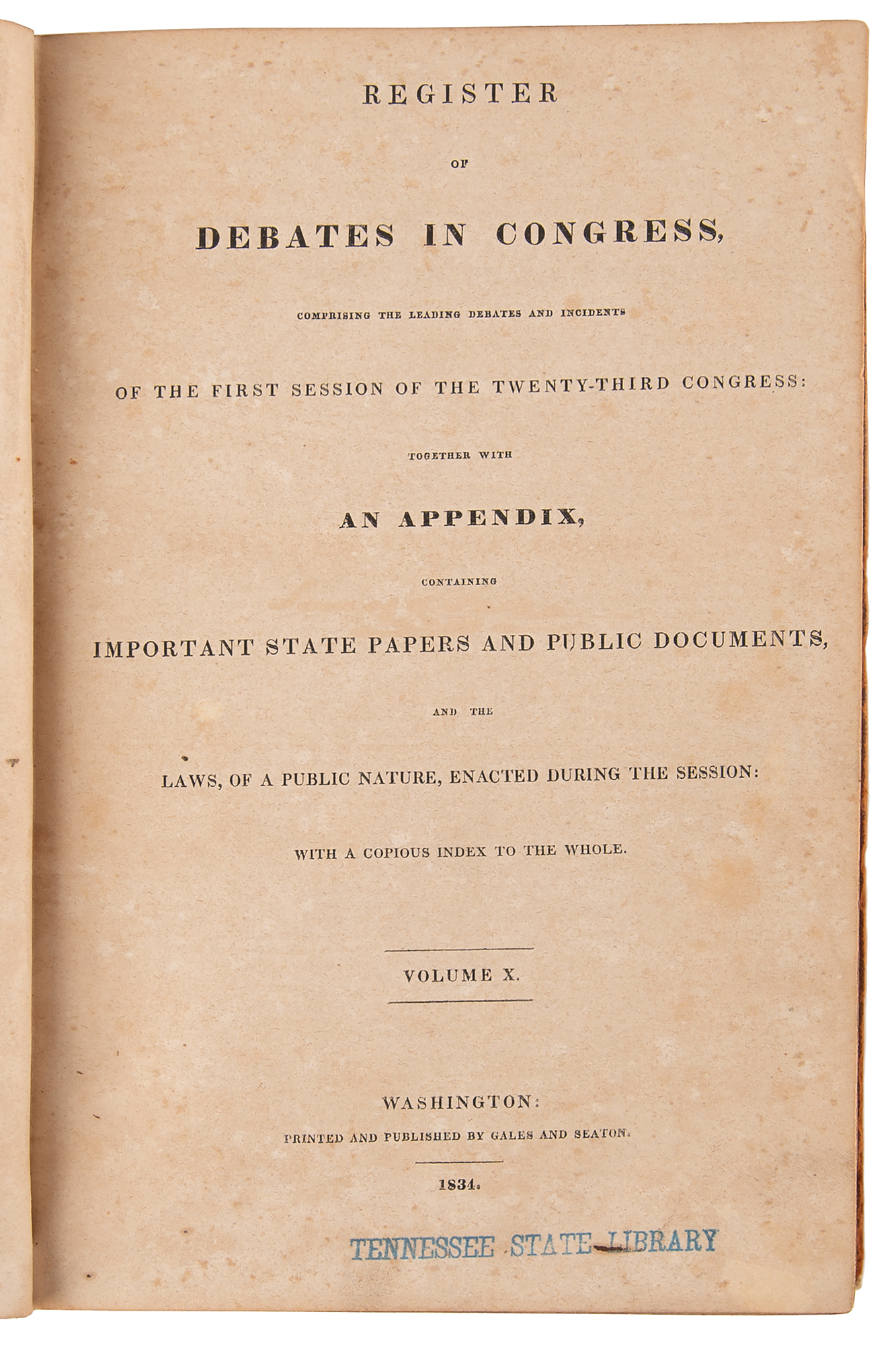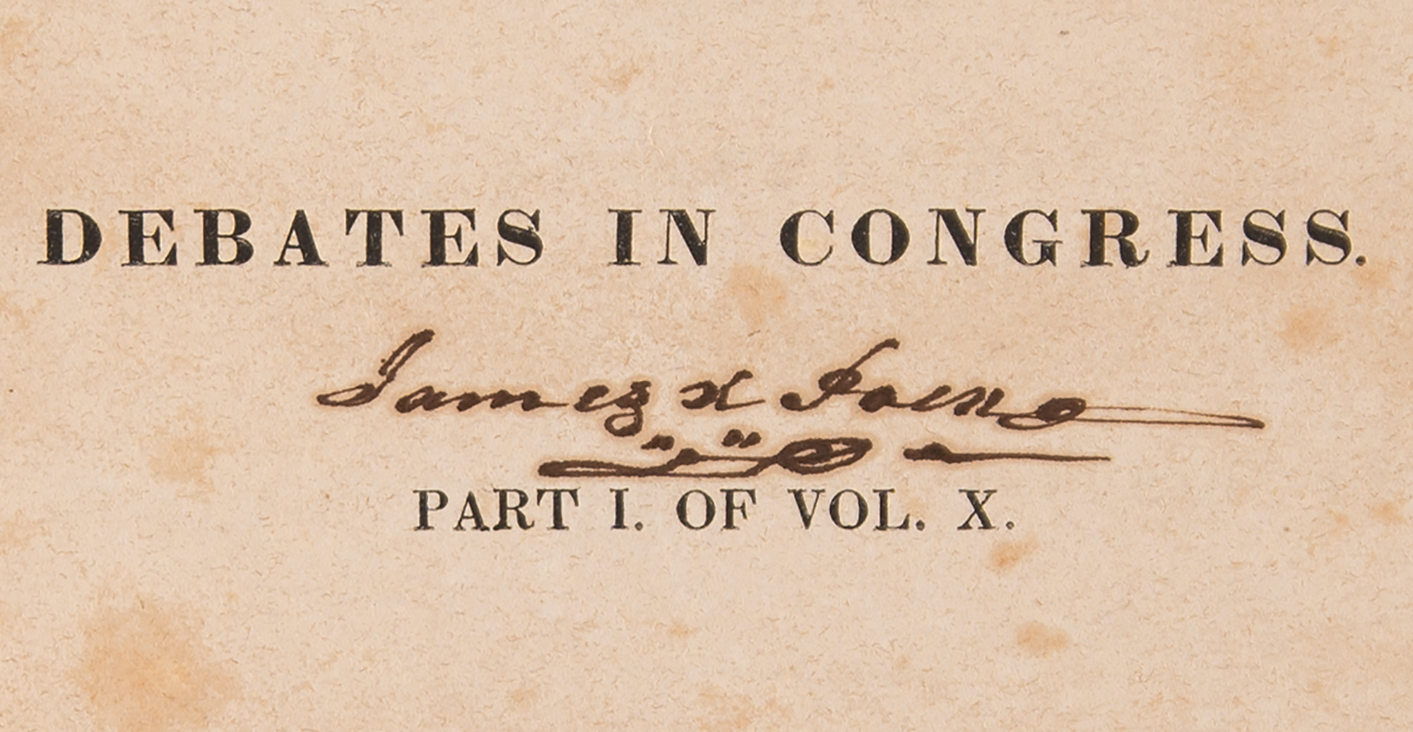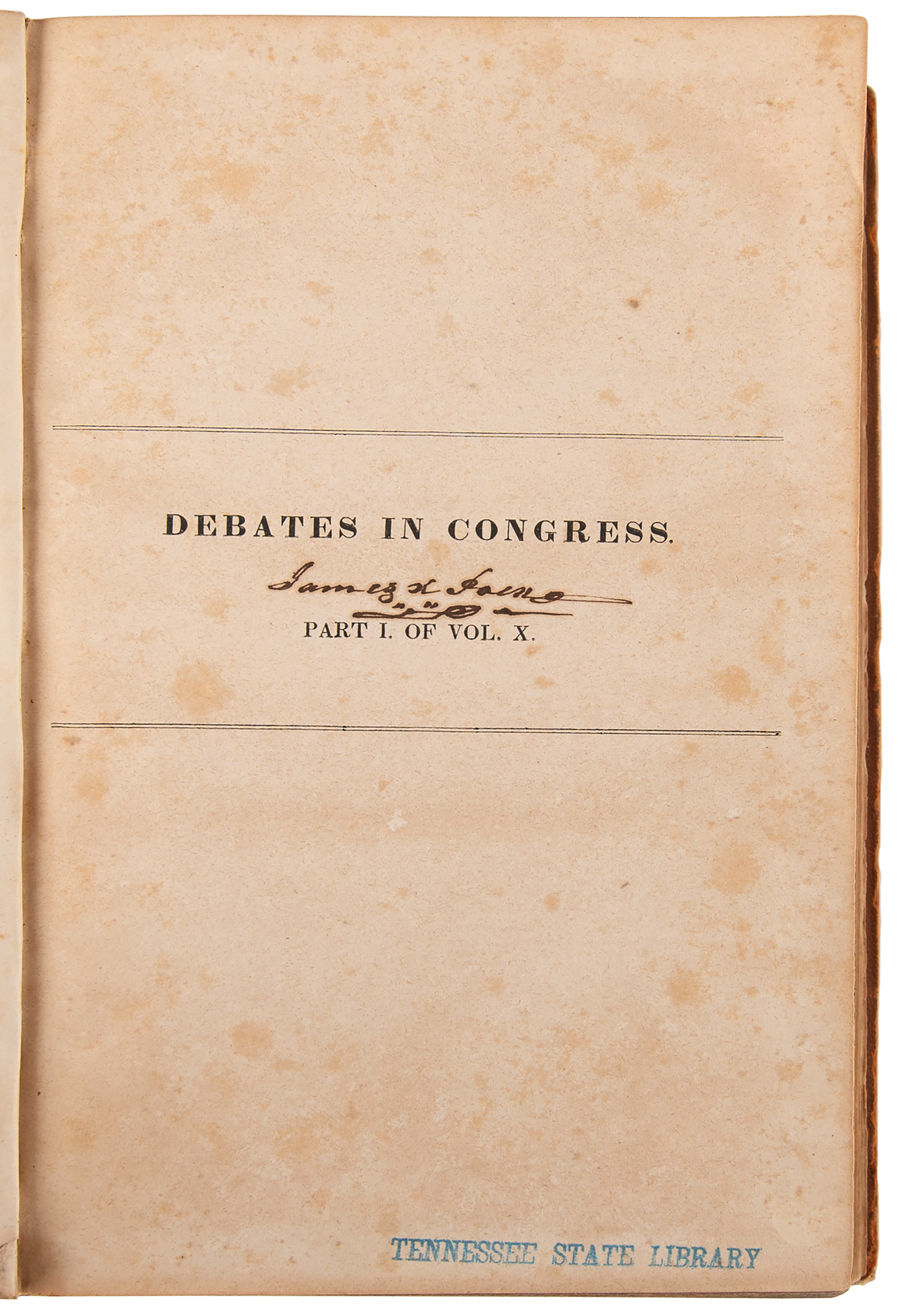 Signed book: Debates in Congress, Part I of Vol. X. Washington, DC: Gales and Season, 1834. Leatherbound hardcover, 6.75 x 10, 1391 pages. Signed on the half-title page in ink with his ownership signature, "James K. Polk." Autographic condition: very good to fine, with foxing and toning to the signed page, as well as a Tennessee State Library stamp to its bottom edge. Book condition: G/None, with heavy wear and scuffing to exterior, rebacked spine with losses to the title label, reinforced joints, and some mottled foxing to textblock; the binding remains tight, and Polk's autograph remains crisp and bold.