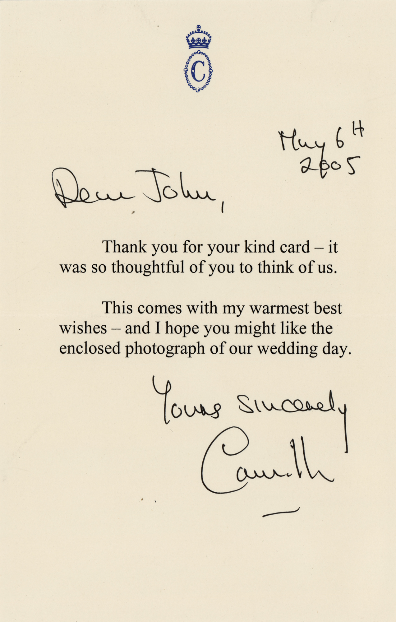 TLS signed “Yours sincerely, Camilla,” one page, 4.75 x 7.5, personal letterhead, May 6, 2005. Letter to John Dimauro, in full: “Thank you for your kind card—it was so thoughtful of you to think of us. This comes with my warmest best wishes—and I hope you might like the enclosed photograph of our wedding day.” Camilla adds the date and salutation in her own hand. In very fine condition. Accompanied by the original mailing envelope.