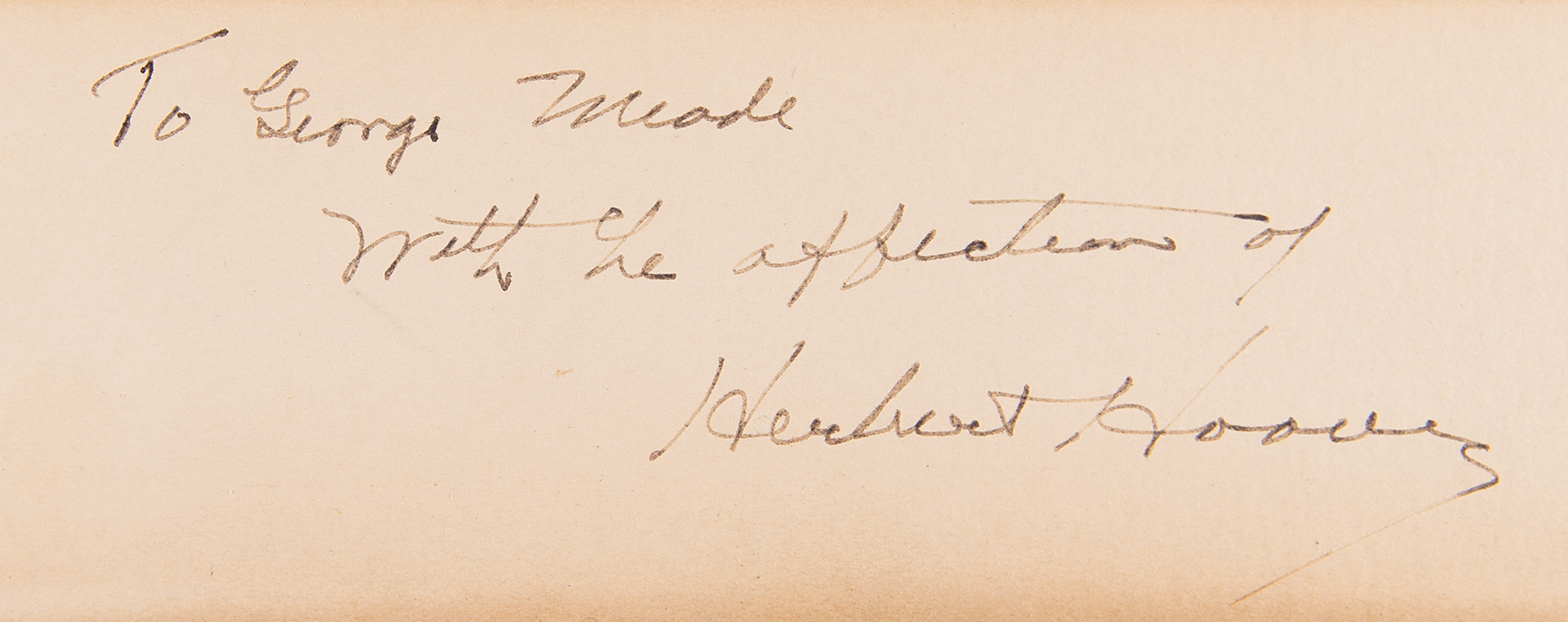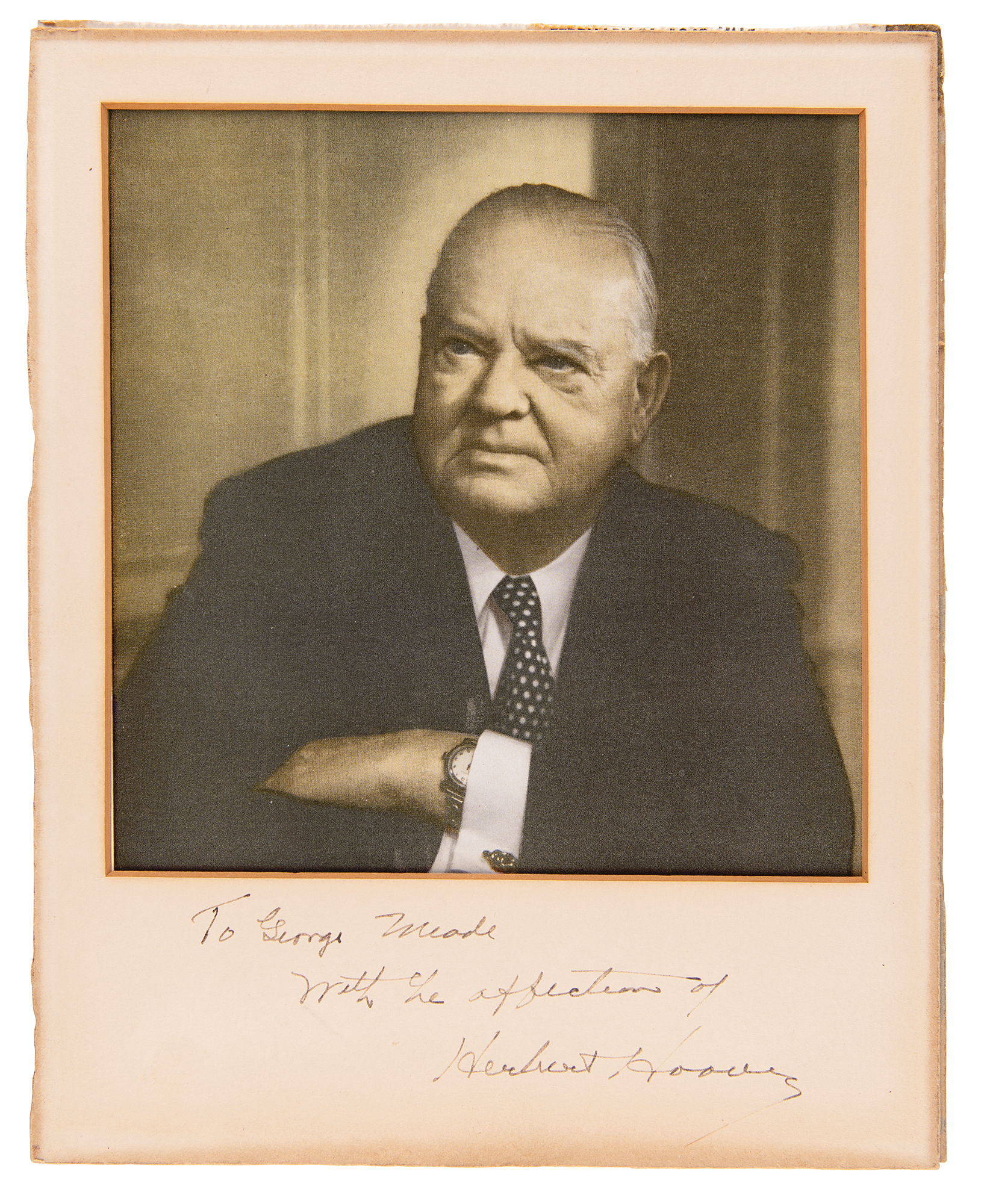 Vintage color 6.5 x 6.75 book photo portrait of Herbert Hoover by Yousuf Karsh, matted to an overall size of 8 x 10, signed and inscribed on the mat in black ink, "To George Meade, with the affection of Herbert Hoover.” In very good to fine condition, with toning from prior display. The recipient, George Meade, who was the great-grandson of George G. Meade, the famed Union Commander at Gettysburg, was best known for being chosen by Dwight D. Eisenhower, along with R. E. Lee IV, to command the forces at the 100th anniversary celebration at Gettysburg in 1963.