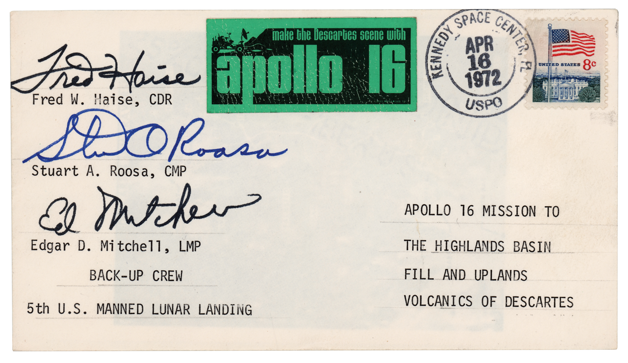 Uncommon Apollo 16 ‘launch date’ cover with an affixed green “Make the Descartes Scene with Apollo 16” label, postmarked at the Kennedy Space Center on April 16, 1972, signed in blue and black felt tip by the Apollo 16 backup crew: Fred Haise, Stuart A. Roosa, and Edgar Mitchell. In fine condition.
