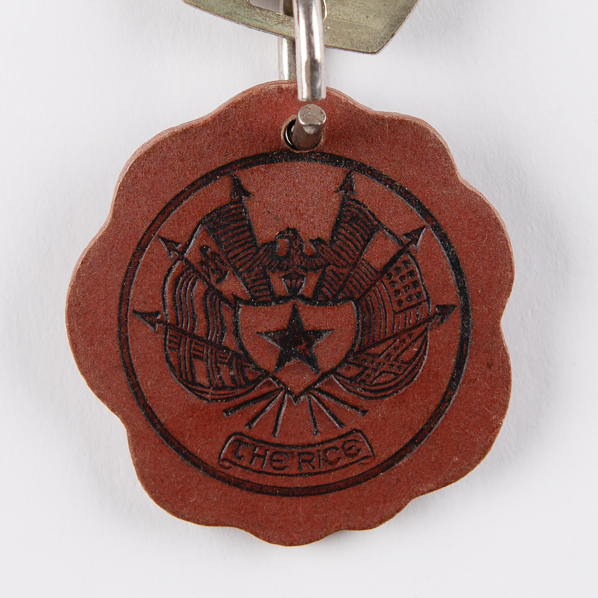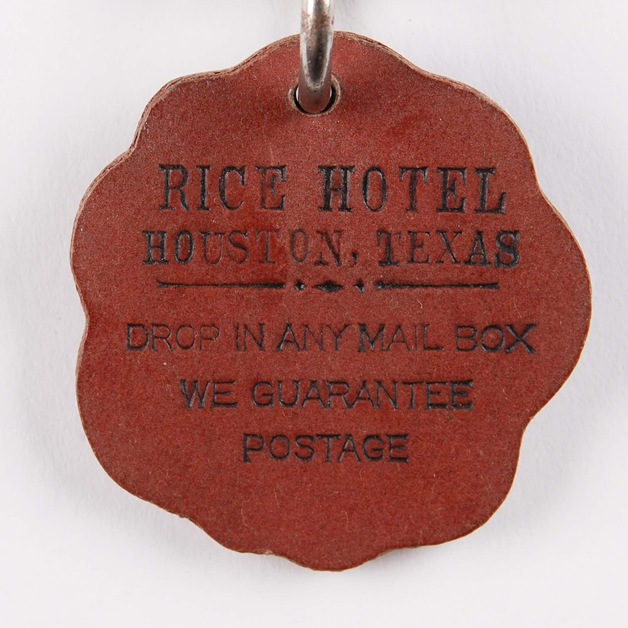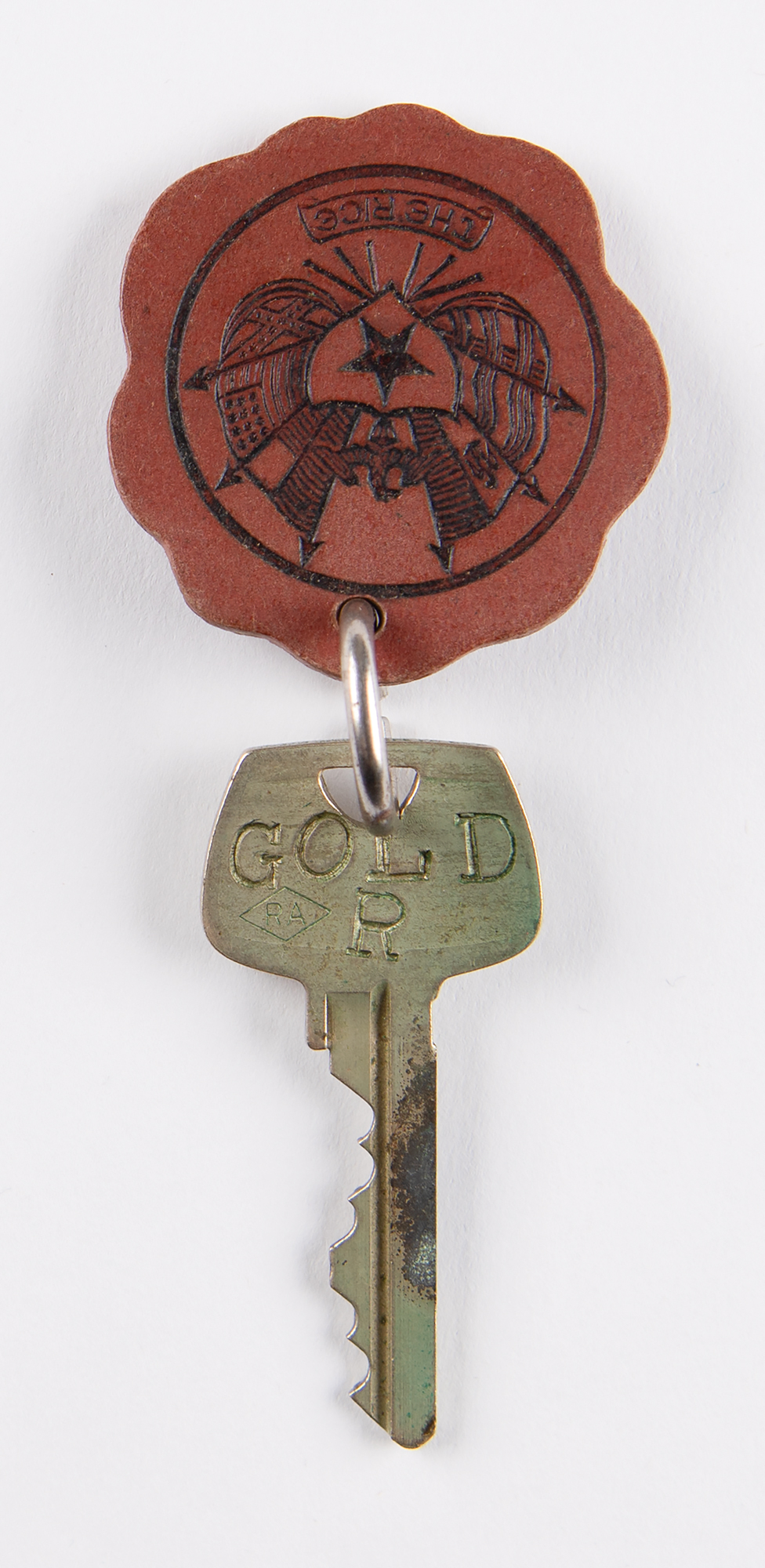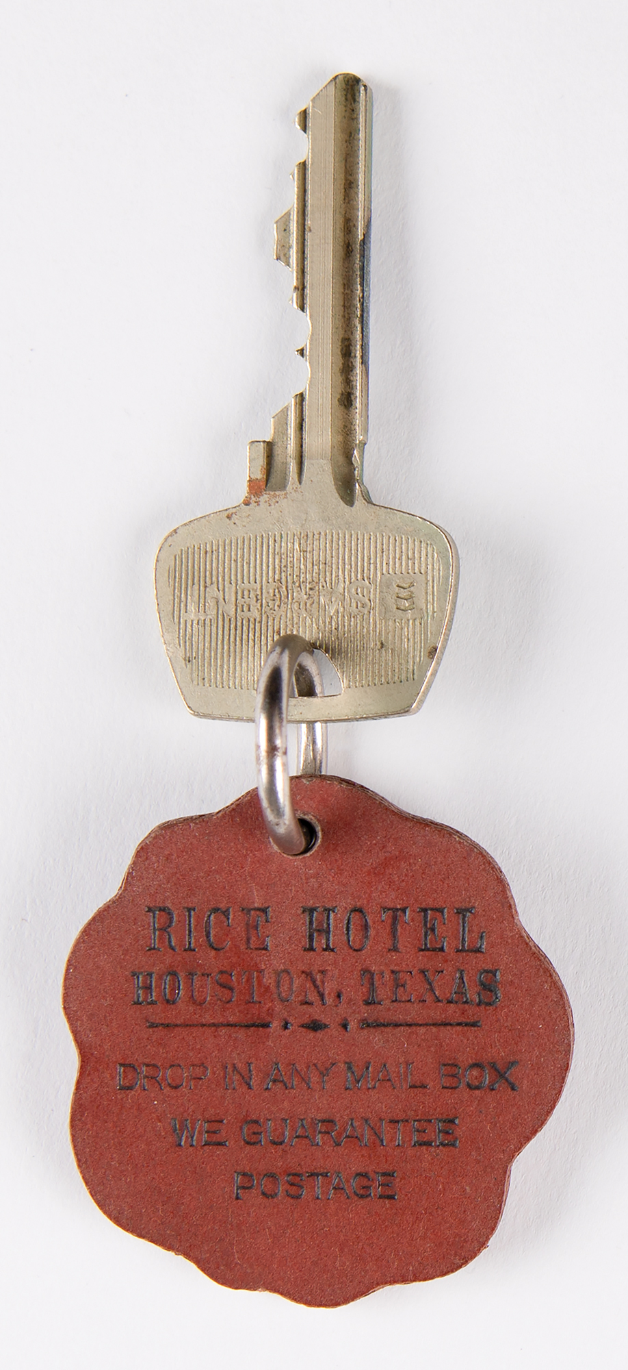 Original door key for the ‘Gold Suite’ in the famed Rice Hotel in Houston, Texas, the sixth-floor room used by Vice President Lyndon B. Johnson when he and President John F. Kennedy visited the hotel to attend a League of United Latin American Citizens dinner on the evening of November 21, 1963, the night before JFK was assassinated in Dealey Plaza in downtown Dallas. The Sargent key is engraved “Gold R” on the right side of the head, and includes its original wooden key tag, with one side etched: “Rice Hotel, Houston, Texas / Drop In Any Mail Box, We Guarantee Postage.” The reverse bears the hotel emblem. In fine condition.