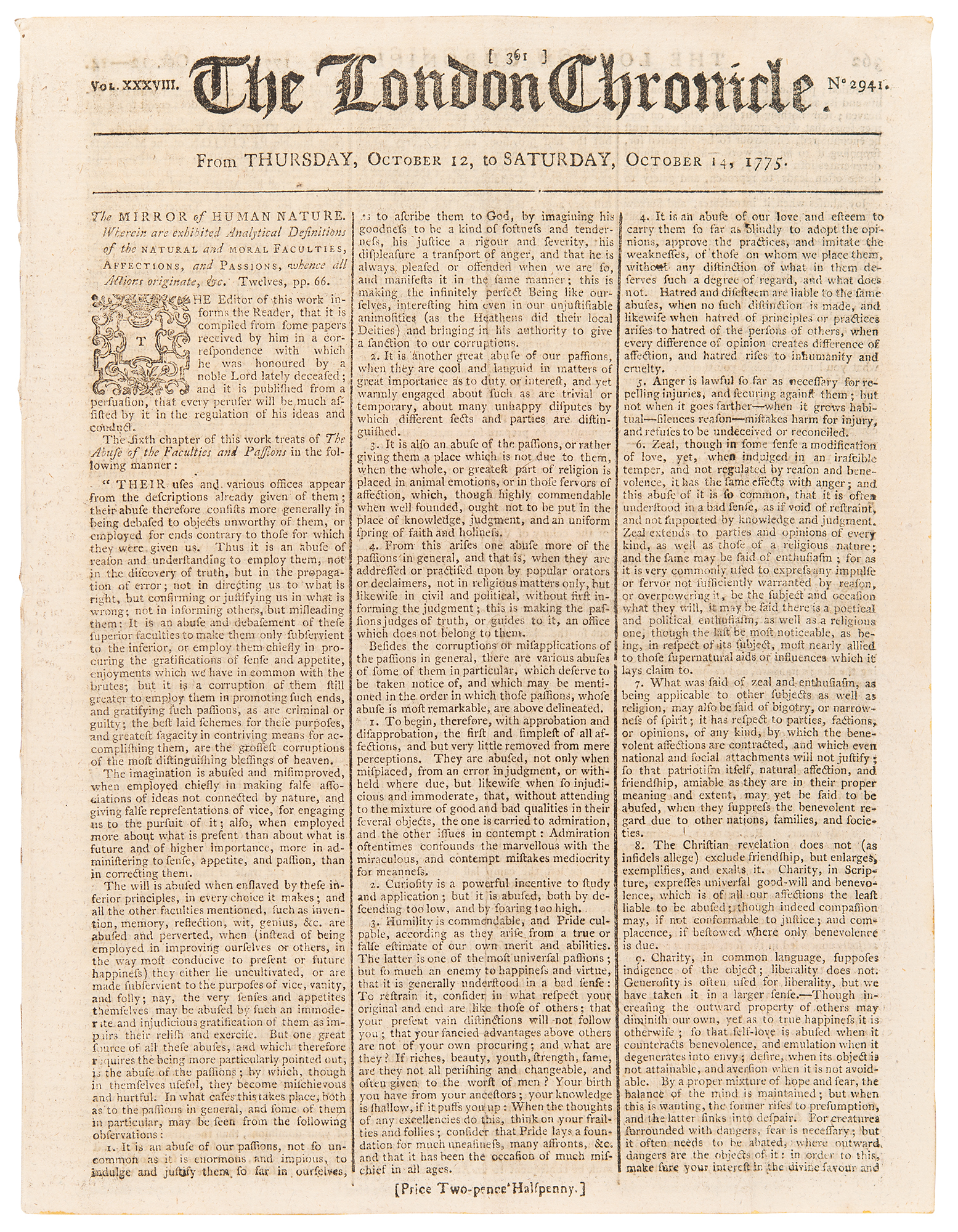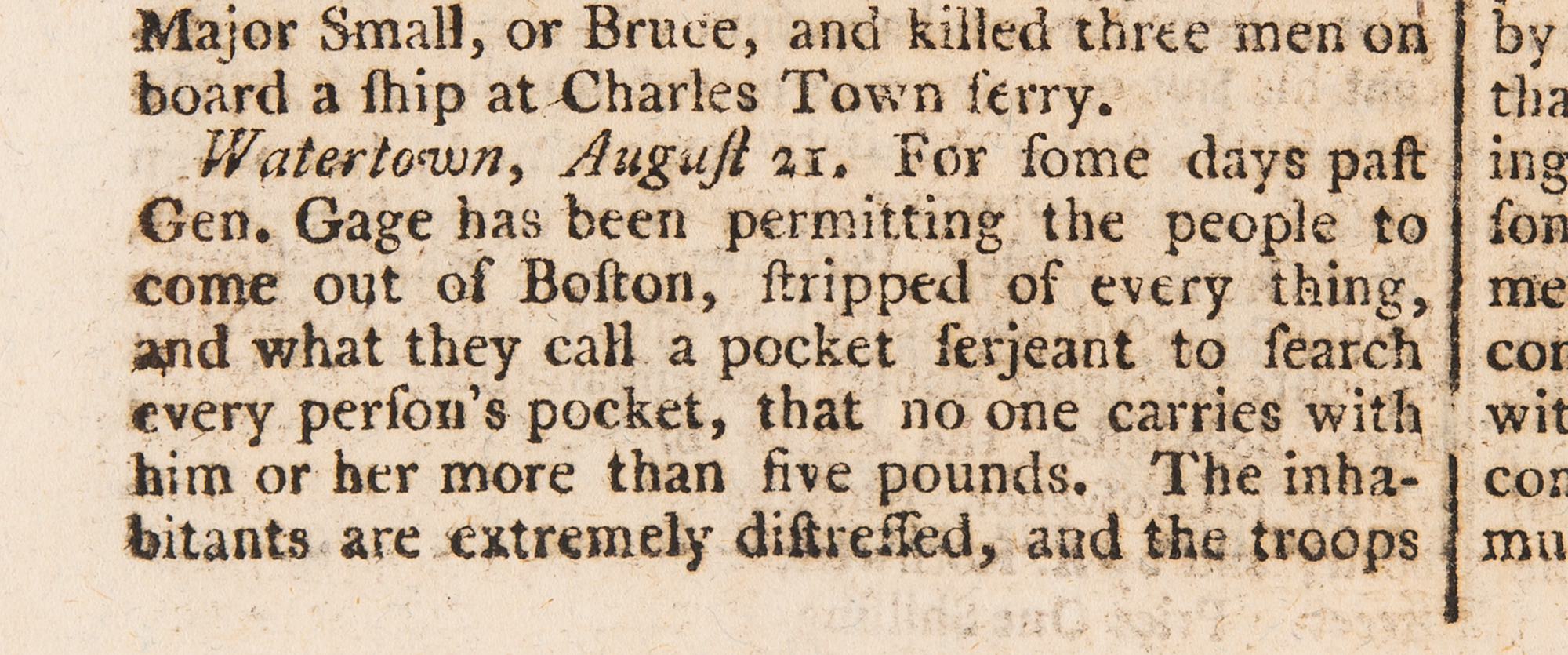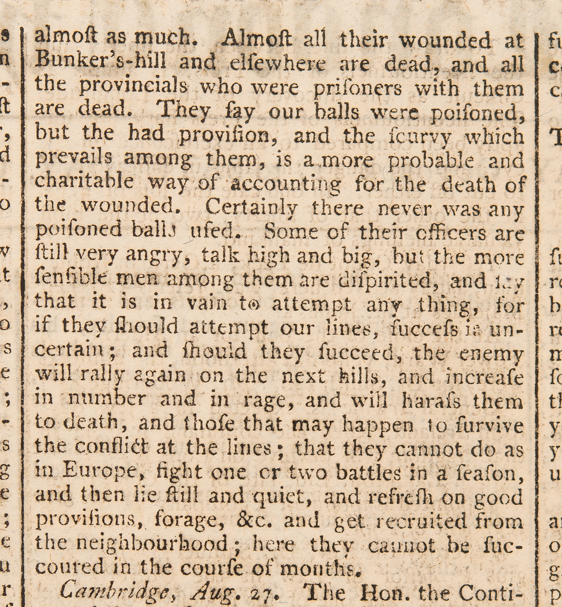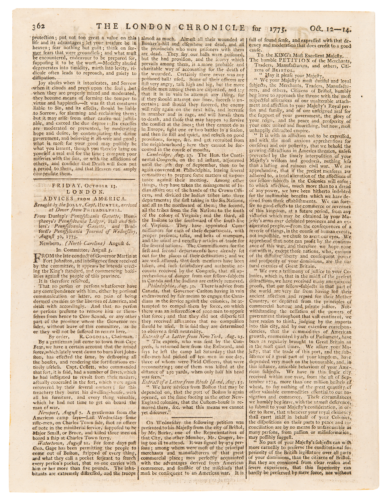 Issue of The London Chronicle newspaper from Thursday, October 12 to Saturday, October 14, 1775, eight pages, 8.5 x 11.25, containing a section entitled “Advices from America” that features a news brief from Watertown, Massachusetts, on August 21st, which relays news of the dire aftermath of the Battle of Bunker Hill, in full: “For some days past Gen. Gage has been permitting the people to come out of Boston, stripped of every thing, and what they call a pocket serjeant to search every person's pocket, that no one carries with him or her more than five pounds. The inhabitants are extremely distressed, and the troops almost as much. Almost all their wounded at Bunker's-hill and elsewhere are dead, and all the provincials who were prisoners with them are dead. They say our balls were poisoned, but the had provision, and the scurvy which prevails among them, is a more probable and charitable way of accounting for the death of the wounded. Certainly there never was any poisoned balls used. Some of their officers are still very angry, talk high and big, but the more sensible men among them are dispirited, and say that it is in vain to attempt anything, for if they should attempt our lines, success is uncertain; and should they succeed, the enemy will rally again on the next hills, and increase in number and in rage, and will harass them to death, and those that may happen to survive the conflict at the lines; that they cannot do as in Europe, fight one or two battles in a season, and then lie still and quiet, and refresh on good provisions, forage, &c. and get recruited from the neighbourhood; here they cannot be succoured in the course of months.” In fine condition.