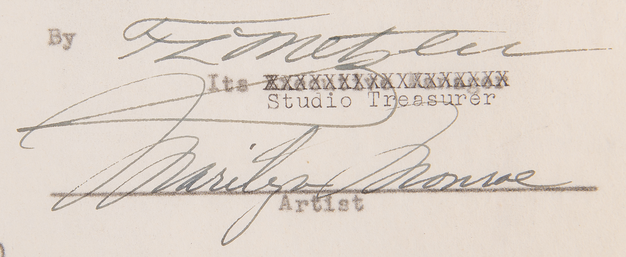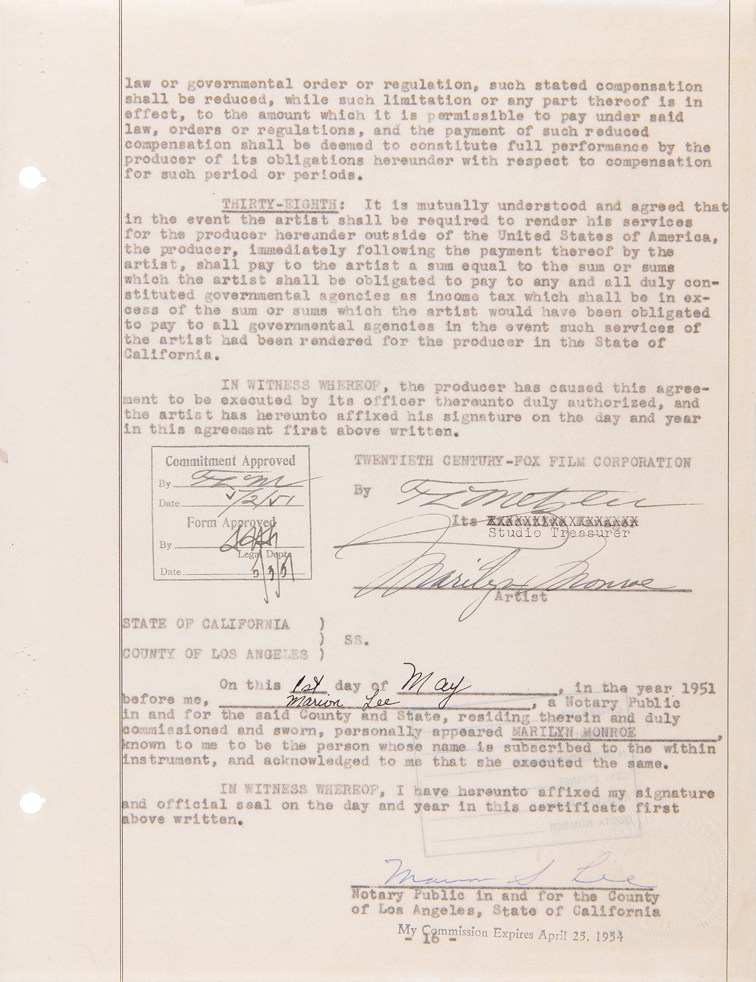 DS, one page, 8.5 x 11, May 1, 1951. Final page of a 16-page agreement between Monroe and the Twentieth Century-Fox Film Corporation, which is signed neatly at the conclusion in fountain pen by Monroe, and countersigned by a notary public and a studio treasurer. In fine condition, with file and staple holes to left edge.
