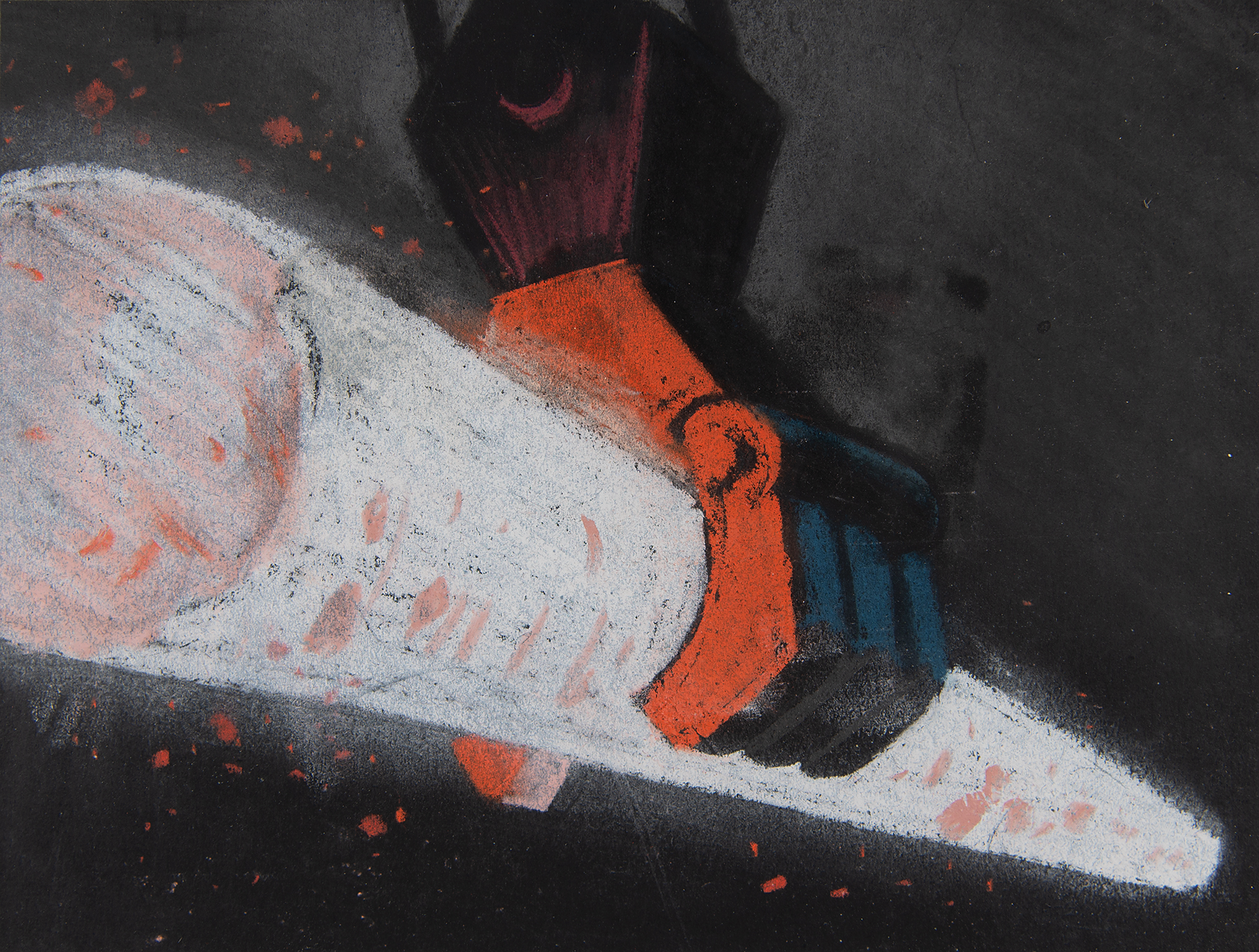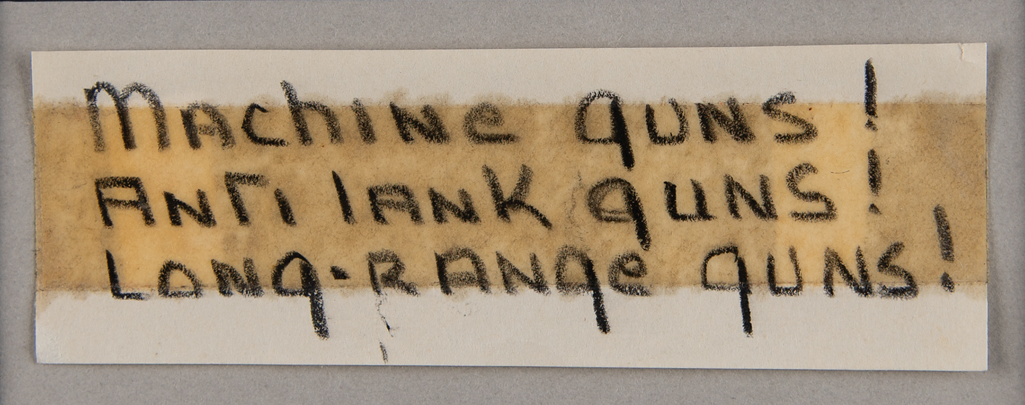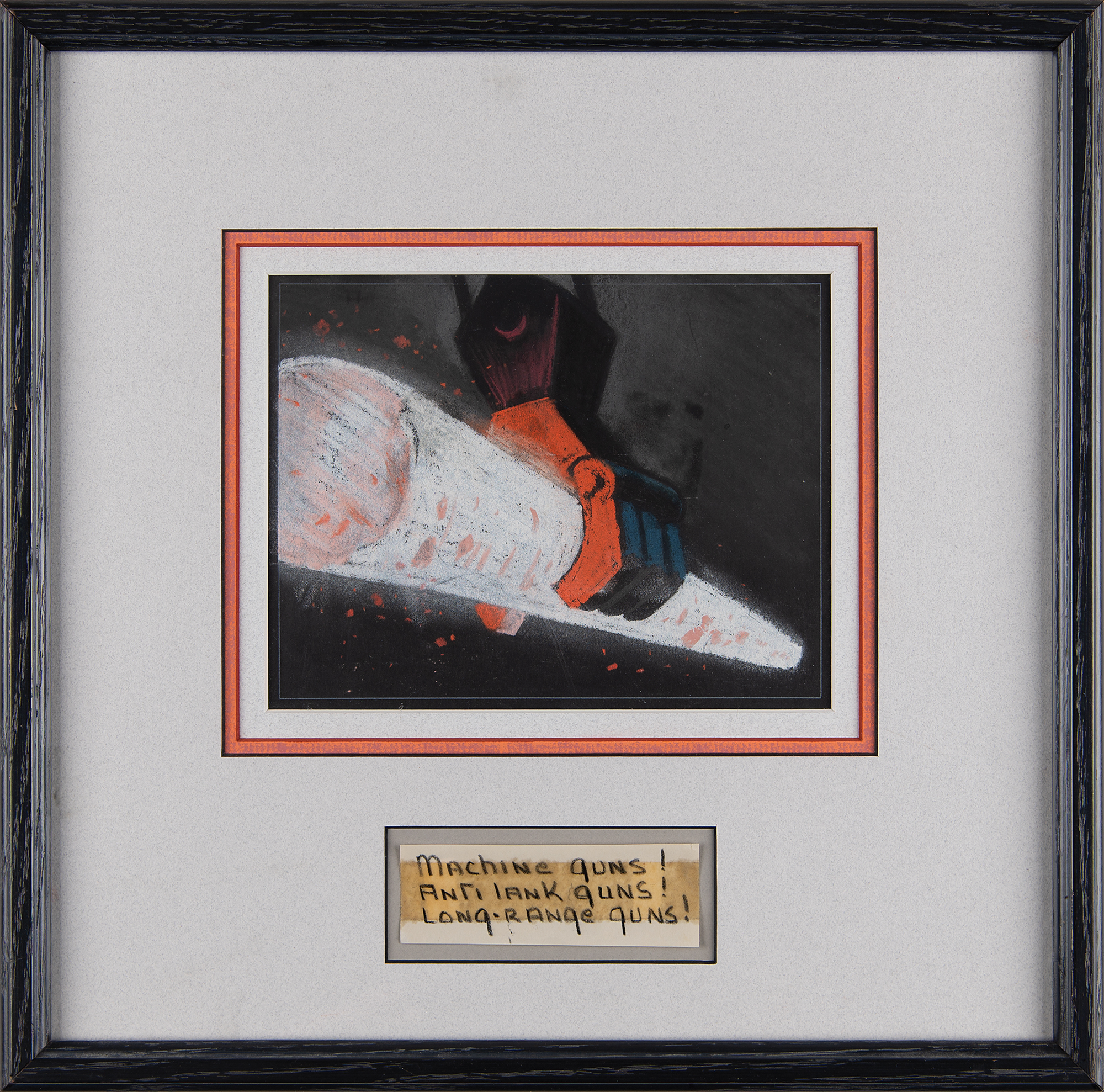 (Walt Disney Studios, 1942) Original storyboard drawing from the Oscar-nominated animated short film The New Spirit, which depicts the inside of an American weapons factory and a large metal claw carrying a glowing hot steel tube, which is soon revealed as a finished cannon barrel. Accomplished in colored pastels on black 7.5 x 5.75 animation paper, with a total image size of 6.75 x 5.5. Includes the original handwritten caption for the film’s narration: “Machine guns! Anti-tank guns! Long-range guns!” Triple-matted and framed together to an overall size of 14.5 x 14.25. In fine condition.