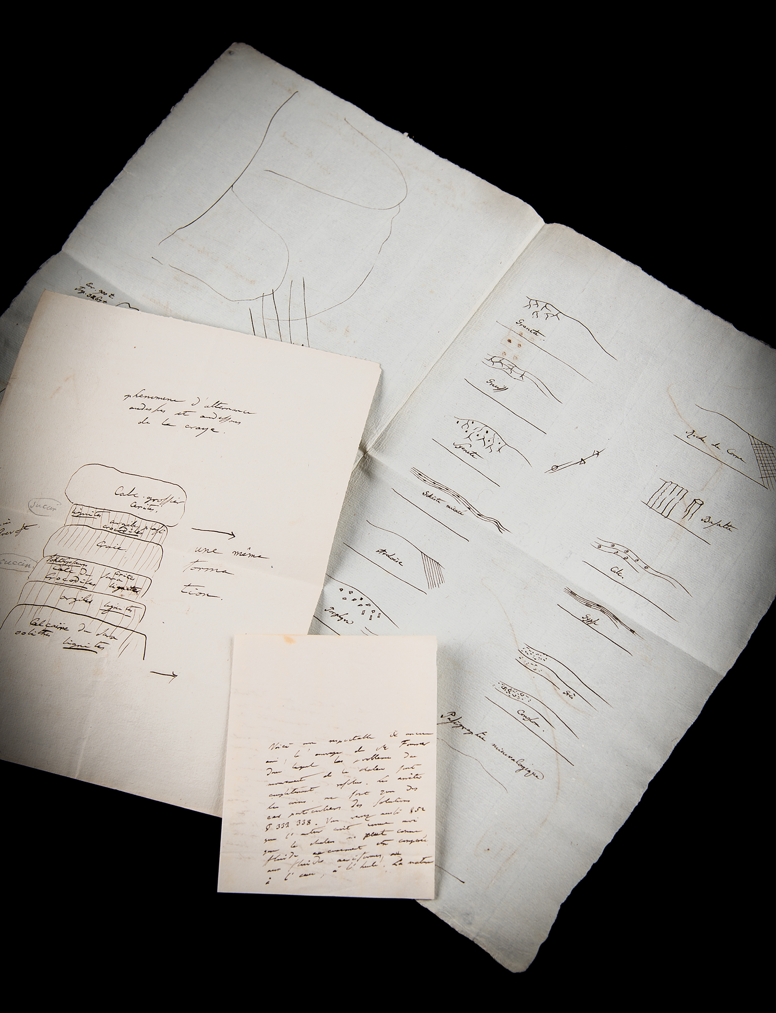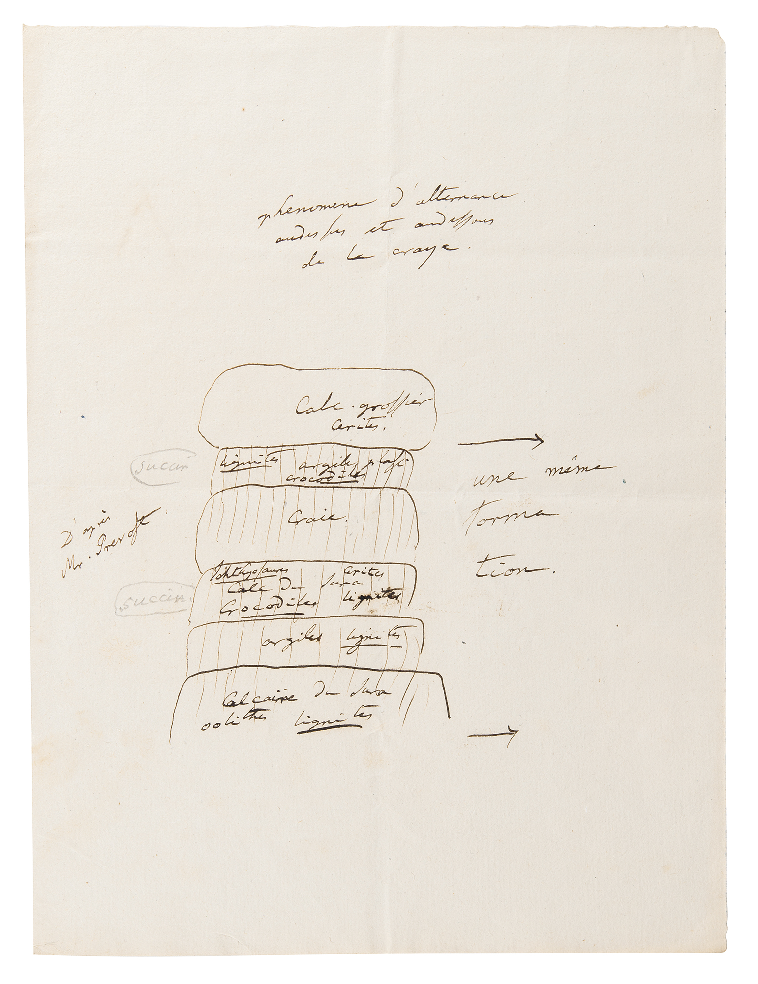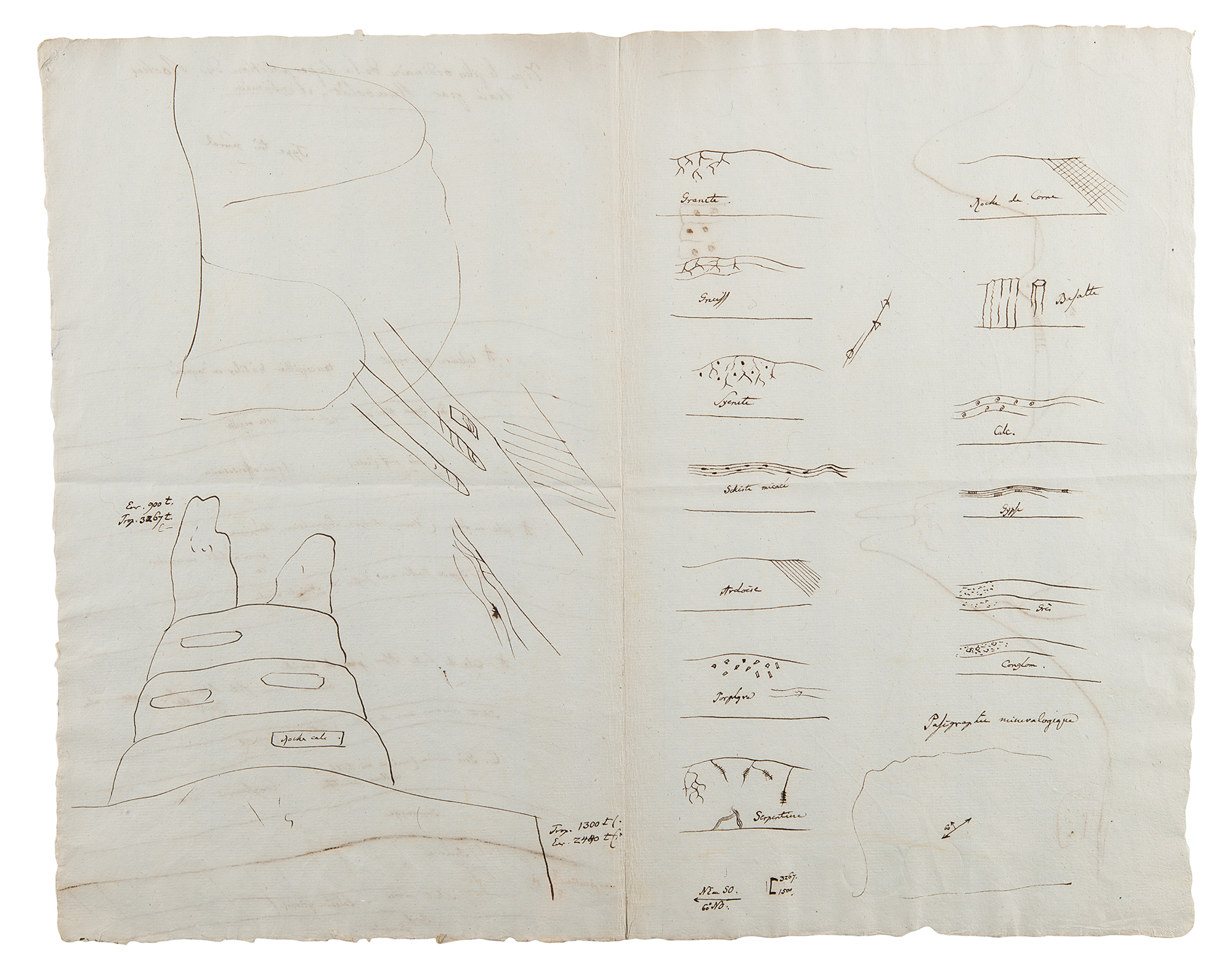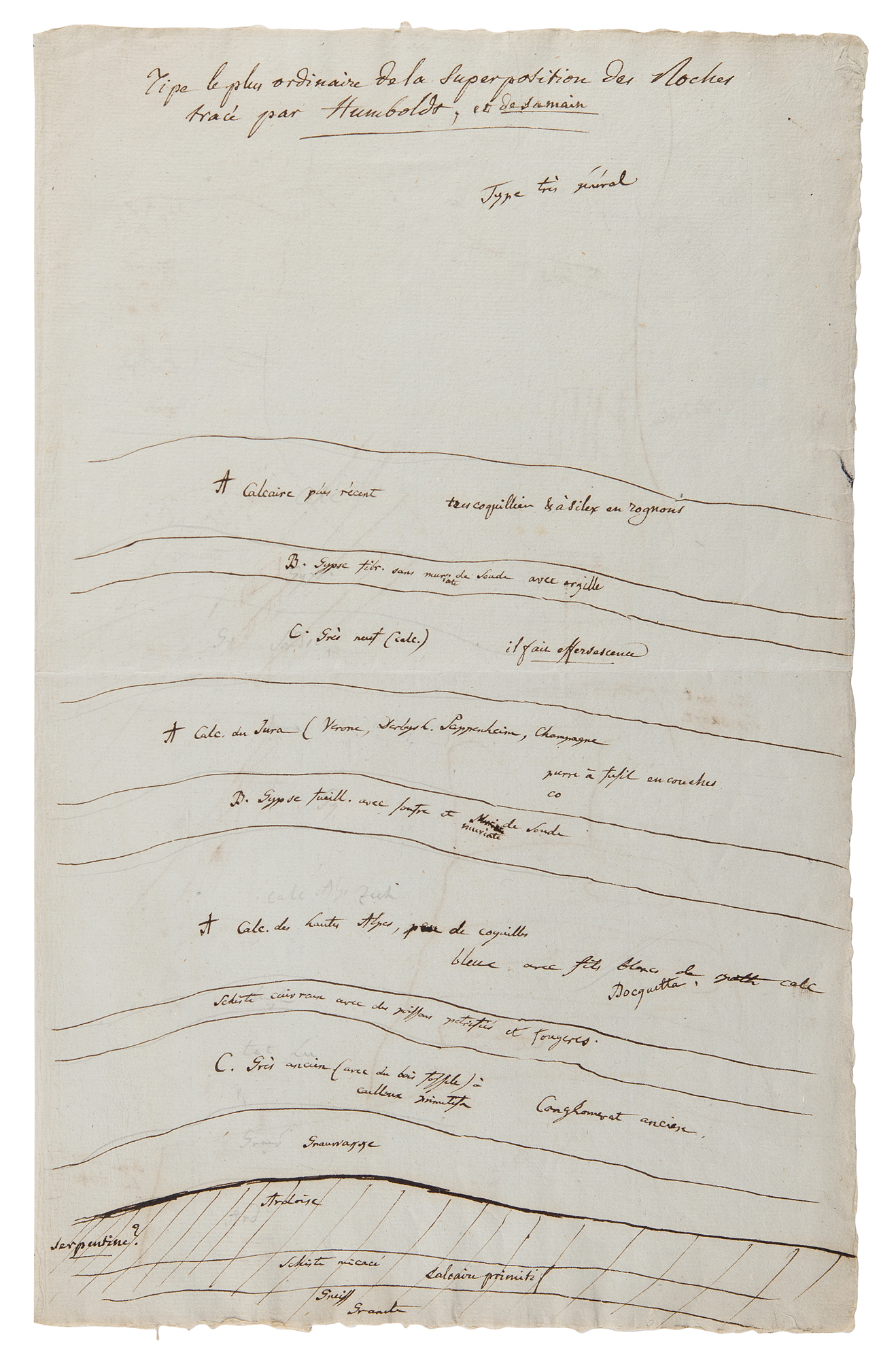 German naturalist and explorer (1769–1859) who wrote Kosmos, a massive five-volume study which attempted to unify the various branches of man’s knowledge. ALS in French, signed “Humboldt,” three pages on two adjoining sheets, 4.75 x 4.75, no date [likely circa 1822-23]. Letter to mineralogist Louis-Benjamin Fleuriau de Bellevue, sending his friend Fourier’s book, in part (translated): “In which the problem of heat movement is completely solved. Ridges and edges are special cases only…You will also see in paragraph 52 that the author believes as I do that the heat cannot be compared to any fluid, water in oil…I am asking you to please let me visit you on Wednesday at 11 a.m.” Includes multiple detailed geological sketches and diagrams: first set is four pages on two adjoining sheets, 8 x 12.75, featuring descriptions of earth formations (clay, chalky, and lignite); a large diagram related to the superposition of rocks, with descriptions of each one’s appearance and type; sketches of landscapes; and numerous small sketches of various earth and rock textures, including granite, syenite, gypsum, and limestone; and another sketch of a superposition diagram on an off-white 7 x 9.5 sheet. In overall fine condition. Accompanied by a large print entitled ‘A Proportional and Tabular View of the Superior, Supermedial, and Medial Rocks,’ as well as an export certificate from the French Ministry of Culture.