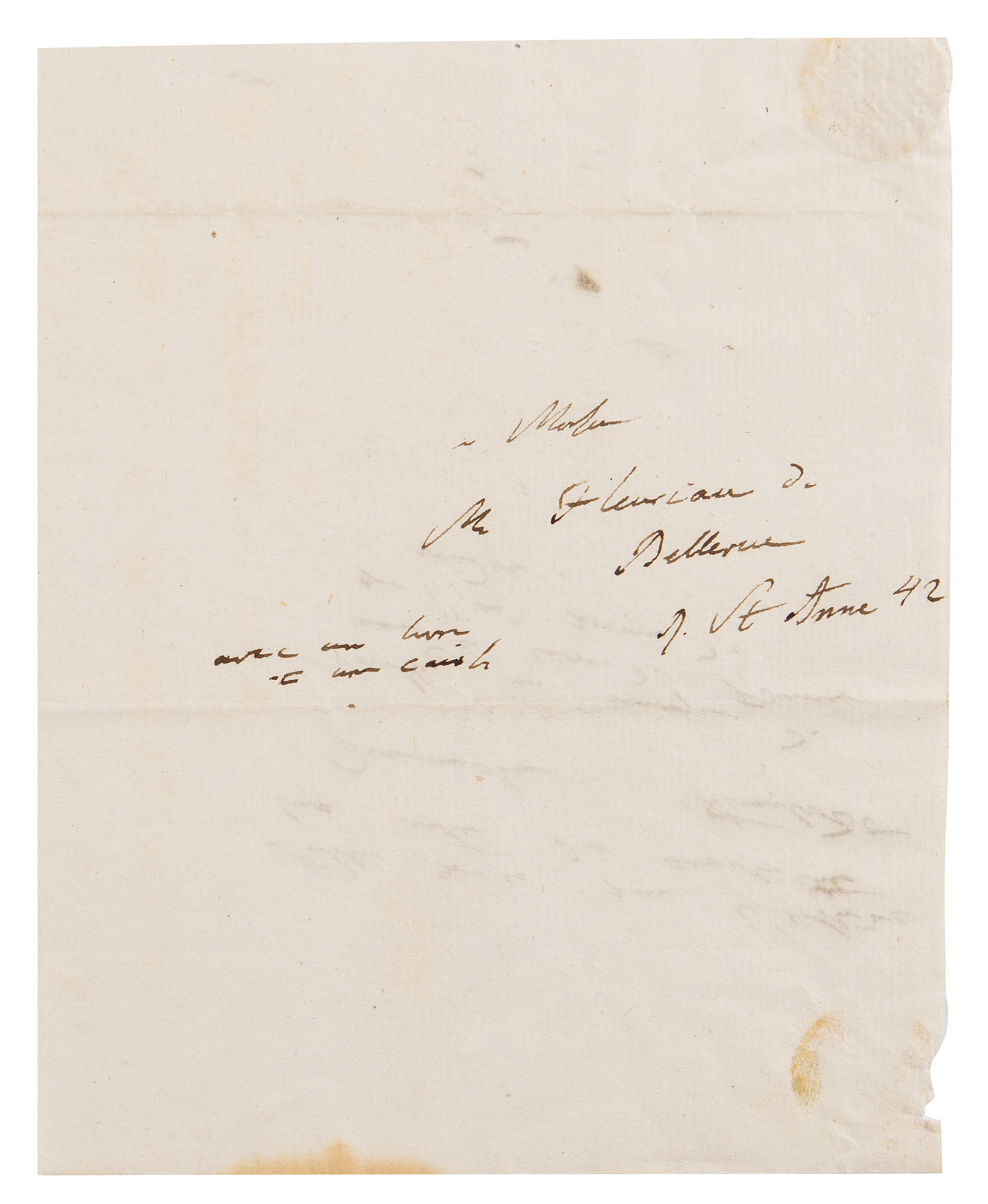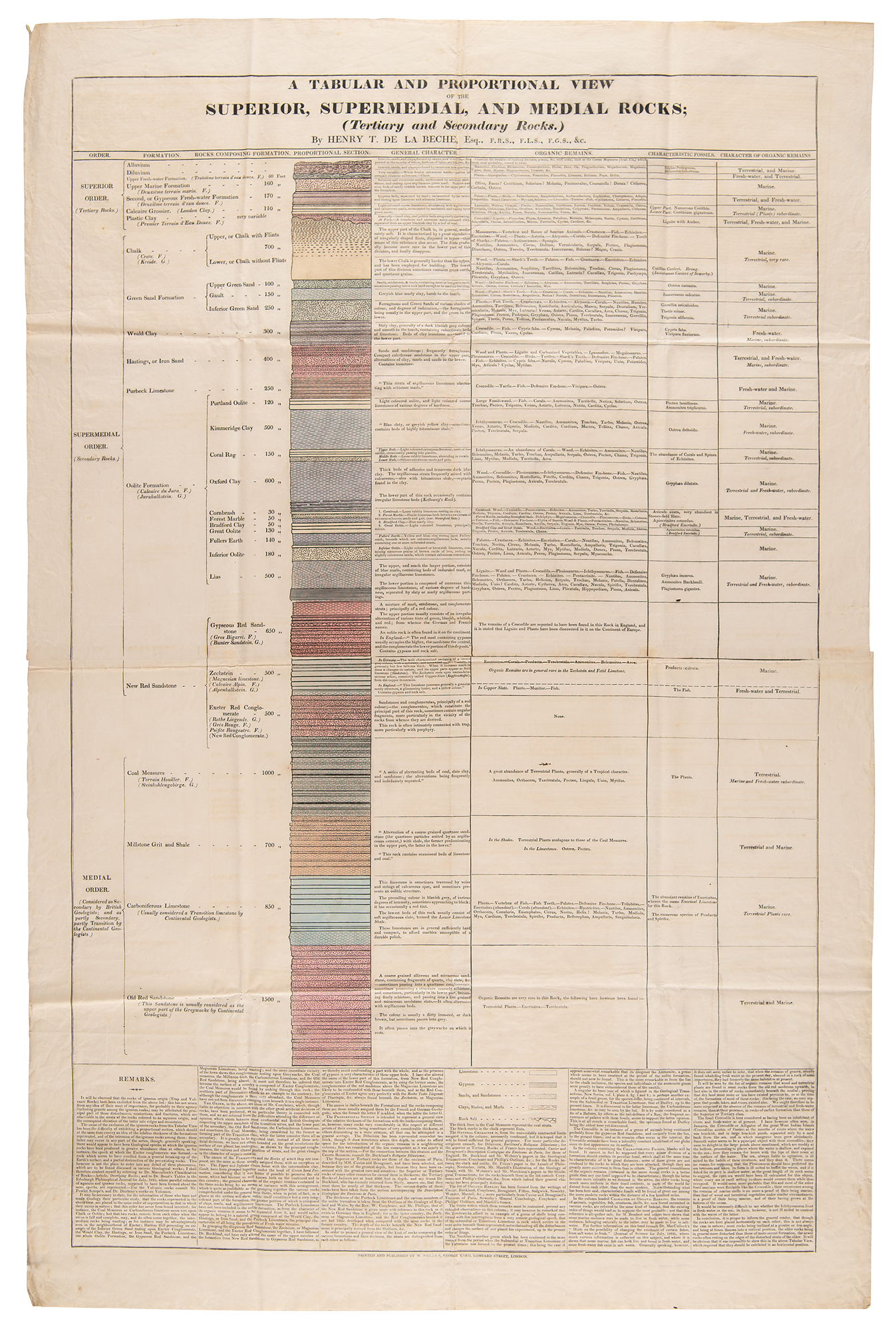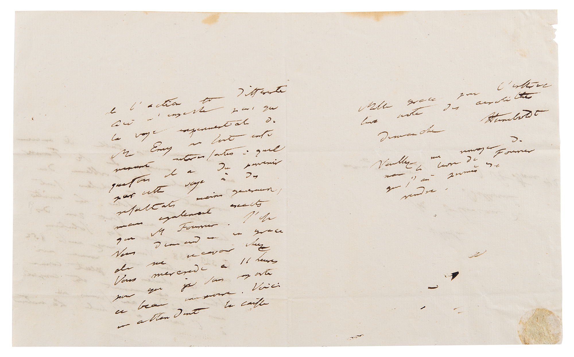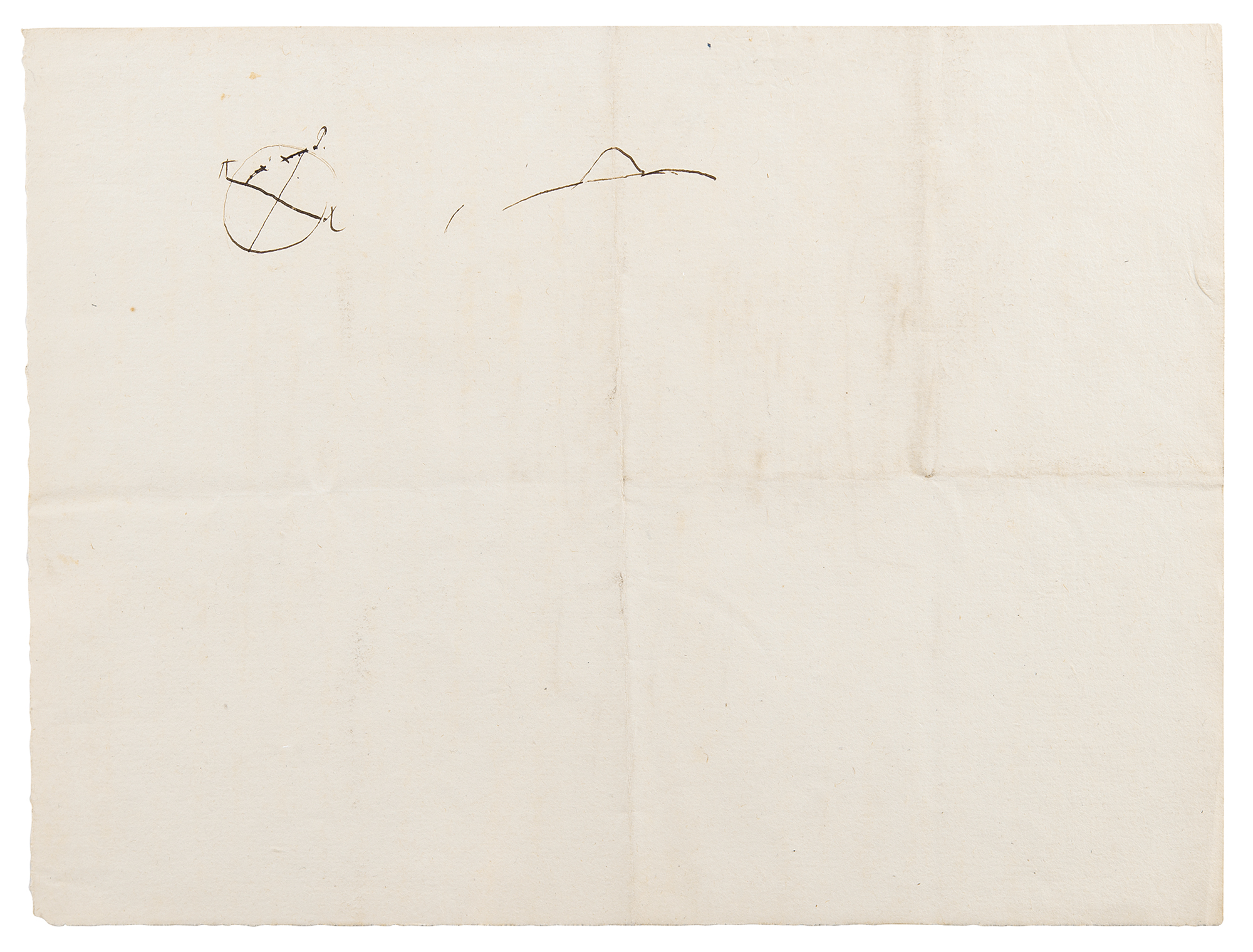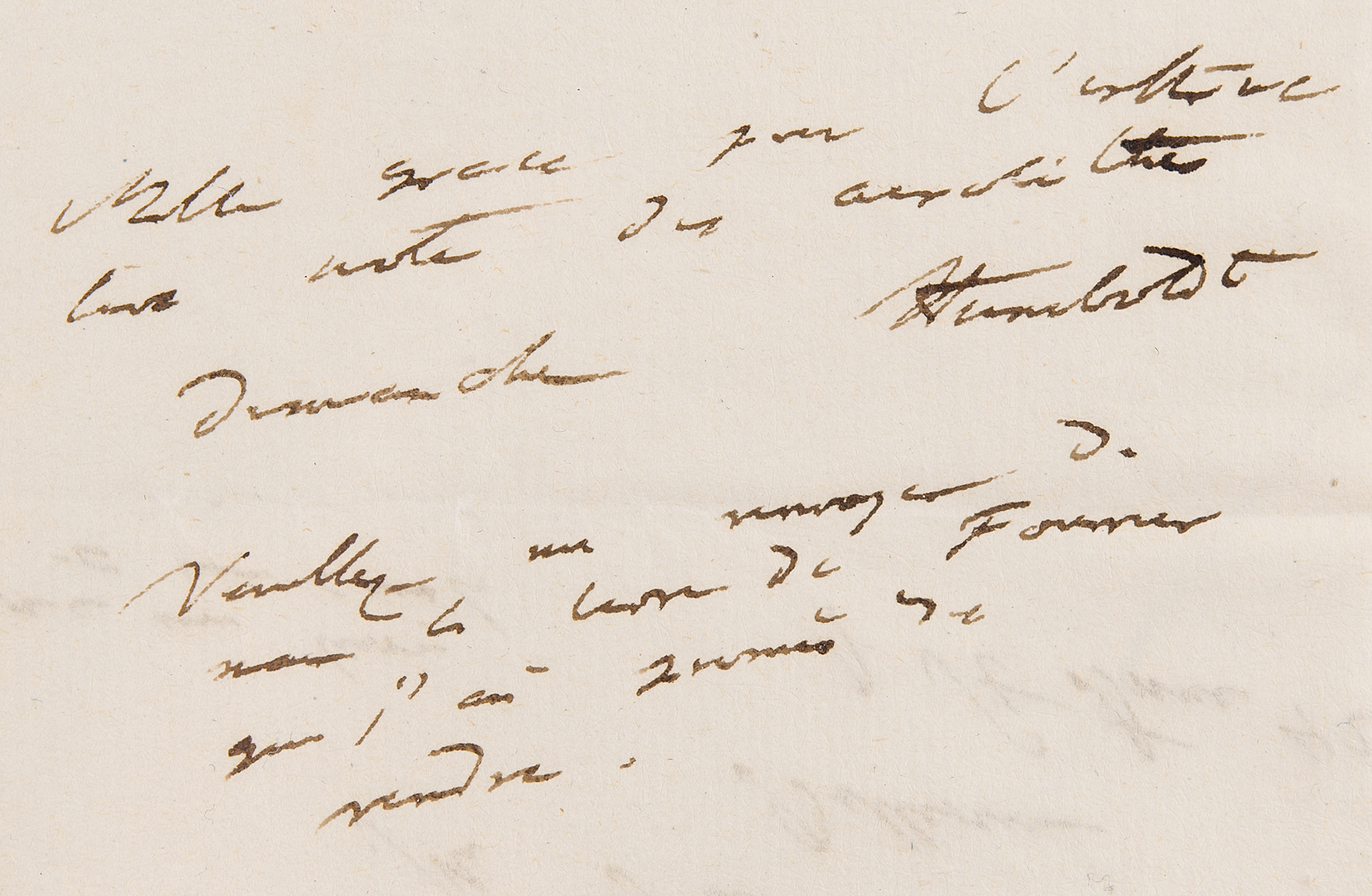 German naturalist and explorer (1769–1859) who wrote Kosmos, a massive five-volume study which attempted to unify the various branches of man’s knowledge. ALS in French, signed “Humboldt,” three pages on two adjoining sheets, 4.75 x 4.75, no date [likely circa 1822-23]. Letter to mineralogist Louis-Benjamin Fleuriau de Bellevue, sending his friend Fourier’s book, in part (translated): “In which the problem of heat movement is completely solved. Ridges and edges are special cases only…You will also see in paragraph 52 that the author believes as I do that the heat cannot be compared to any fluid, water in oil…I am asking you to please let me visit you on Wednesday at 11 a.m.” Includes multiple detailed geological sketches and diagrams: first set is four pages on two adjoining sheets, 8 x 12.75, featuring descriptions of earth formations (clay, chalky, and lignite); a large diagram related to the superposition of rocks, with descriptions of each one’s appearance and type; sketches of landscapes; and numerous small sketches of various earth and rock textures, including granite, syenite, gypsum, and limestone; and another sketch of a superposition diagram on an off-white 7 x 9.5 sheet. In overall fine condition. Accompanied by a large print entitled ‘A Proportional and Tabular View of the Superior, Supermedial, and Medial Rocks,’ as well as an export certificate from the French Ministry of Culture.