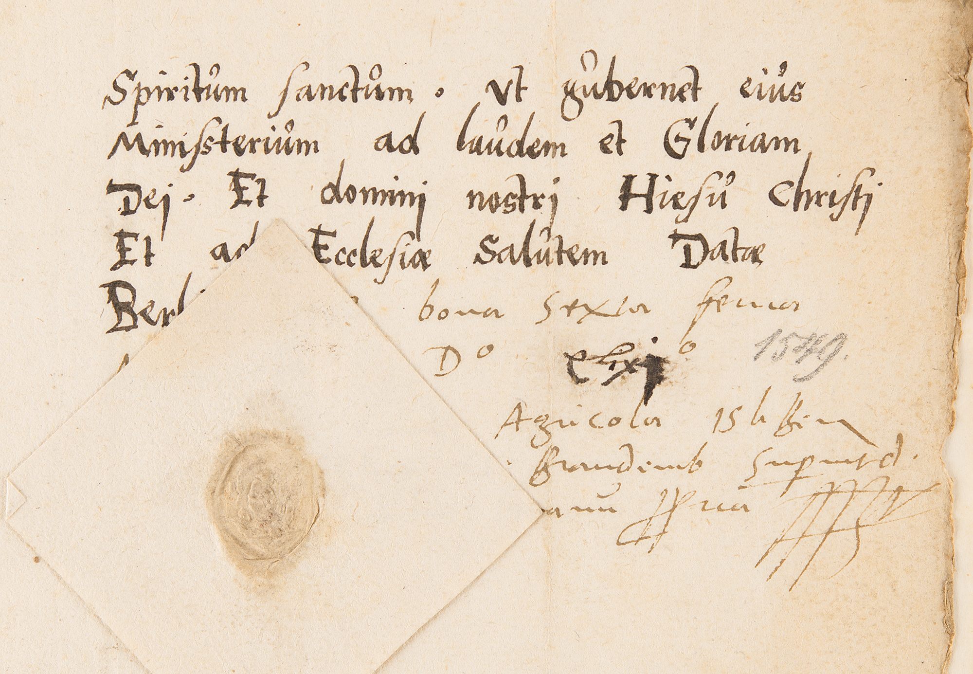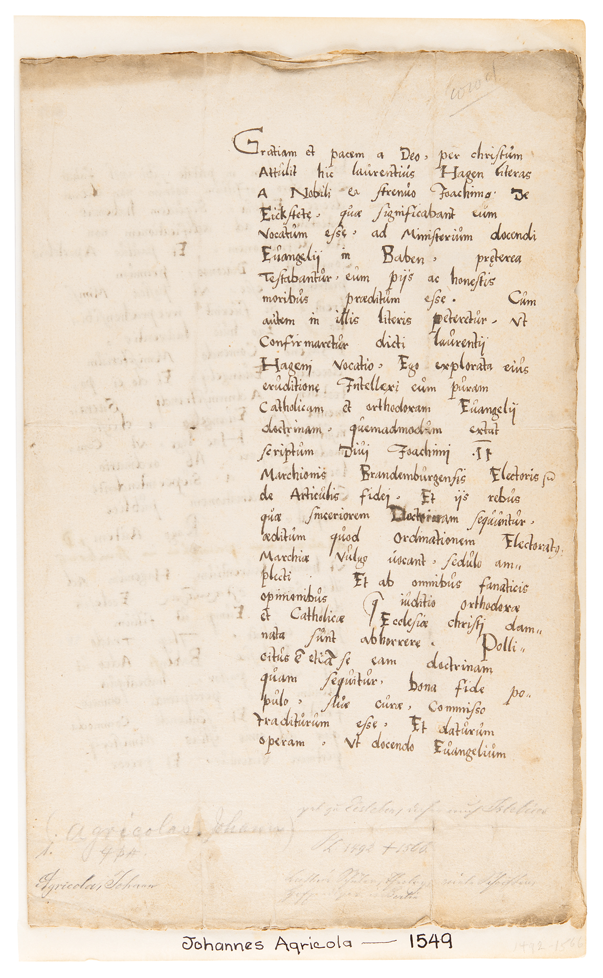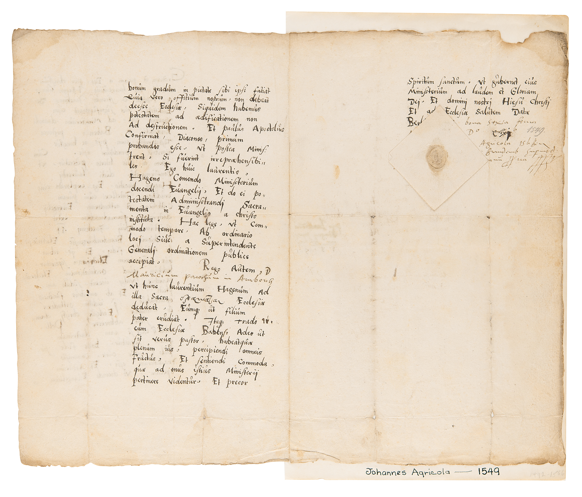 German theologian (1494–1566) who was a Protestant Reformer during the Reformation, beginning as a follower and friend of Martin Luther; they went on to become bitter rivals, with Luther branding Agricola as an 'incorrigible liar.' Extremely rare manuscript DS in Latin, signed “Johann Agricola of Eisleben Theologian,” three pages on two adjoining sheets, 8.25 x 13, Good Friday, 1549. Agricola certifies Lorenz [Laurentius] Hagen’s fitness for the ministry in the church of Baben. In full (translated): "Grace and peace from God, through Christ. The present Lorenz [Laurentius] Hagen has presented a letter from the noble and vigorous Joachim of Eichstädt, indicating that he has been called to the office of preaching the Gospel in Baben, and further testifying that he is possessed of a godly and upright character. Now, since that letter contained a request for the vocation of the said Lorenz Hagen to be confirmed, I examined his learning and found that he embraced the pure Catholic and orthodox doctrine of the Gospel, as made plain by the edict on articles of faith, and those matters attendant upon more sound doctrine, of Lord Joachim II, Elector of the Mark of Brandenburg, commonly called the Ordinance of the Electorate of the Mark; and that he rejected all fanatical opinions condemned by the judgment of the orthodox and Catholic church. He promised also to transmit faithfully to the congregation in his care the doctrine that he follows, and to strive in preaching the Gospel to obtain for himself good standing in godliness. Now therefore, because this our service should not be unavailing to the church, as ours is the power to build, not to destroy, and the Apostle Paul asserts that before deacons may serve they should first be examined as to whether they are beyond reproach, I entrust to the present Lorenz Hagen the office of preaching the Gospel, and empower him to administer the sacraments ordained in the Gospel by Christ, provided that, at a convenient time, he be ordained publicly by the ordinary of the place or the Superintendent General. But I ask Master Moritz [Mauricius] Porors [?] in Arneburg to guide the present Lorenz Hagen toward those holy visions of the church, and instruct him as a father would a son. And so I commend him to the church of Baben to be its true pastor, having full right to all its benefits and enjoying the privileges seen to accompany the charge of that office, and I pray the Holy Spirit guide his ministry for the praise and glory of God, and of our Lord Jesus Christ, and the well-being of the church. Given at Berlin, on the feast of Good Friday 1549. Johann Agricola of Eisleben Theologian, Superintendent General of the Mark of Brandenburg, in his own hand." Agricola evidently filled out a few words on the second page in his own hand. Retains its complete paper seal, affixed with wax beside Agricola's signature. In fine condition, with light staining, and some minor loss, to the edges.