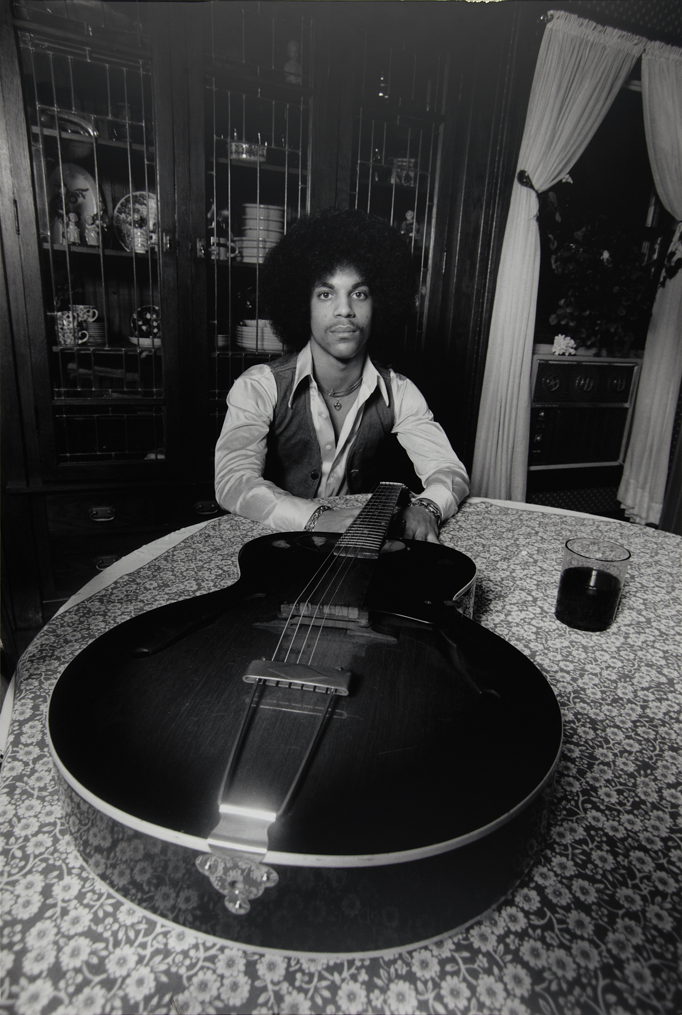 This photograph was captured during one of three photo shoots that photographer Robert Whitman made of Prince in 1977 for an introductory press kit aimed at potential record companies. These resulting photos, Prince’s first with a professional photographer, mark an instrumental moment in his career. Whitman photographed Prince in his Minneapolis studio, at manager Owen Husney’s Linden Hills Boulevard home, and on the streets of downtown Minneapolis, including in front of 'The Music Wall' mural painted on the side of the Schmitt Music store. Only 15 copies of the press kit were ever produced, and the photographs from these sessions have rarely been seen.