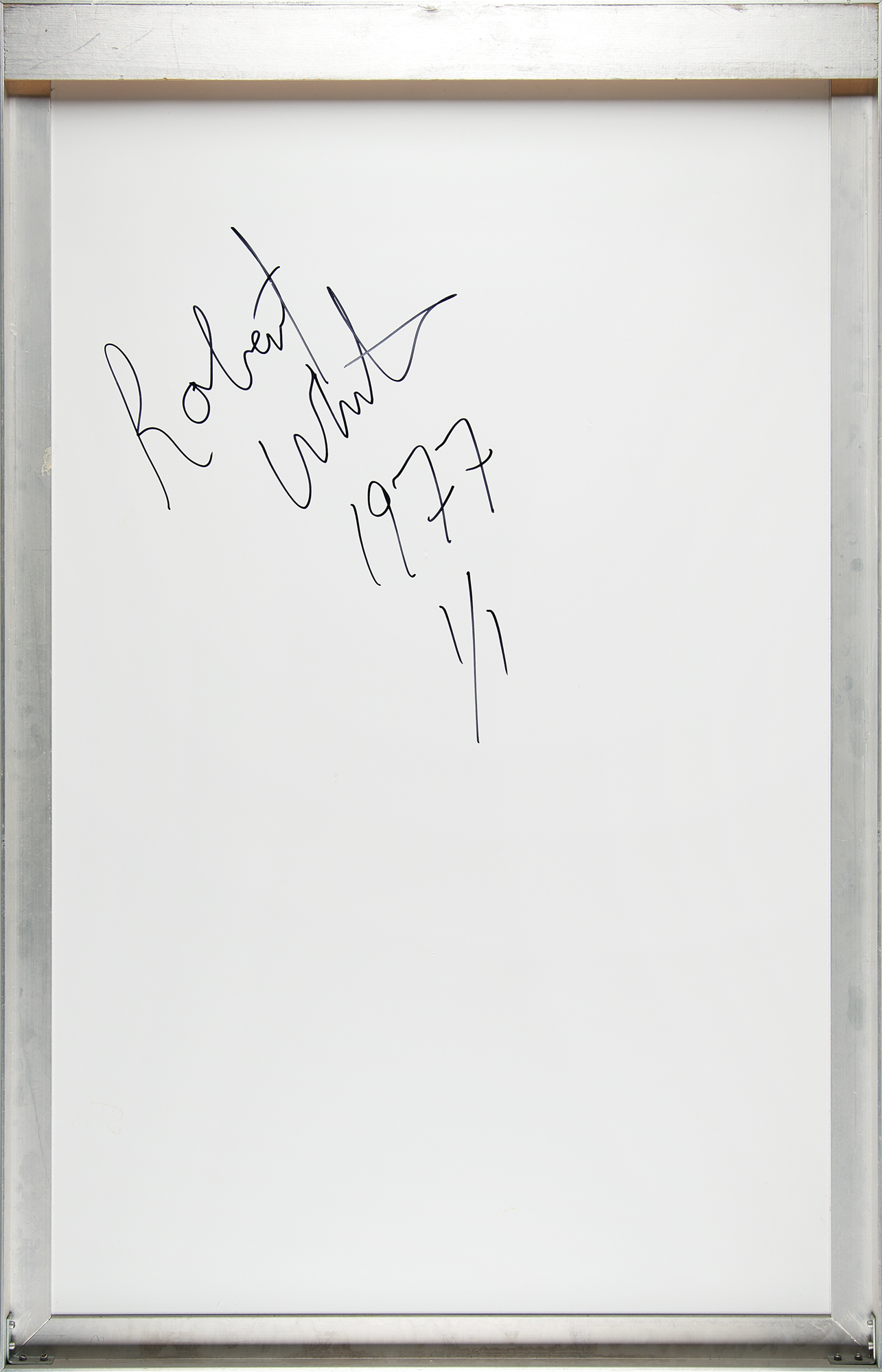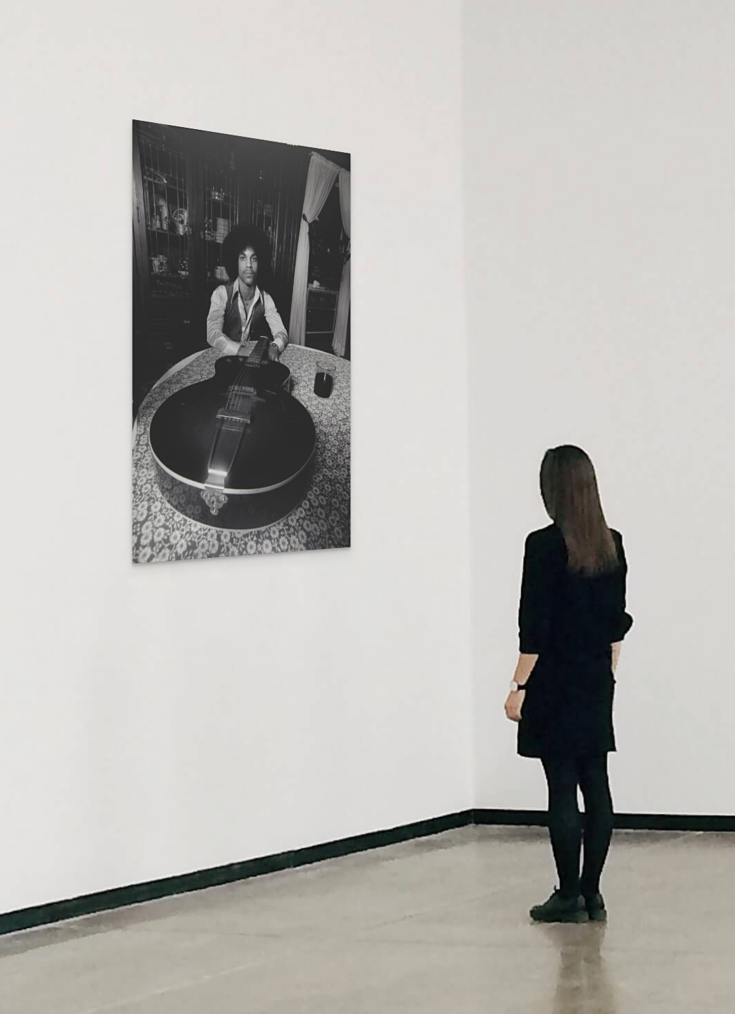 Enormous limited edition 33 x 49 archival pigment print of Prince by photographer Robert Whitman in 1977, professionally adhered to a floating metal mount, numbered 1/1, signed on the back in black felt tip, “Robert Whitman, 1977.” The print, which is entitled 'Prince with Guitar, Husney’s Home Session,' depicts Prince as a 19-year-old musician seated with an acoustic guitar in the home of his manager, Owen Husney. In fine condition, with some minor edge chipping.