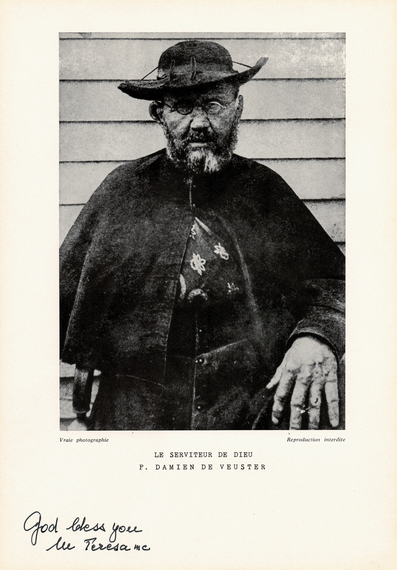 Uncommon 8.5 x 12.5 magazine-stock print of Father Damian De Veuster, recognized for his ministry to people with leprosy and venerated as a saint in the Catholic Church, signed in the lower border in black felt tip, "God bless you, M Teresa mc." In fine condition, with scattered light creasing.