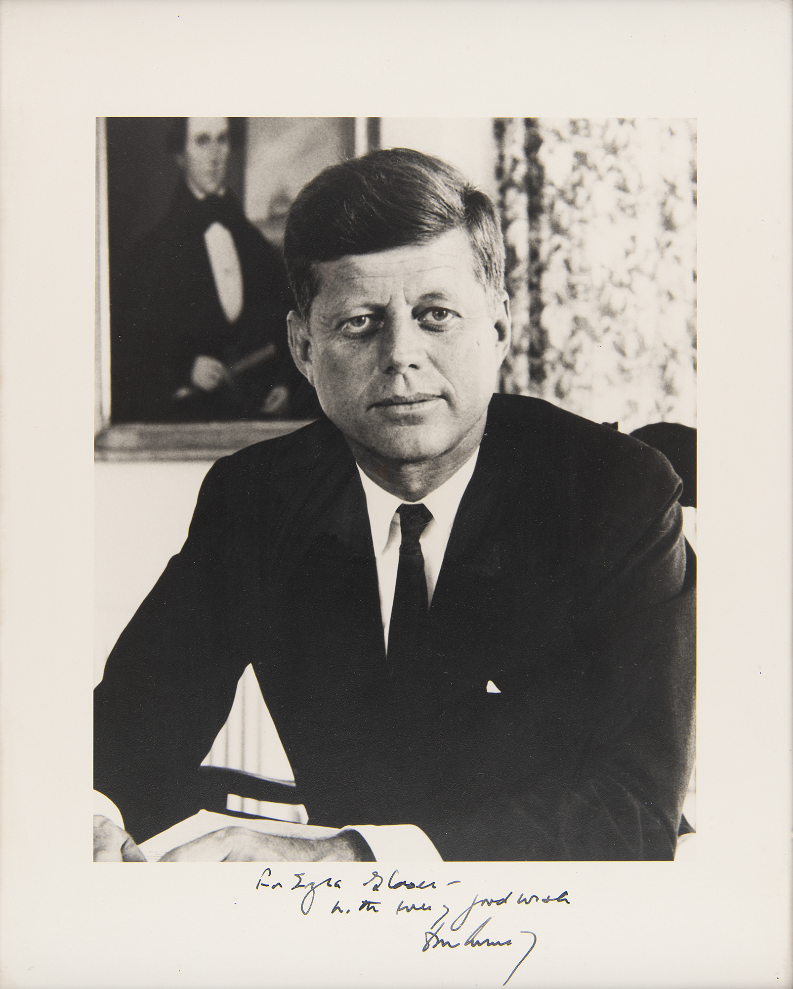 The recipient, Ezra Glaser (1913-2010), was a lifelong senior-level employee in government service who served as a statistician in the U.S. National Recovery Administration, National Resources Planning Board, and the Navy Department, amongst others. In 1962, Glaser was appointed as the Assistant Commissioner of Patents, which was ostensibly when Kennedy presented him with this photograph.