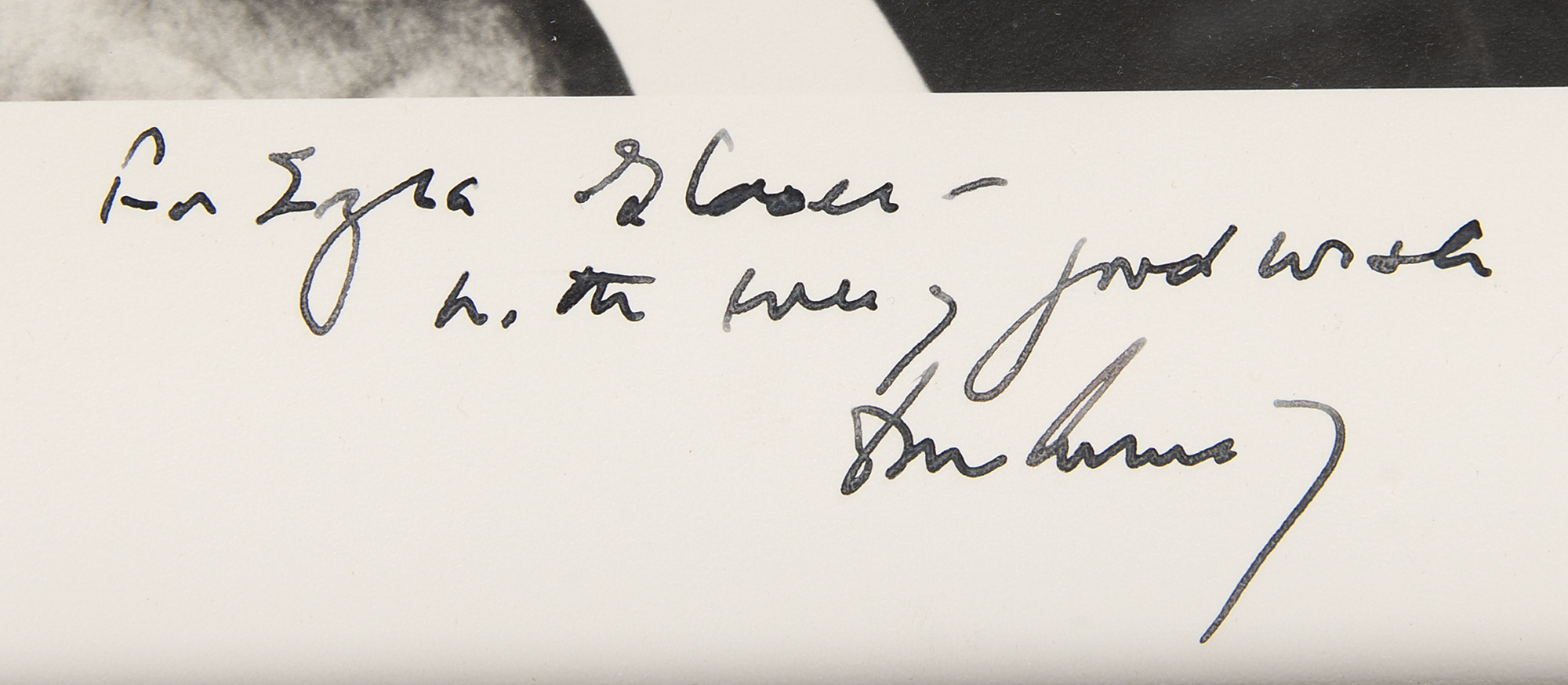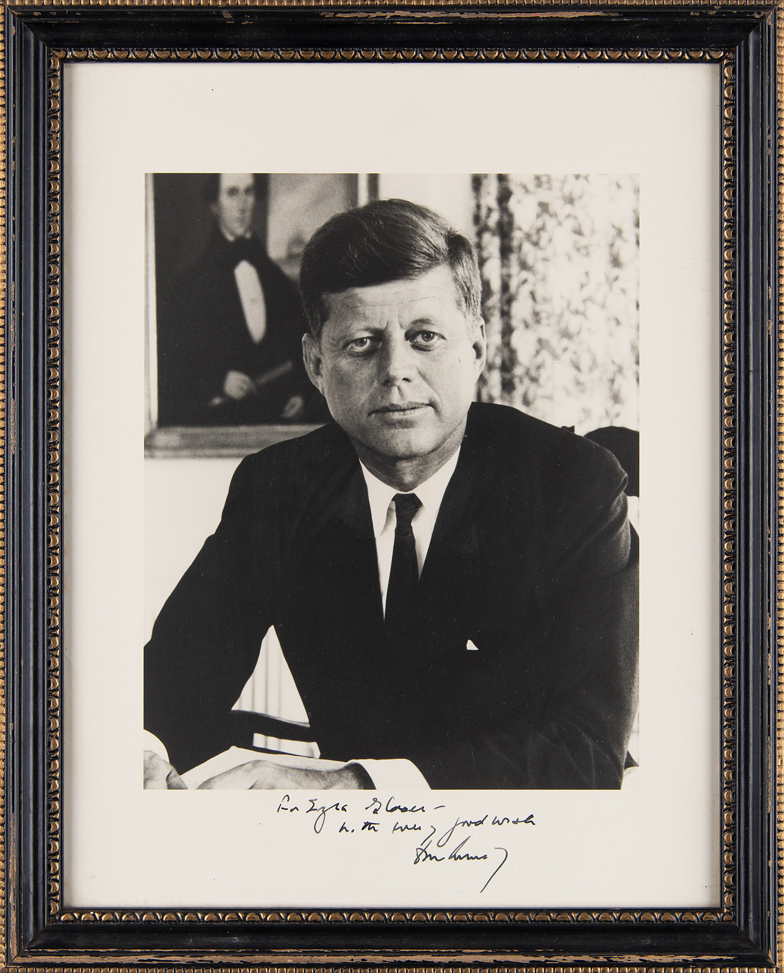 Highly appealing vintage matte-finish 10.5 x 13.5 portrait photo of John F. Kennedy taken after being nominated as the Democratic presidential candidate in August of 1960, signed and inscribed in the lower border in fountain pen, “For Ezra Glaser — with every good wish, John Kennedy.” Framed to an overall size of 12.5 x 15.75. In fine condition. Although taken in the summer of 1960 by Alfred Eisenstaedt, this was the preferred portrait Kennedy would sign and give out during the beginning of his administration.