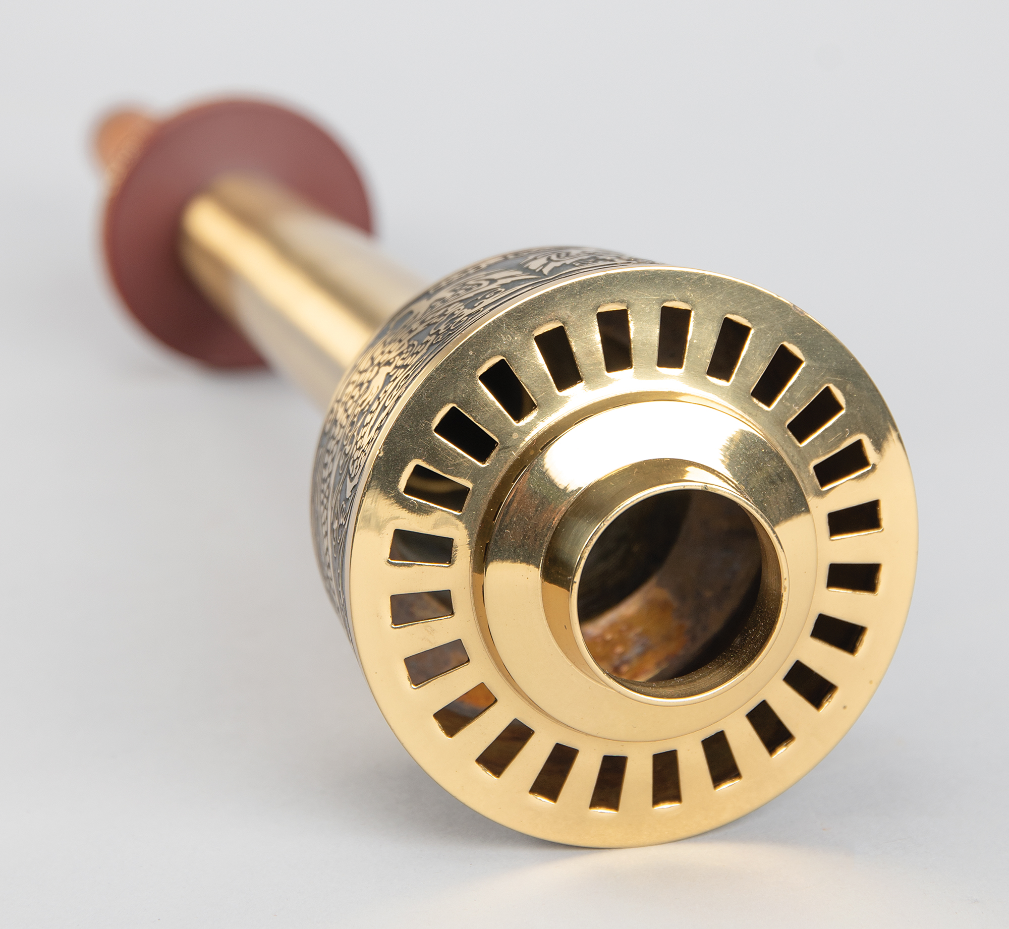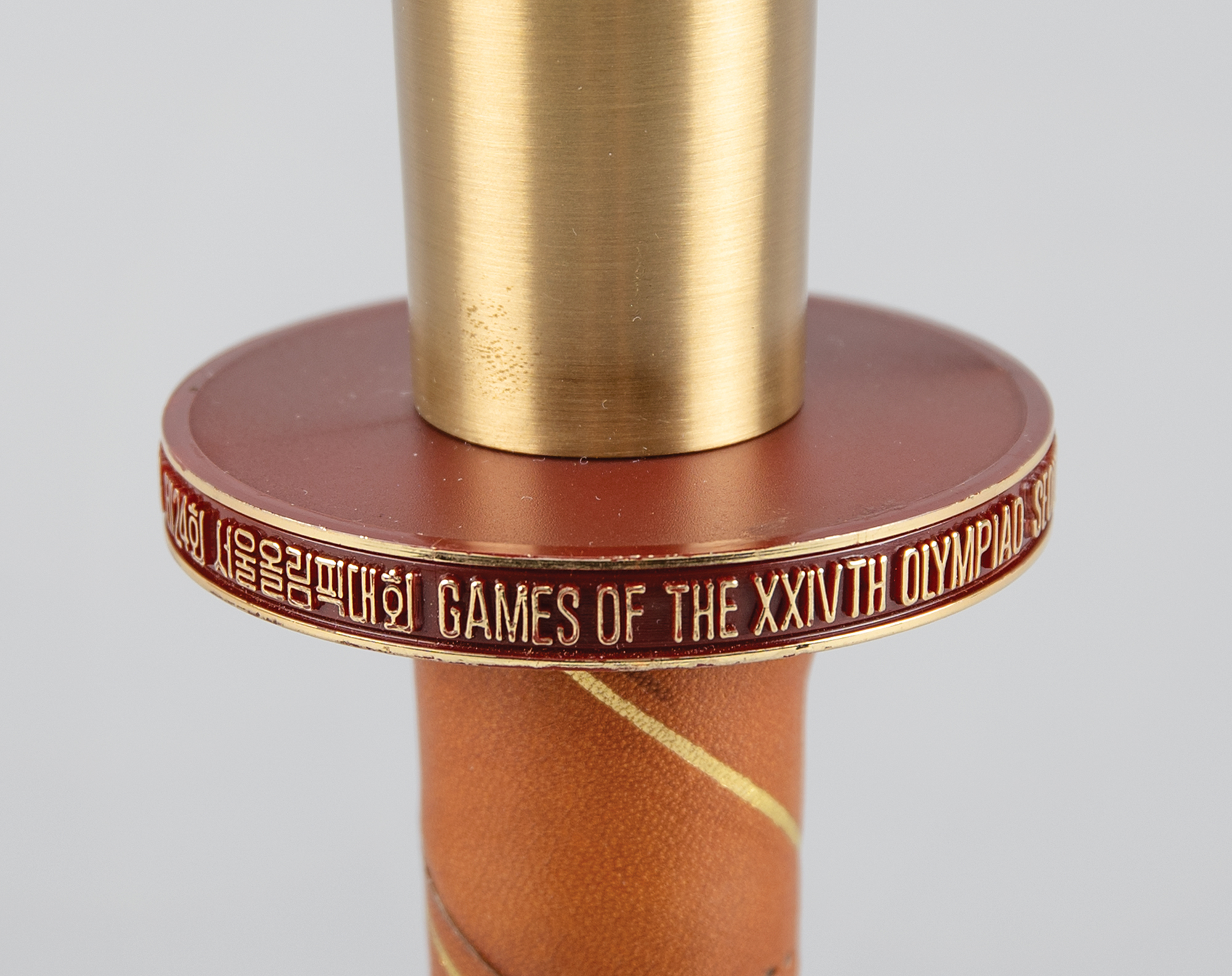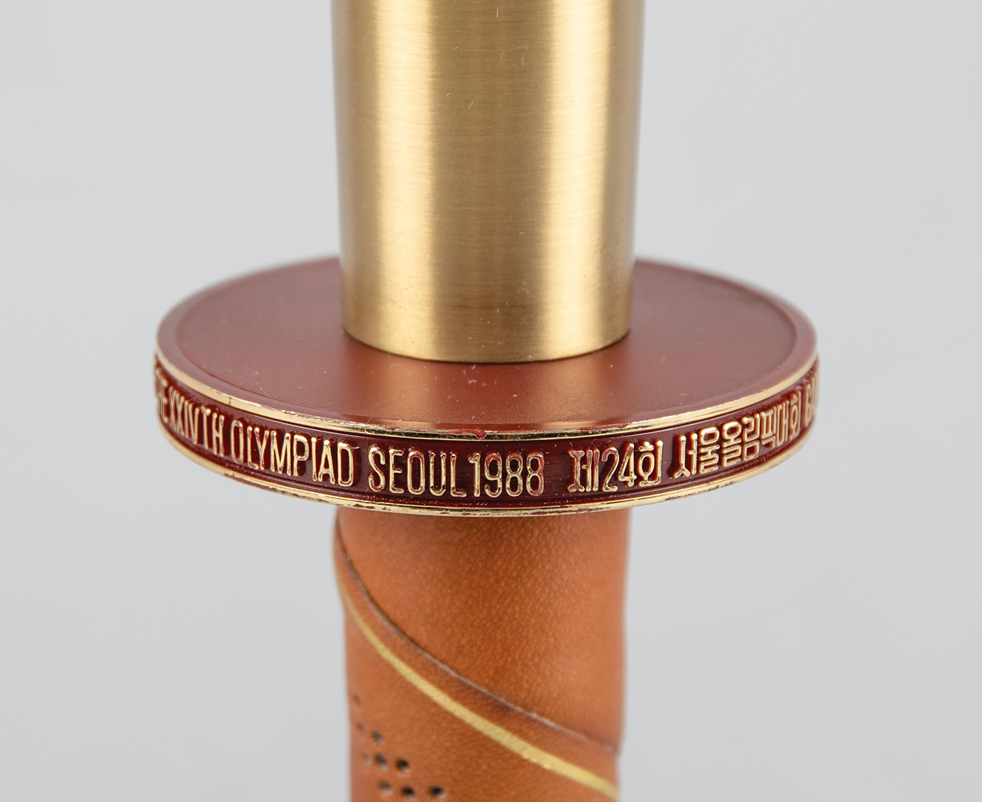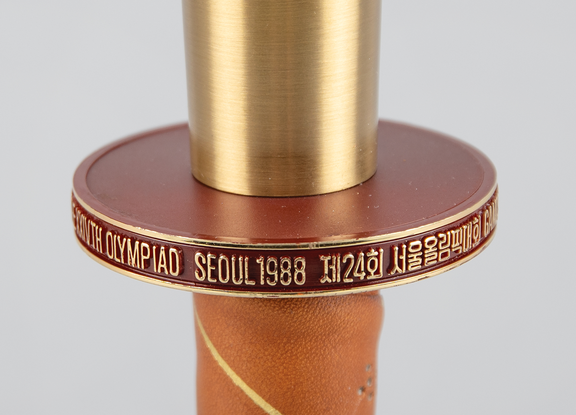 Beautifully designed official 1988 Seoul Olympics torch, constructed of metal, copper, leather, and plastic, measuring 20″ in length and 4″ at its widest point, designed by Lee Woo-Sung and manufactured by Korea Explosives Co. Ltd. The handle is wrapped in brown leather with a ring above, inscribed, "Games of the XXIVth Olympiad Seoul 1988," in English and Korean. The upper portion of the torch bears a colorful Olympic ring emblem and the top is engraved with an intricate dragon design symbolizing the harmony between East and West; based on the Chinese zodiac, the year 1988 was also the year of the dragon. The torch’s burner is absent, and the torch exhibits scattered light wear and scuffs to the body and leather. During the 22-day relay, the Olympic Flame traveled from the Greek capital of Athens to Korea's southernmost point, Jeju Island, before making its way north to Seoul in a 4,167 km relay.