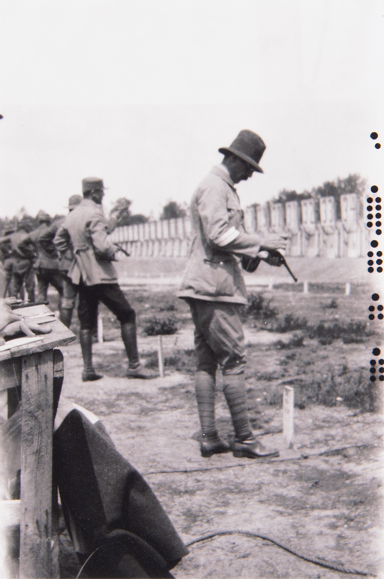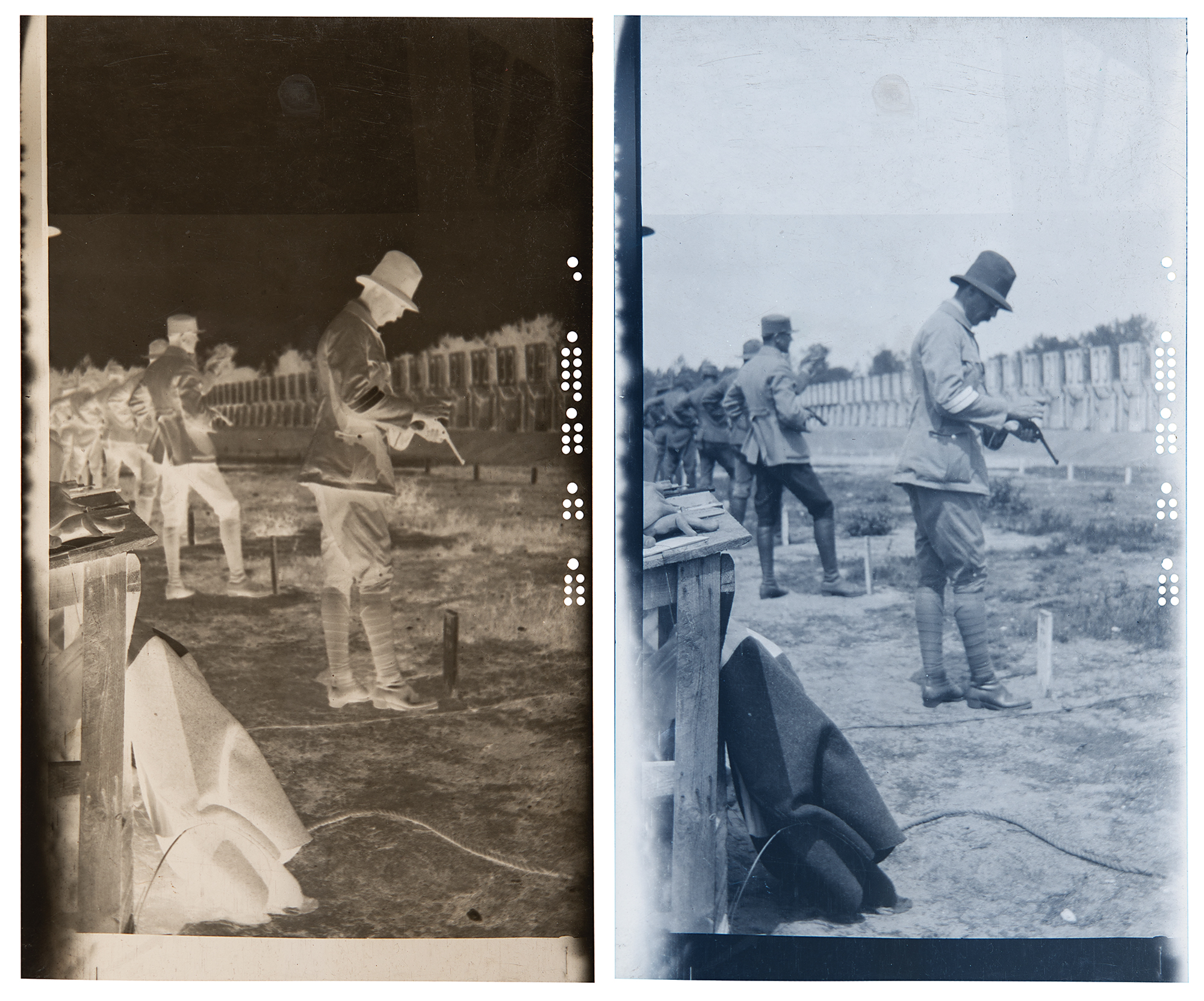 Scarce original Kodak photo negative of a shooting event at the Paris 1924 Summer Olympics, 2.5 x 4.25, picturing a competitor loading his pistol at his station, with several other competitors pictured to his left. The negative includes its original Kodak picture folder, as well as a modern print of the offered negative. In fine condition.