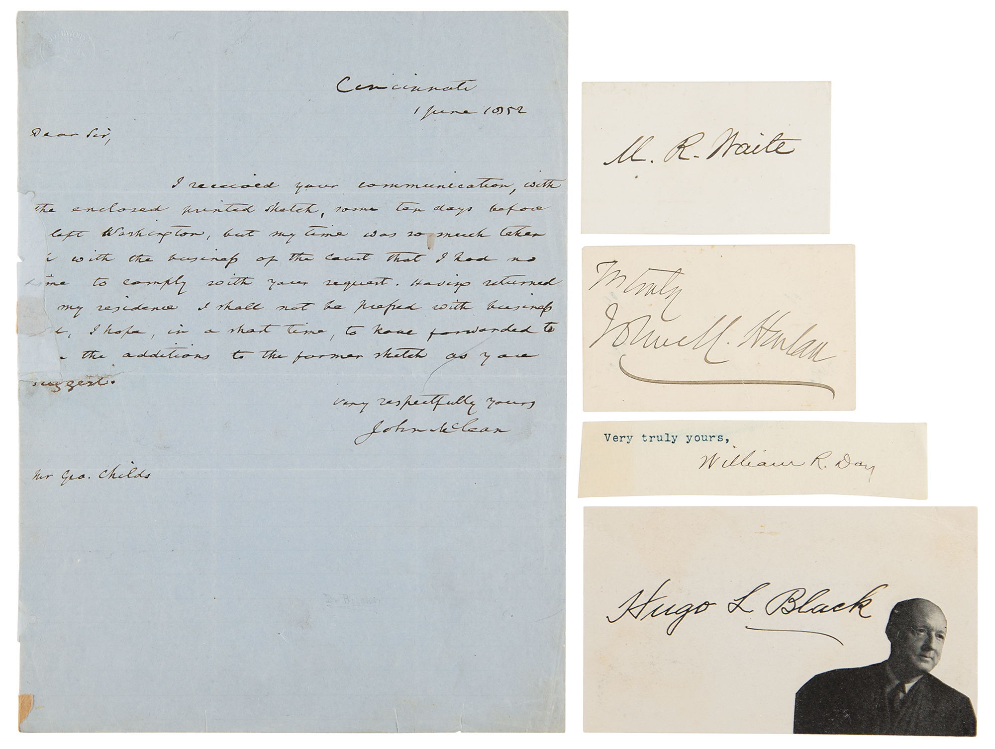 Five items signed by justices of the Supreme Court, including: John McLean (ALS), Morrison R. Waite (signature), John Marshall Harlan (signature), Hugo L. Black (signature), and William R. Day (signature). In overall very good to fine condition, with repaired loss to the left edge of the McLean letter (affecting some of the writing).