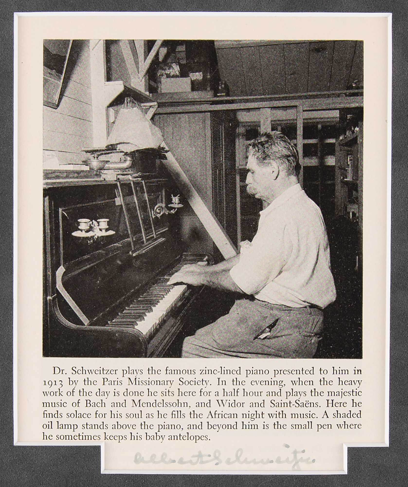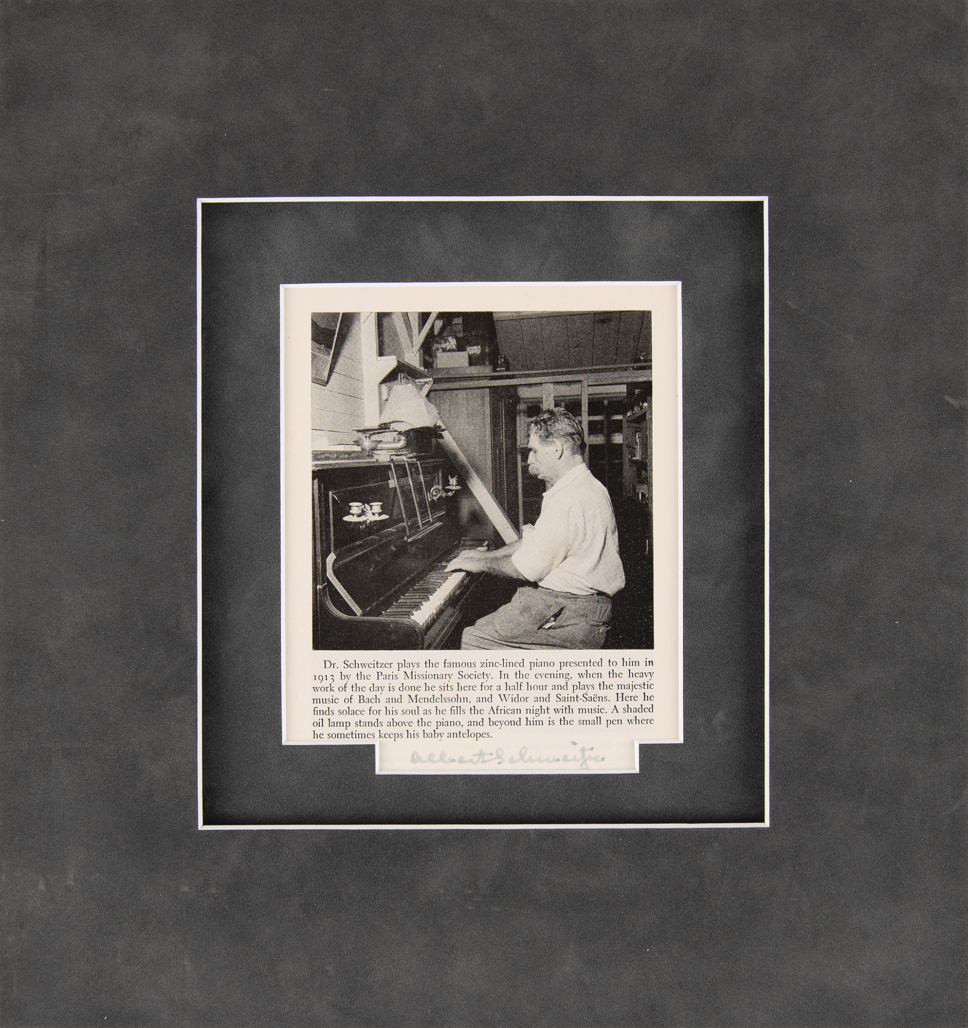 Theologian, humanitarian, and physician (1875–1965) remembered for establishing a hospital in Lambarene, Gabon, and for receiving the 1952 Nobel Peace Prize for his philosophy of 'Reverence for Life.' Book photo of Albert Schweitzer, 4.75 x 5.75, depicting him playing his famous zinc-lined piano, signed in ink. Double-matted to an overall size of 11.75 x 12.5. In fine condition, with a bit of light creasing.