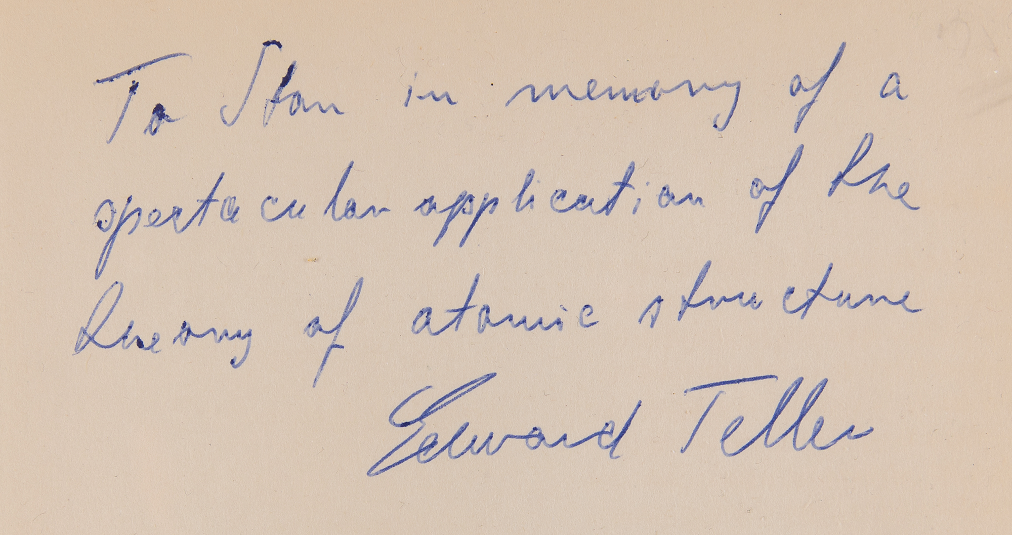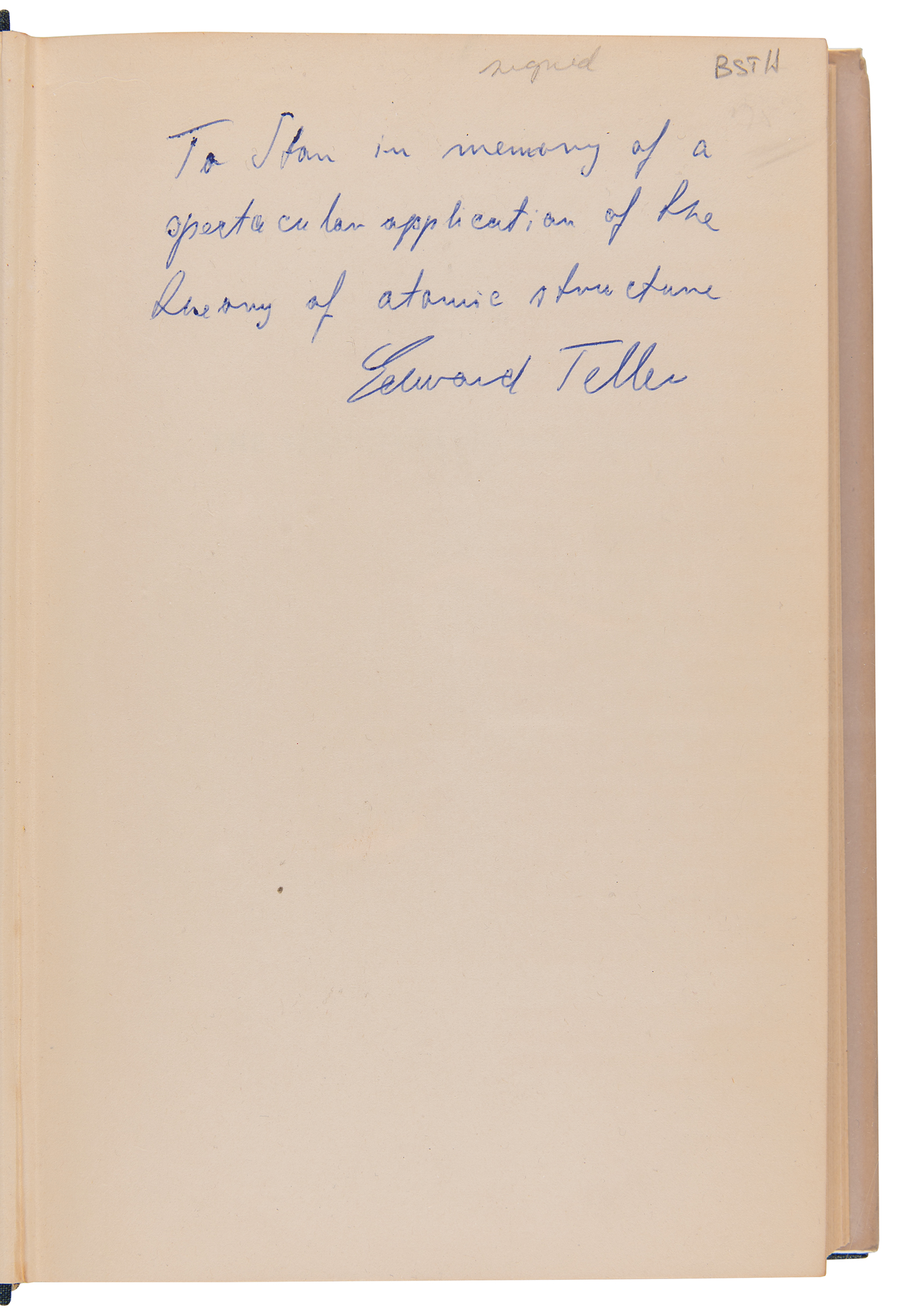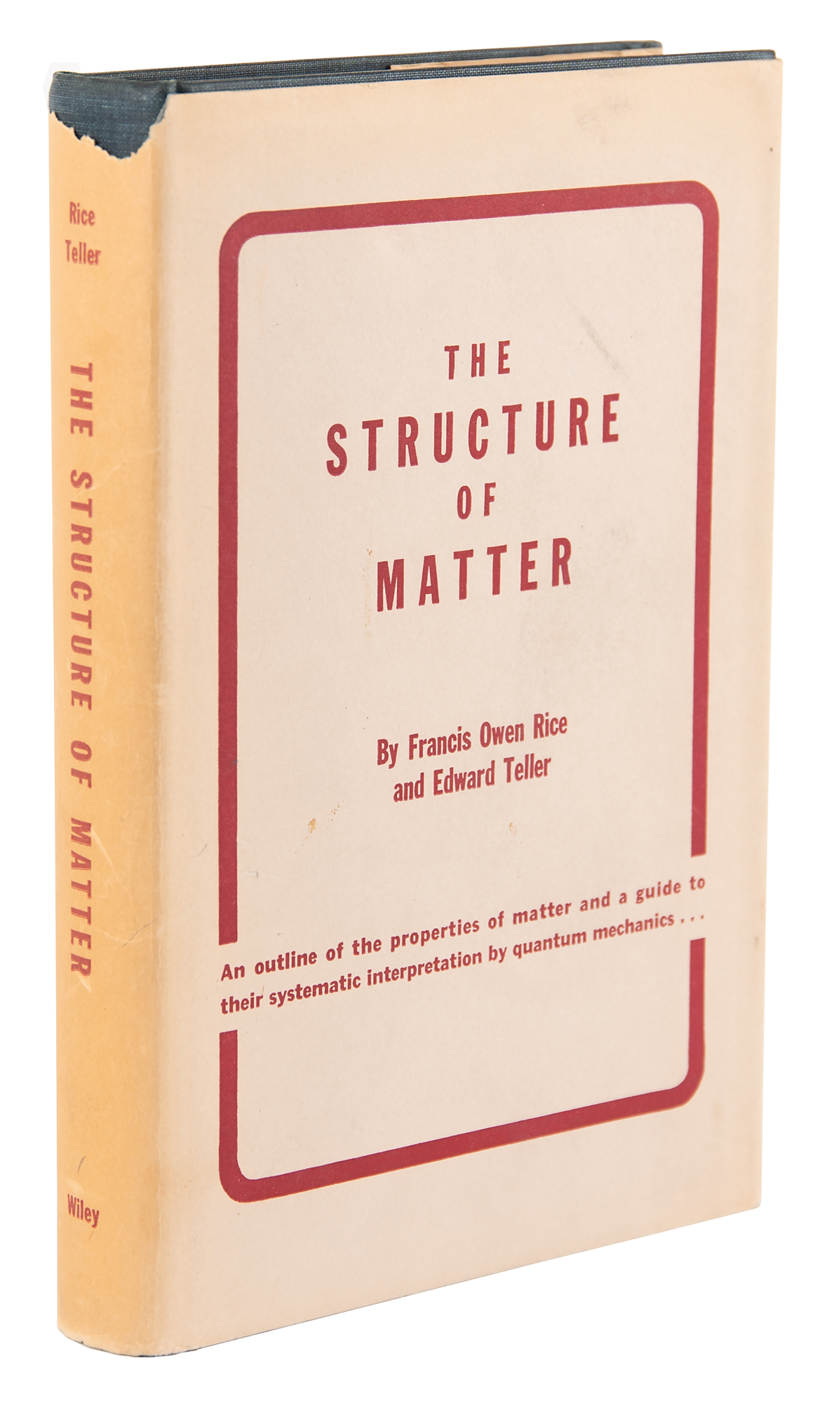 Signed book: The Structure of Matter. Later printing. NY: John Wiley & Sons, 1949. Hardcover with dust jacket, 6.25 x 9.25, 361 pages. Signed and inscribed on the first free end page in blue ballpoint, "To Stan, in memory of a spectacular application of the theory of atomic structure, Edward Teller." In fine condition, with paper loss to the head of the lightly sunned dust jacket spine.