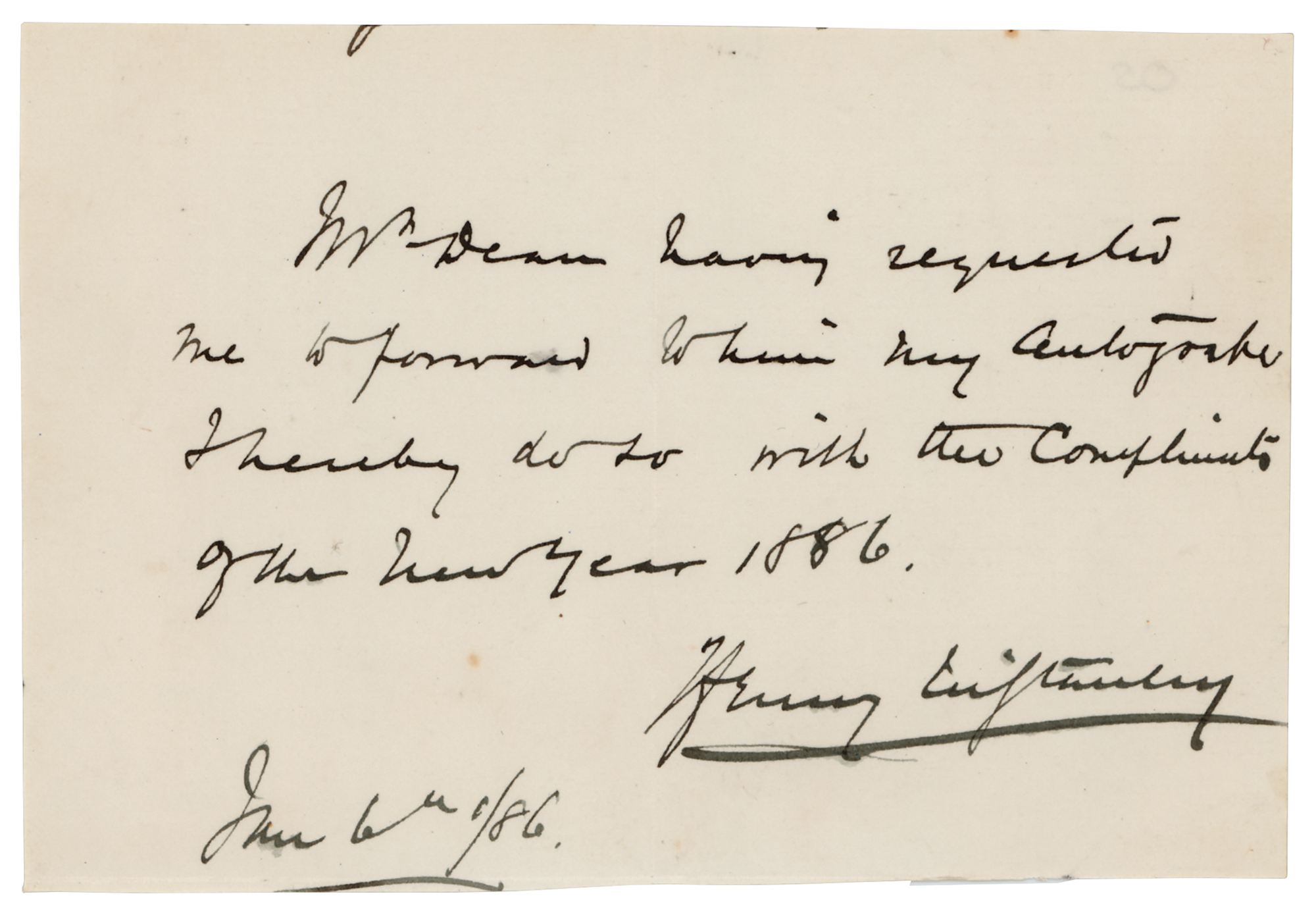 Author, explorer, and special correspondent for the New York Herald (1841–1904), most famous for his inquiry, ‘Dr. Livingstone, I presume?,’ upon finding David Livingstone, a fellow explorer who had become lost in the wilds of Africa. ANS, one page, 5 x 3.5, January 6, 1886. Handwritten note from Henry M. Stanley: "Mr. Dean having requested me to forward to him my autograph I hereby do so with the compliments of the New Year 1886." In fine condition.