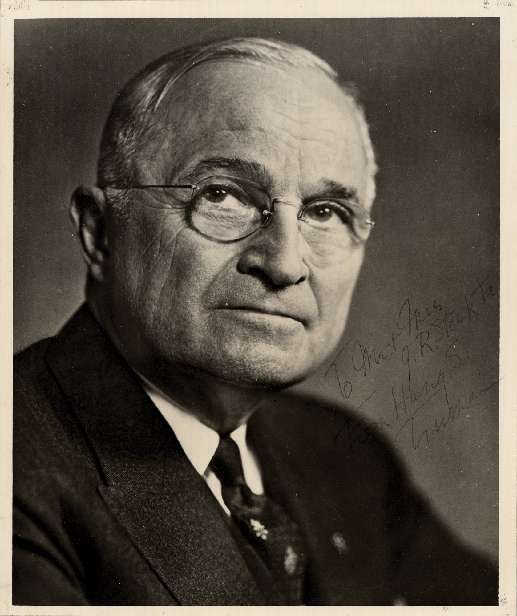 Vintage matte-finish 8 x 10 portrait photo of Harry Truman, signed and inscribed in black ballpoint, "To Mr. & Mrs. J. R. Stockton, from Harry S. Truman.” In very fine condition.