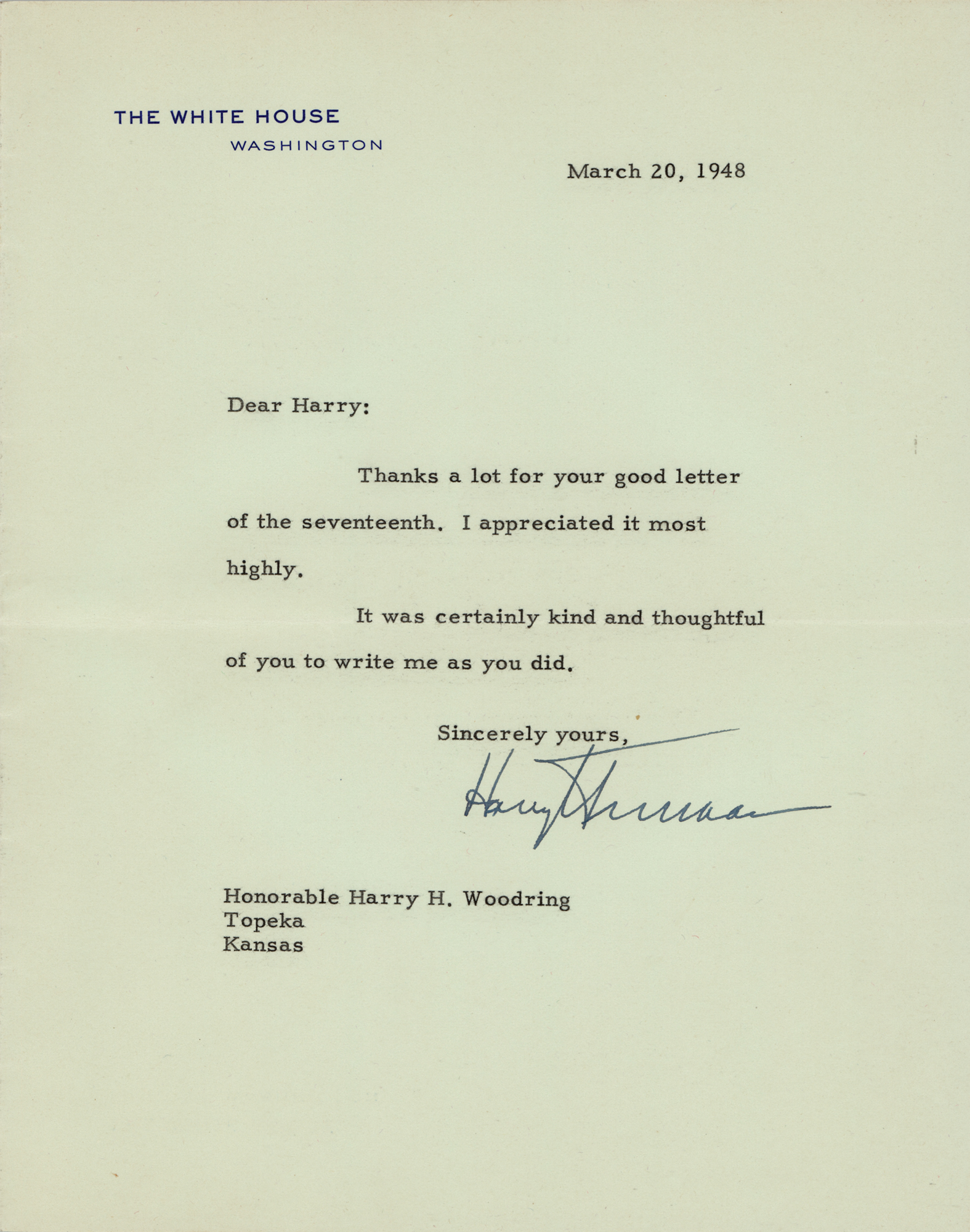 TLS as president, one page, 7 x 8.75, White House letterhead, March 20, 1948. Letter to former Secretary of War Harry Hines Woodring, in full: “Thanks a lot for your letter of the seventeenth. I appreciated it most highly. It was certainly kind and thoughtful of you to write me as you did.” In very fine condition.