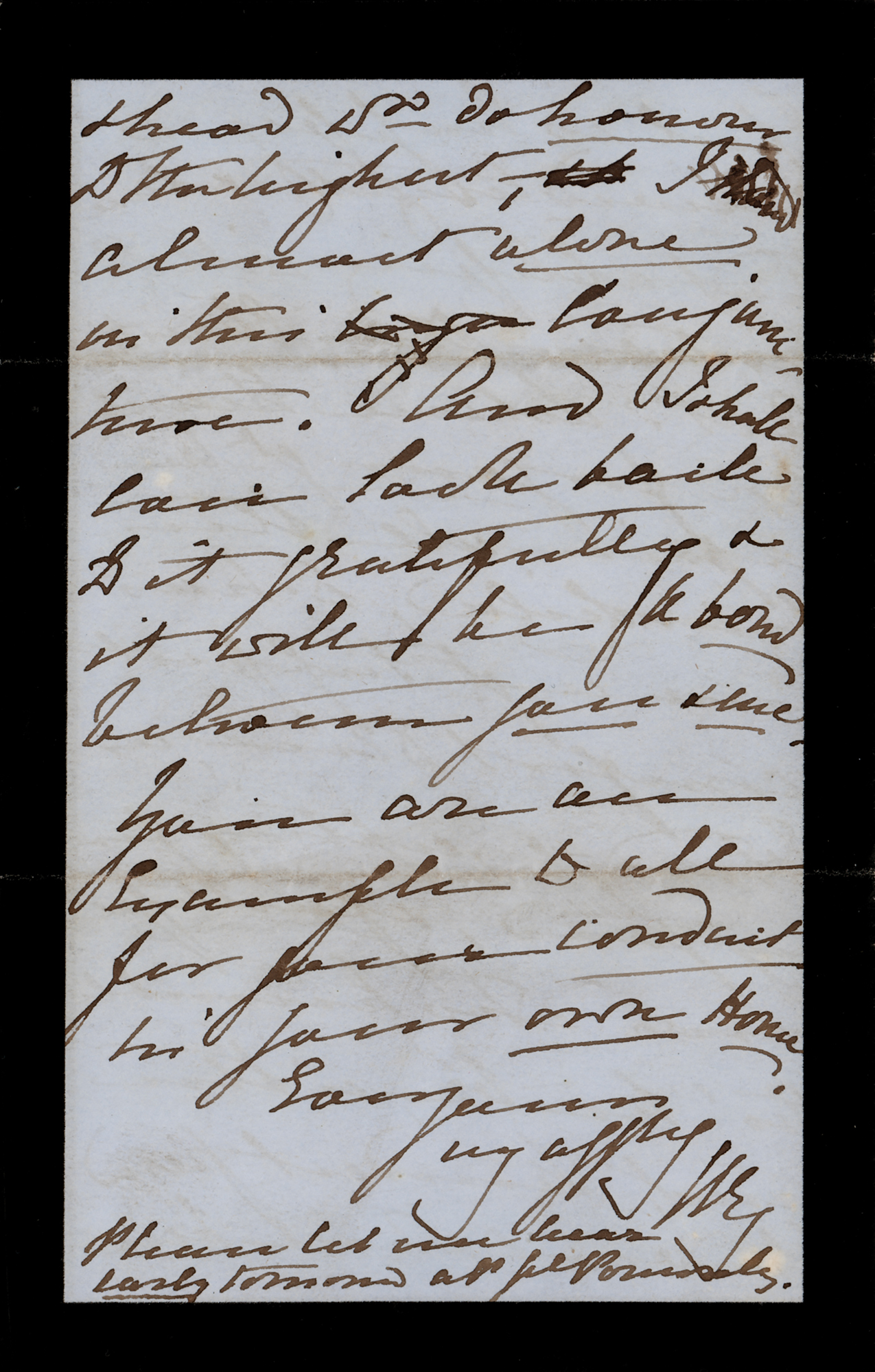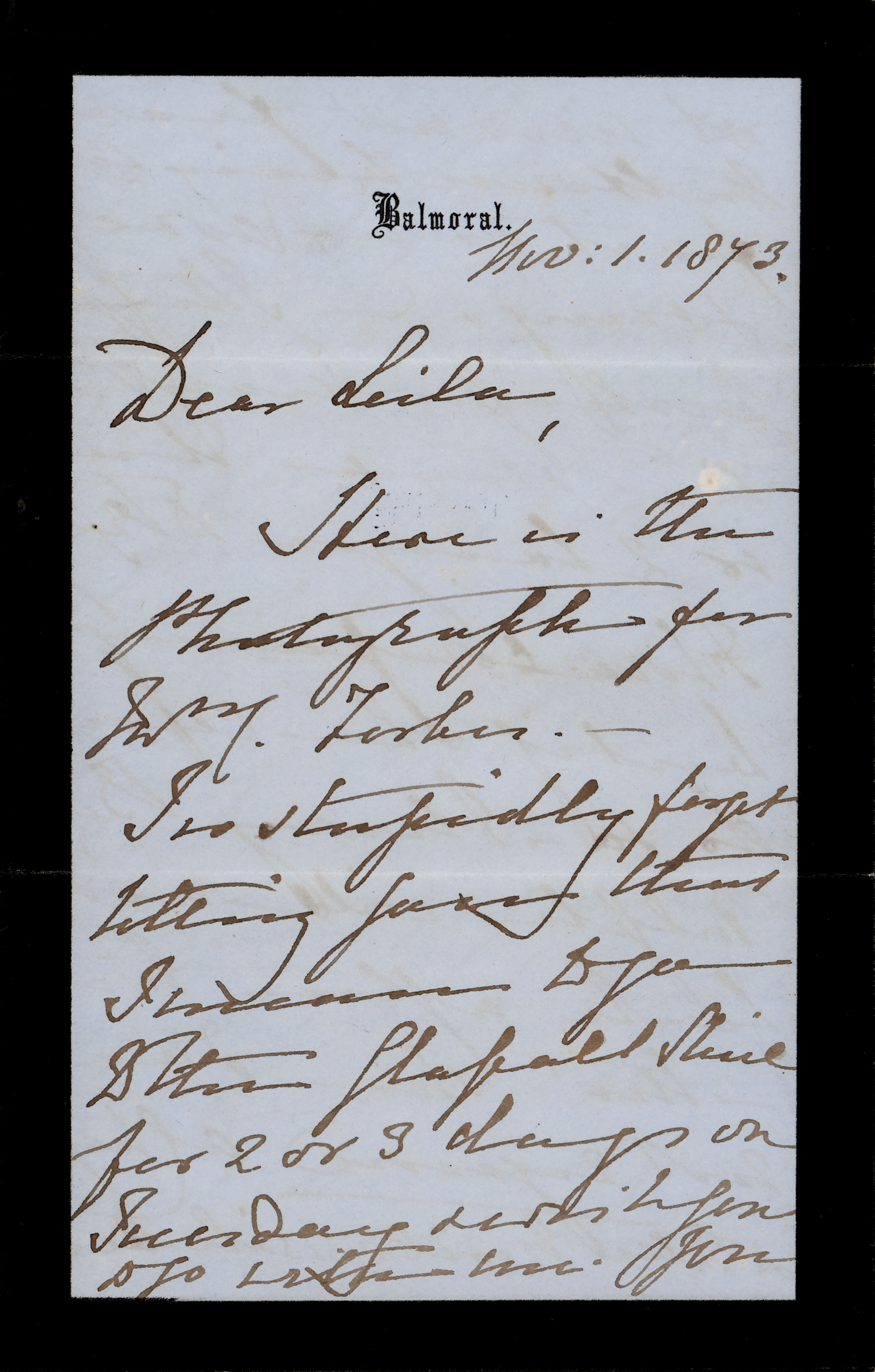 ALS signed “VR,” four pages on two adjoining sheets, 4.5 x 7, black-bordered Balmoral letterhead, November 1, 1873. Handwritten letter to “Leila,” the Countess of Erroll Eliza Hay, who held the office of Lady of the Bedchamber to HM Queen Victoria. The letter, penned in her difficult-to-decipher hand, reads, in part: “Here is the photograph for…Forbes.—I so stupidly forget telling you that I mean to go to the Glassalt Shiel for 2 or 3 days on Tuesday & wish you to go with me. You need not fear the house being cold for it is very cozy and snug…I feel so happy & relieved tonight & sure that a blessing will rest on this Christian act. Let me thank you for your gt kindness in all this, dear Leila. It has been a gt. support & comfort to me, as I stand—excepting for my good, & faithful [John] Brown, who honorable tho' he be, is the truest, kindest friend I have—& whose heart & head w'd do honour to the highest. I am almost alone in this…time. And I shall look back to it gratefully & it will be a bond between you & me. You are an example to all for your conduct in your own home." The queen adds a brief line at the end: "Please let me hear early tomorrow." In fine condition.