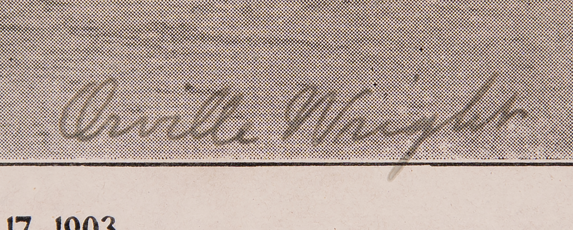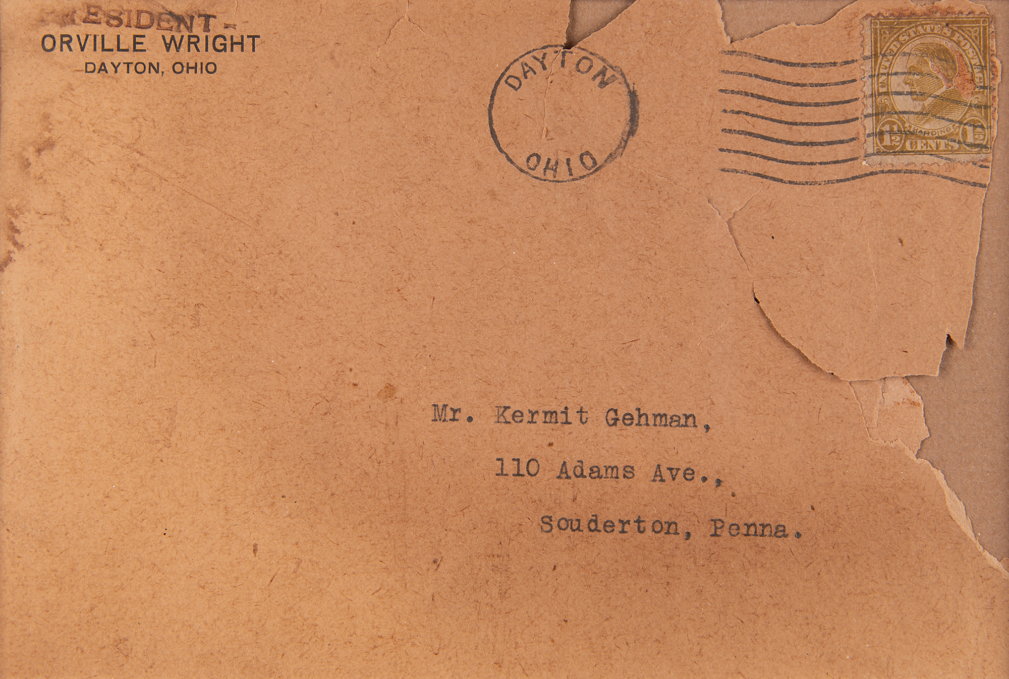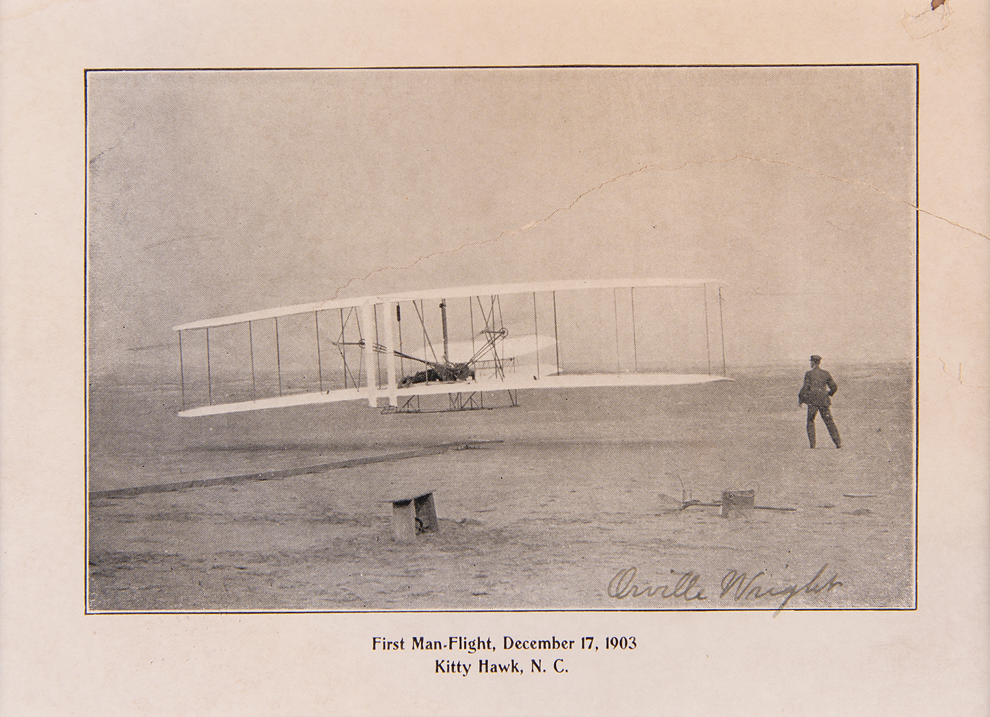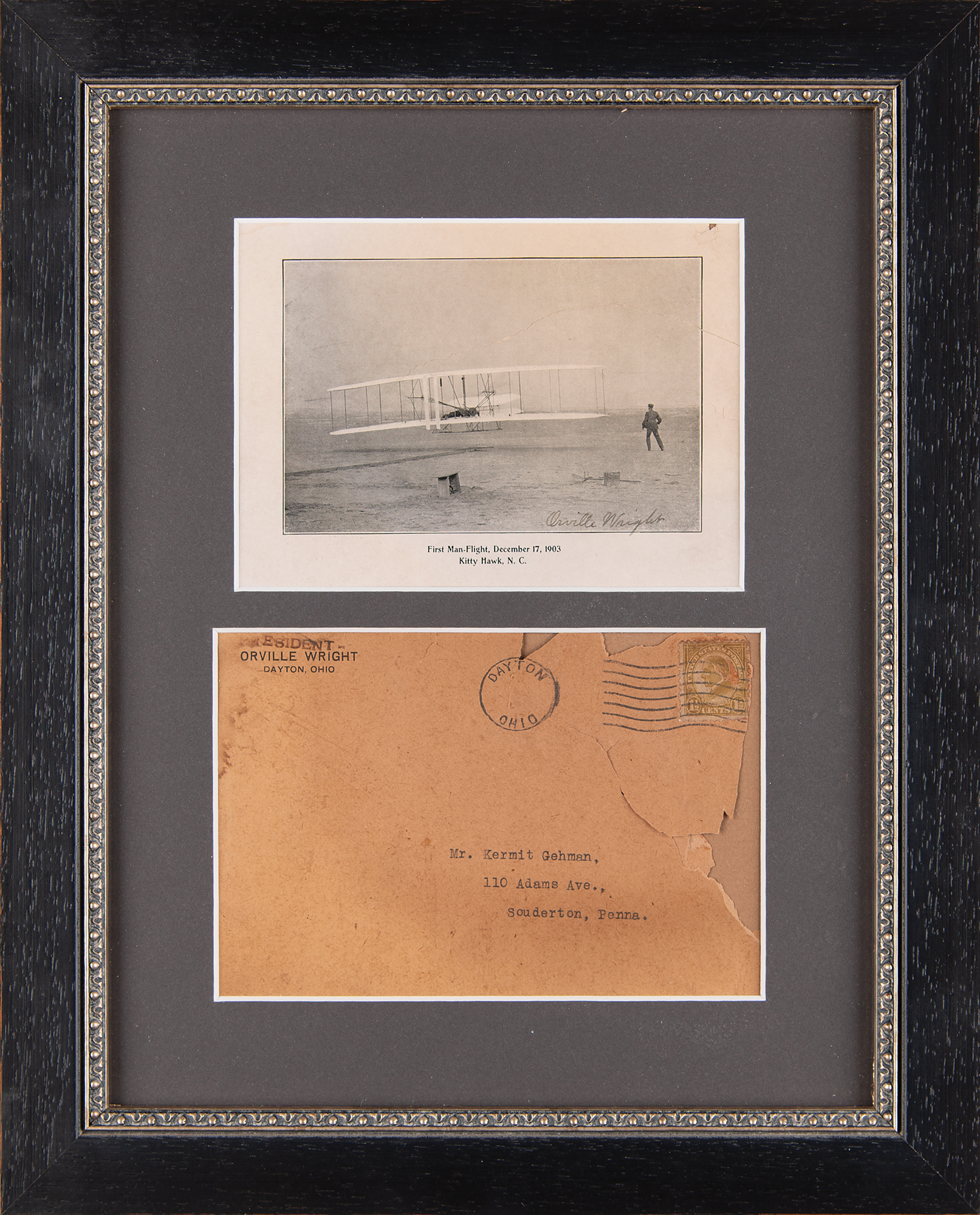 Iconic 6 x 4.25 cardstock photo of the Wright Brothers’ first flight, captioned at the bottom "First Man-Flight, December 17, 1903, Kitty Hawk, N. C.," signed in the lower right in fountain pen by Orville Wright. Matted with its original mailing envelope from Wright, with the return address field stamped “President.” Both are framed together to an overall size of 11.75 x 14.5. In fine condition, with an unobtrusive crease passing across the sky in the image. Accompanied by a full letter of authenticity from JSA.