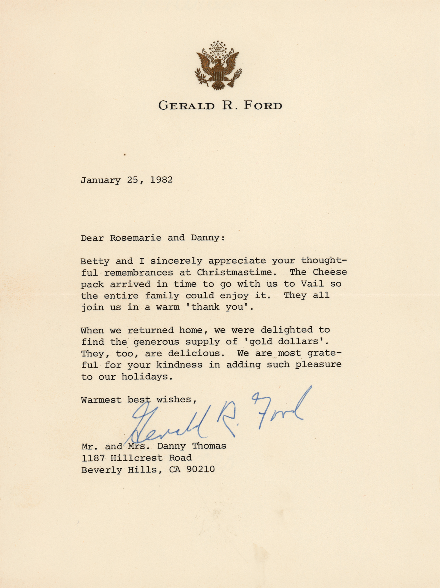 TLS signed "Gerald R. Ford," one page, 6.25 x 8.5, personal letterhead, January 25, 1982. Letter of thanks to Danny Thomas for a sent gift. In part: "Betty and I sincerely appreciate your thoughtful remembrances at Christmastime. The Cheese pack arrived in time to go with us to Vail so the entire family could enjoy it. They all join us in a warm 'thank you.'" In fine condition. Accompanied by the original mailing envelope, bearing a pre-printed free frank.