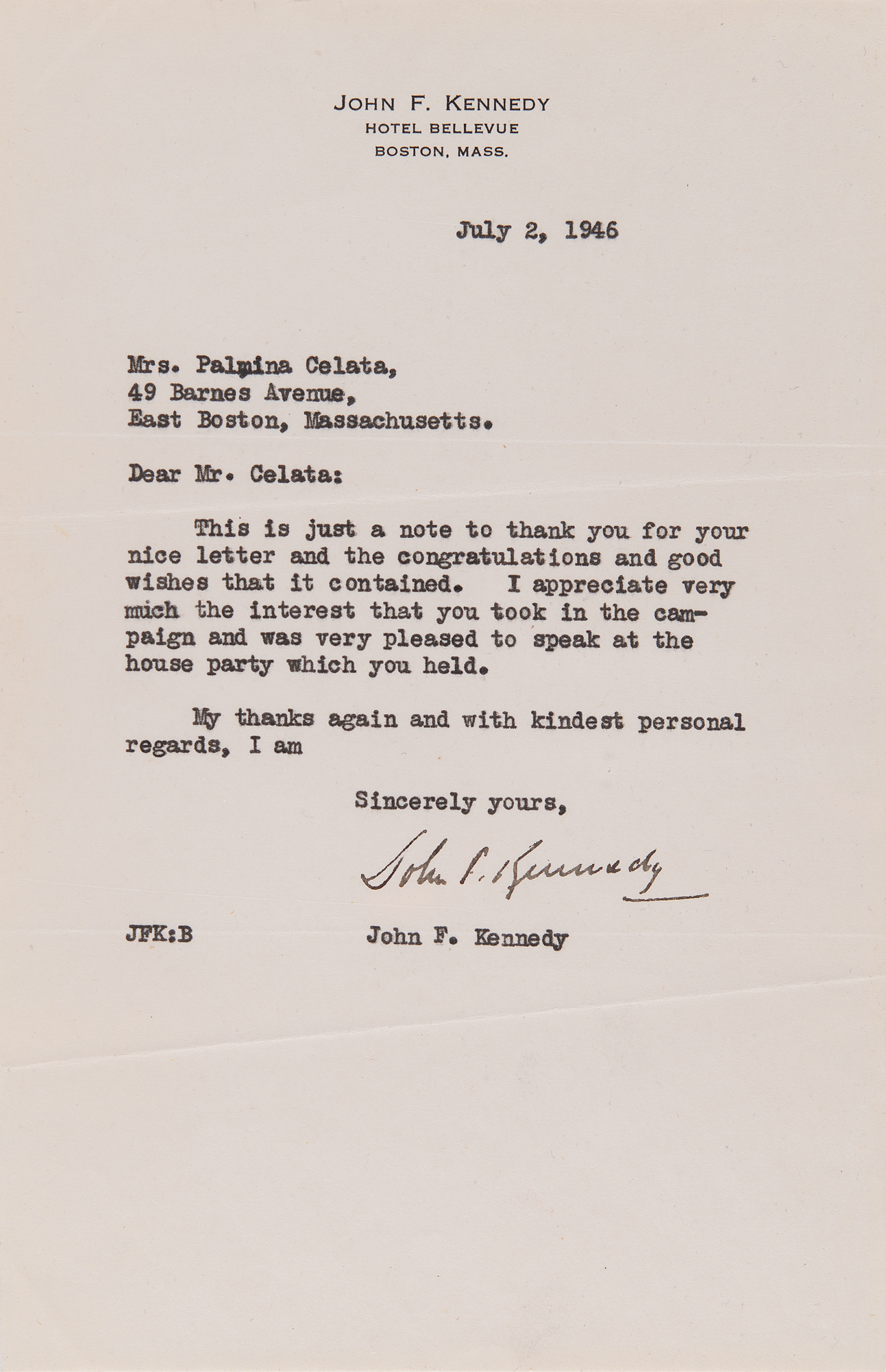 Following his stint as a foreign correspondent with Hearst Newspapers, Kennedy returned to America and stayed at the Hotel Bellevue in Boston where his grandfather John F. Fitzgerald, former Boston Mayor and U.S. Congressmen, was spending his retirement. When Kennedy decided to run for Congress in April 1946, his father rented a two-room suite for him at the hotel so he had an official residence in the Congressional district. With the support of his grandfather—and the family name—JFK was elected to Congress as a representative for Massachusetts's 11th district on November 5, 1946, and would take his seat in the House of Representatives on January 3, 1947. An early letter from the aspiring politician.