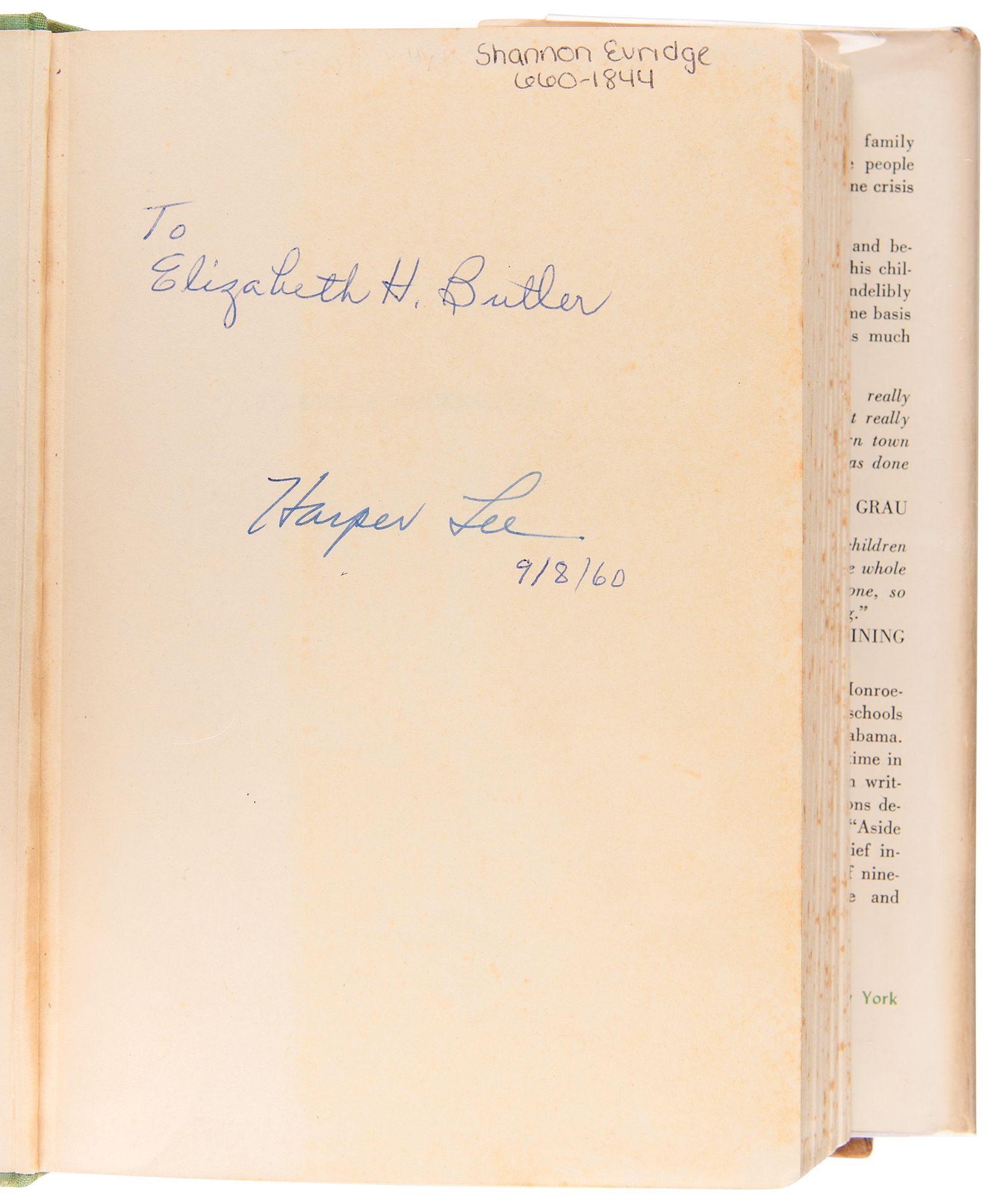 Signed book: To Kill a Mockingbird. First edition, fourth impression. Philadelphia & New York: J. B. Lippincott Company, 1960. Hardcover (brown boards and light green cloth spine with brown titles) with 'Fourth Printing' dust jacket, 5.75 x 8.25, 296 pages. Signed on the first free-end page in ink by Harper Lee, with another hand adding an inscription and date, "9/8/60." Autographic condition: fine, with light toning over the right half of the signed page. Book condition: VG-/VG-, with foxing to textblock edges, a cocked spine, and some wear, scuffing, and edge nicks to the dust jacket.