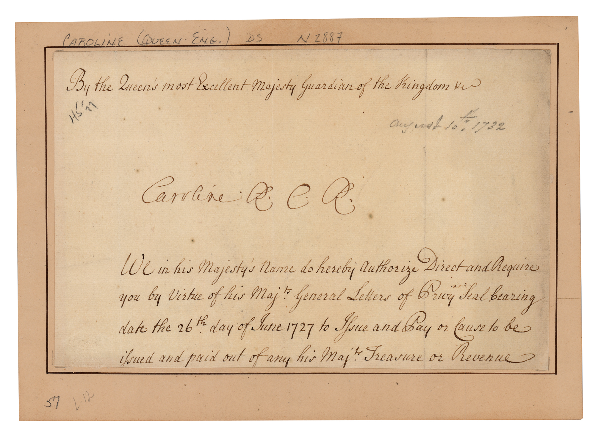 Queen of Great Britain and Ireland as the wife of King George II, known for her political influence (1683–1737). Manuscript DS, signed “Caroline R.C.R.,” one page, 8 x 5, no date [but with a later pencil notation of August 10, 1732]. Partial pay warrant ordering that a sum be "issued and paid out of any his Maj'ts Treasure or Revenue," signed at the head in ink by Caroline. Inlaid into a slightly larger sheet and in fine condition.