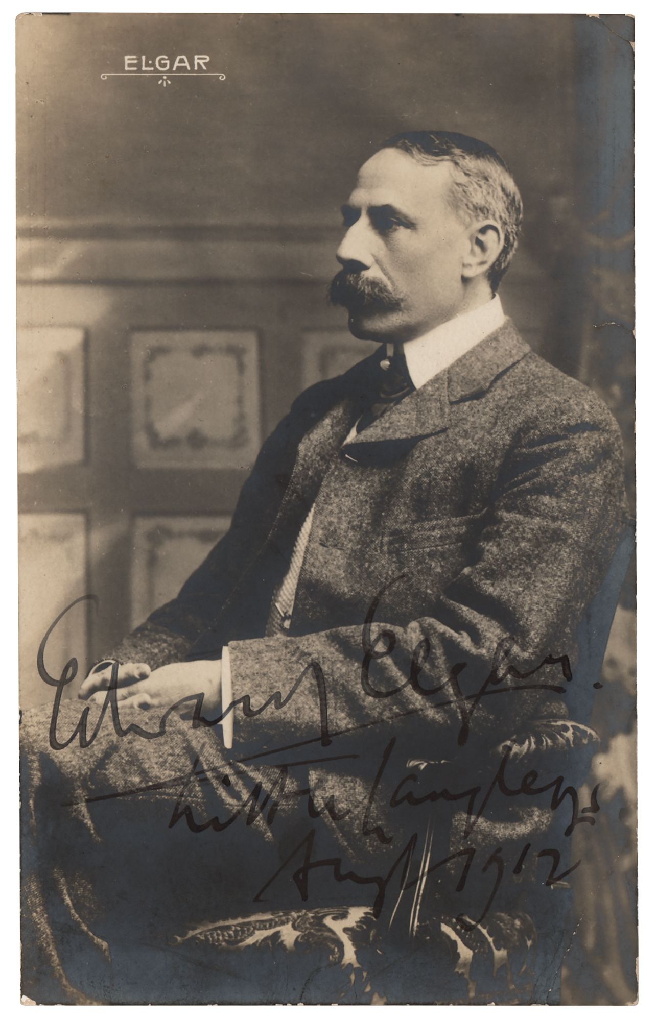 Scarce vintage matte-finish 3.25 x 5.25 postcard photo of Edward Elgar in a handsome seated pose, signed in fountain pen by the composer, adding the date of August 1912. In very good to fine condition, with a small corner crease, light silvering, and poor-to-moderate handwriting contrast.