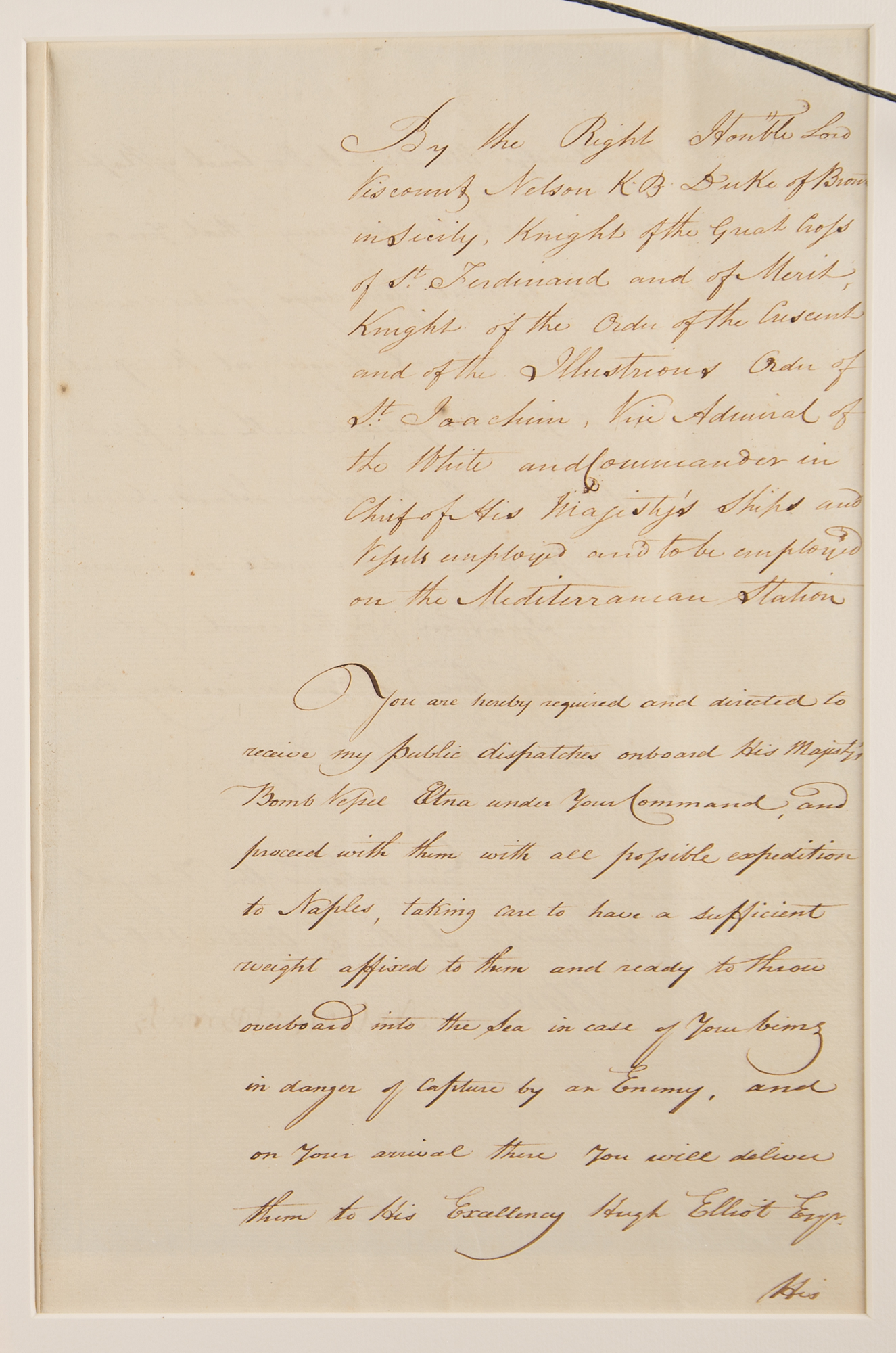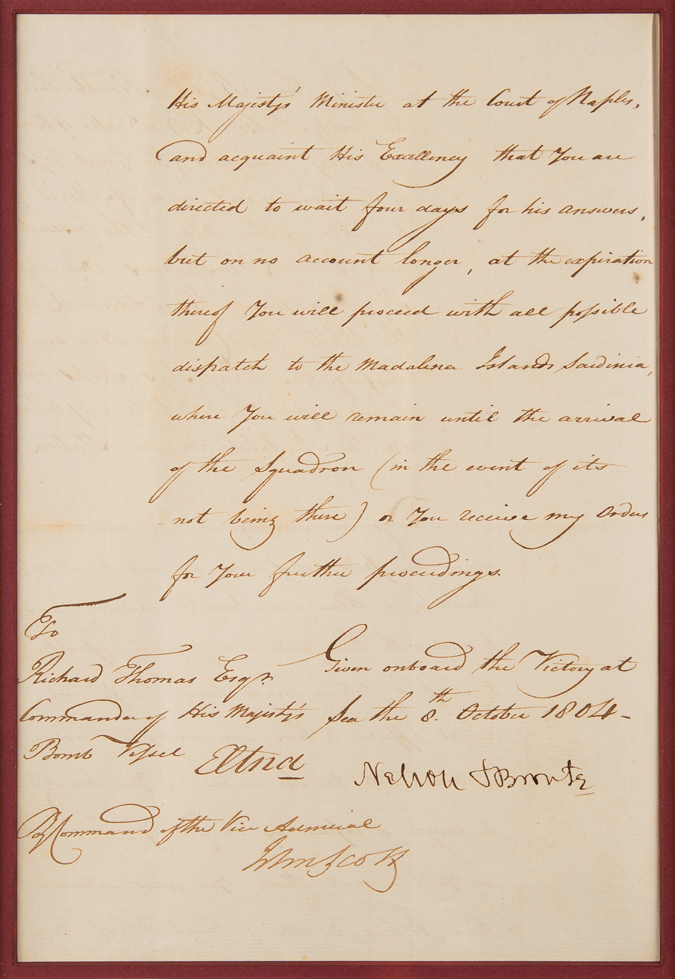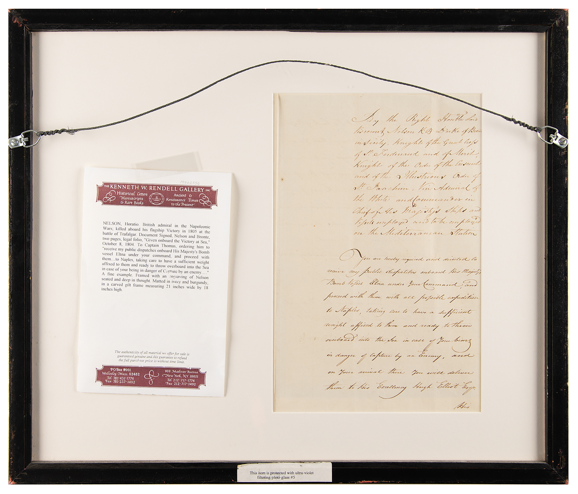 LS signed “Nelson & Bronte,” one page both sides, 7.75 x 11.25, October 8, 1804. Letter to "Captain Richard Thomas Esqr., Commander of His Majesty's Bomb Vessel Etna," sent from "onboard the Victory at Sea." In part: "You are hereby required and directed to receive my public dispatches onboard His Majesty's Bomb Vessel Etna under your Command, and proceed with them with all possible expedition to Naples, taking care to have a sufficient weight affixed to them and ready to throw overboard into the sea in case of your being in danger of capture by an Enemy, and on your arrival there you will deliver them to His Excellency Hugh Elliot Esqr., His Majesty's Minister at the Court of Naples, and acquaint His Excellency that you are directed to wait four days for his answers." Handsomely double-matted and framed with an engraved portrait of Lord Nelson to an overall size of 21 x 18, with a window in the backing for viewing the reverse. In fine condition. A fantastic letter signed onboard Nelson's flagship, the HMS Victory, regarding secretive diplomatic correspondence amidst the Napoleonic Wars.