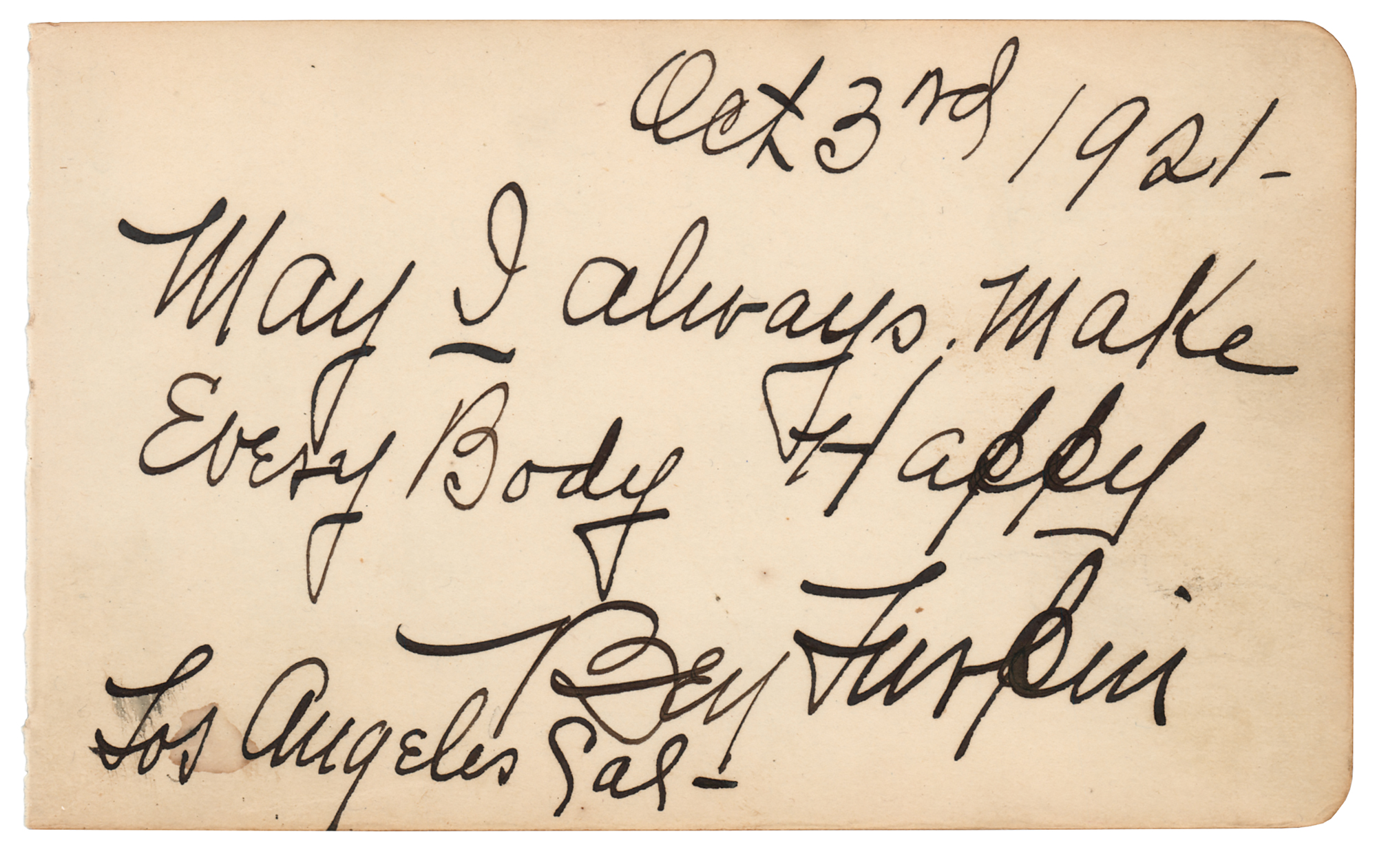 Vintage fountain pen signature, "Oct 3rd 1921, May I always make every body happy, Ben Turpin, Los Angeles, Cal.,” on an off-white 5.75 x 3.5 album page. In fine condition.
