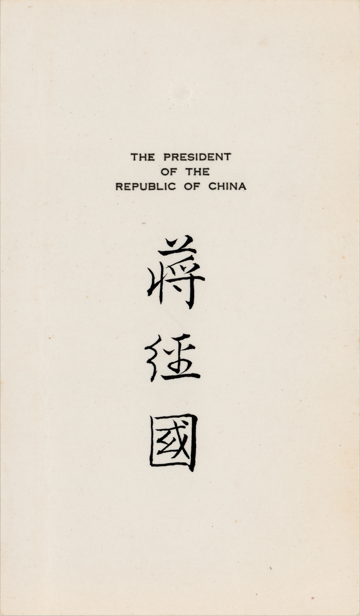 Chinese leader (1910-1988) and son of Chiang Kai-shek, who succeeded his father as premier and president of China, serving until his death. Ink signature in Chinese on an off-white 3.75 x 6.5 card with raised lettering, “The President of the Republic of China,” below an embossed sun. In fine condition. Accompanied by its original 1985 transmittal letter from The Office of the President of the Republic of China.