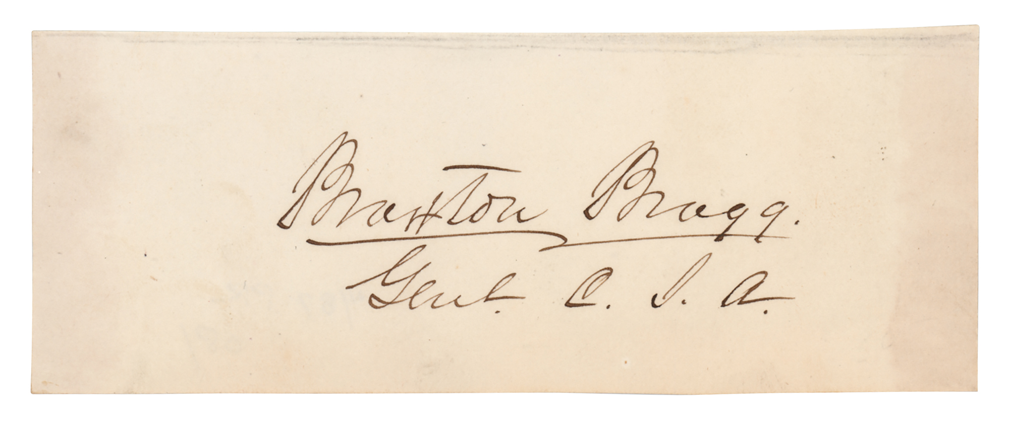Confederate general (1817-1876) who was relieved of field duty after his unsuccessful siege of Chattanooga. His mixed legacy as a skilled organizer but a poor commander remains one of the great topics of debate among Civil War historians. Ink signature, "Braxton Bragg, Genl C.S.A.," on an off-white 4.75 x 1.75 slip. In fine condition.