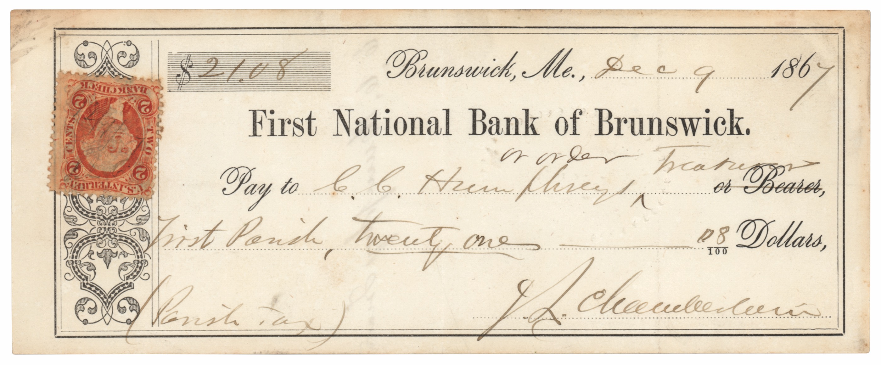 Maine-born Union major general (1828-1914) who was awarded the Congressional Medal of Honor for his defense of Little Round Top at Gettysburg. First National Bank of Brunswick check, 7 x 2.75, filled out and signed by Chamberlain, "J. L. Chamberlain," payable to C. C. Humphreys for $21.08, December 9, 1867. Chamberlain notes that the payment is for a "Parish tax" in the lower left. In fine condition. Accompanied by a full letter of authenticity from PSA/DNA.