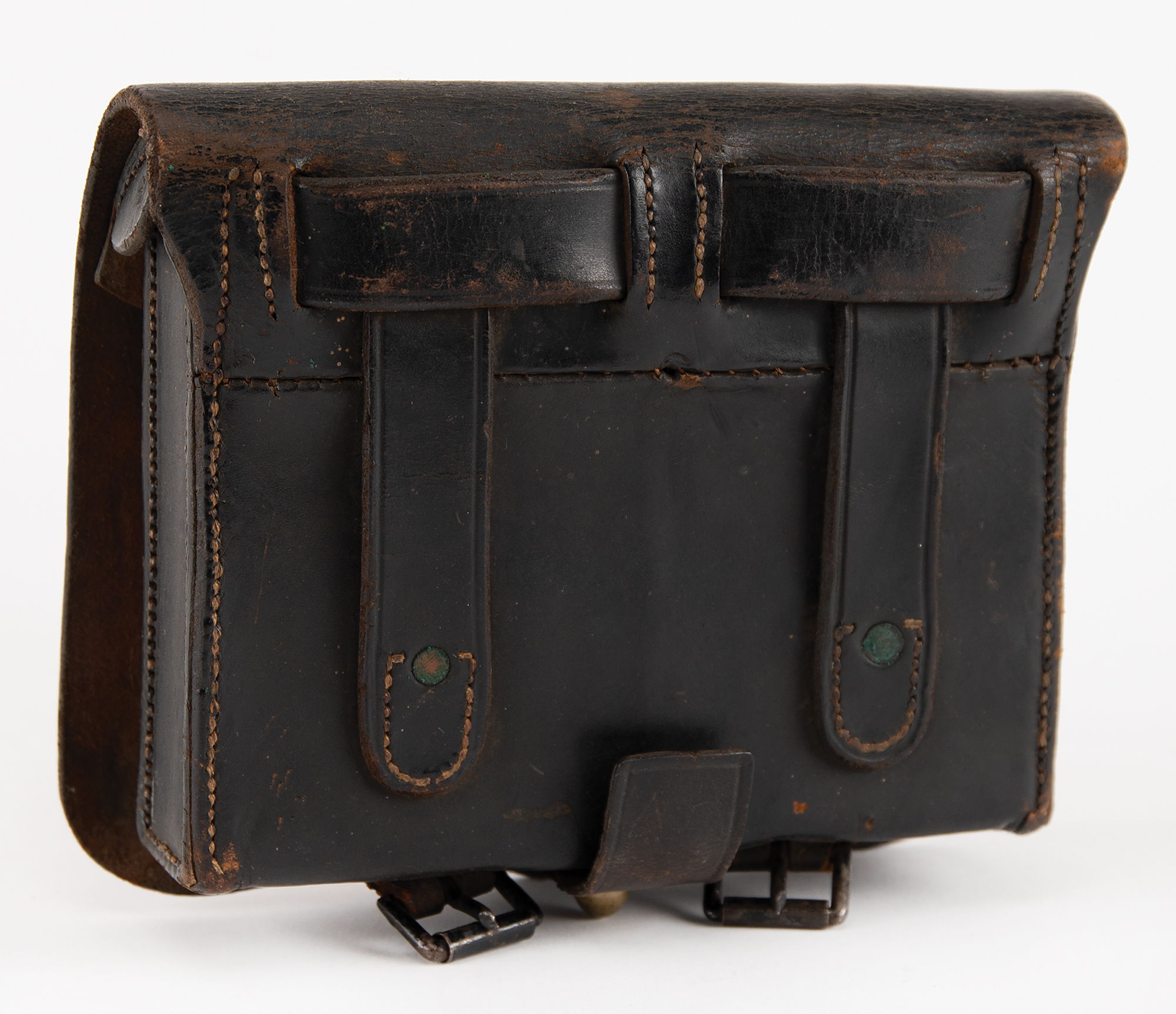 A black bridle leather Civil War US 1st 1864 Pattern .58 Caliber Cartridge Box with oval “US” plate, and a partially legible contractor stamp on the inner flap: “(---) / [SPRING]F'LD MASS.” The exterior leather exhibits light-moderate surface crazing, especially along the flex points, on the lightly worn edges of the cover, and on the closure tab. The belt loops are intact, and the japanned shoulder strap buckles are both present and in very good condition. The interior leather is in fine shape, although there is uniform crackling along the surface of the inner flap, and the tin inserts are both in excellent condition. The die-struck, lead-filled box plate has a mostly dark ochre patina with slightly dented edges and one detached iron attachment loop. The plate has an old collection tag that reads “Found at Mule Shoe Salient” (Battle of Spotsylvania Courthouse). This is a very nice late-war US cartridge box, and rates very good to fine overall condition.